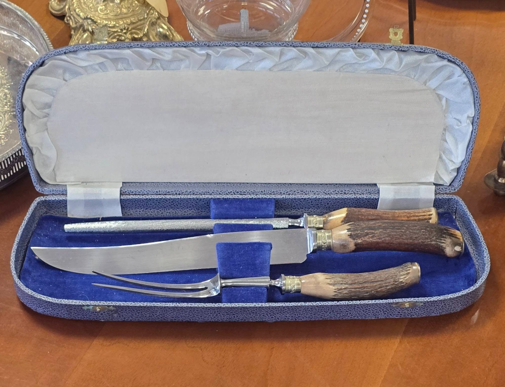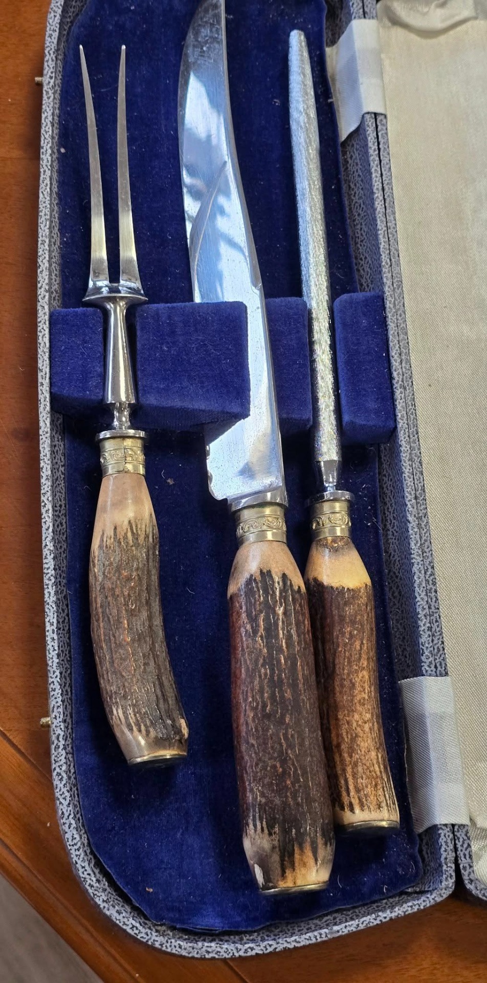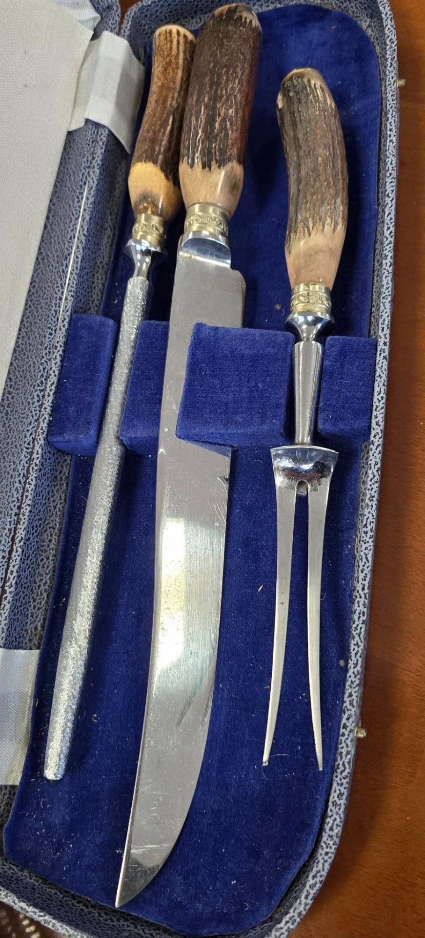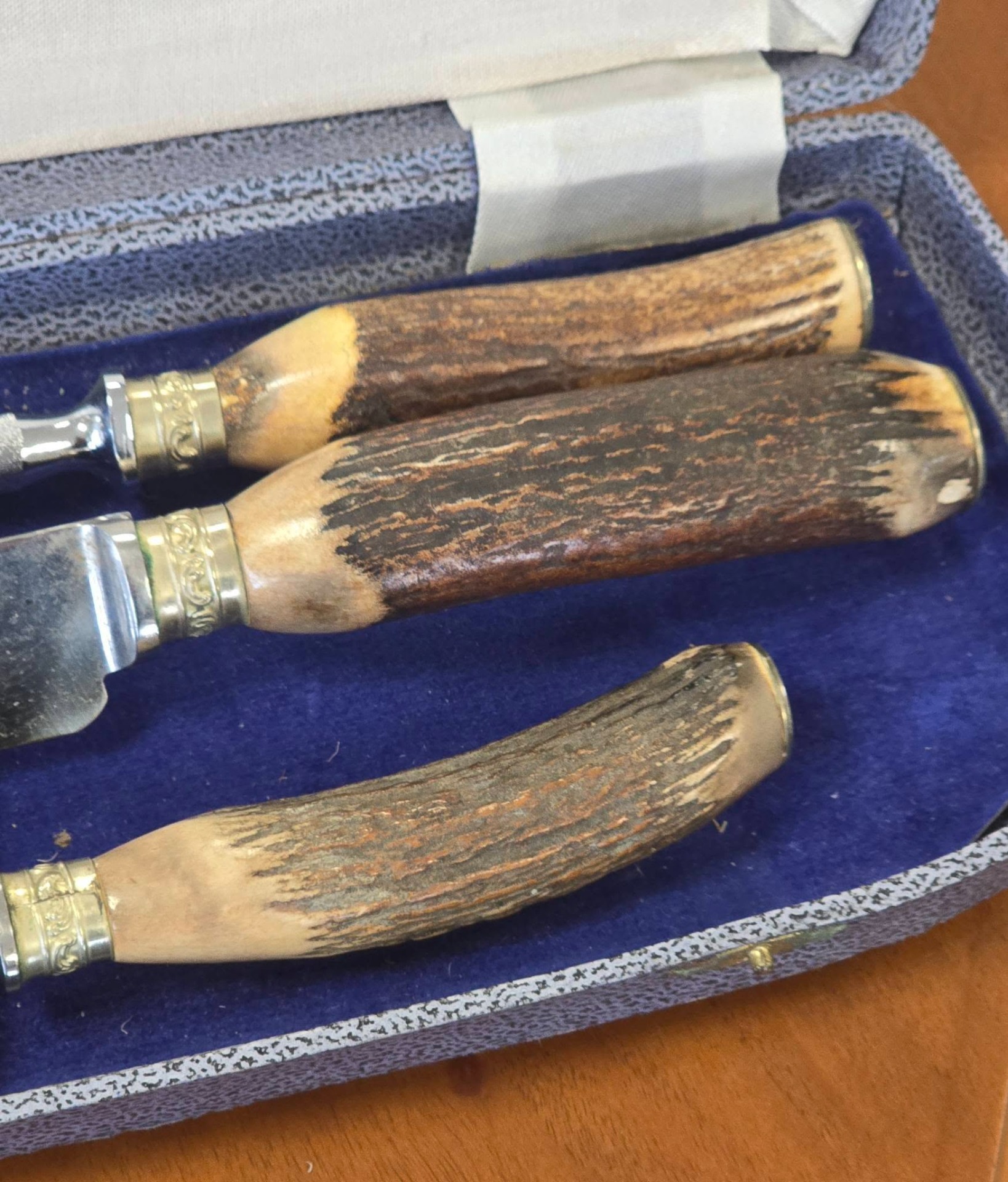 Set pentru porționare vintage, de colecție, compus din trei piese, cuțit, furculiță și tijă de ascuțit, din oțel inoxidabil cu mânere din corn de cerb,