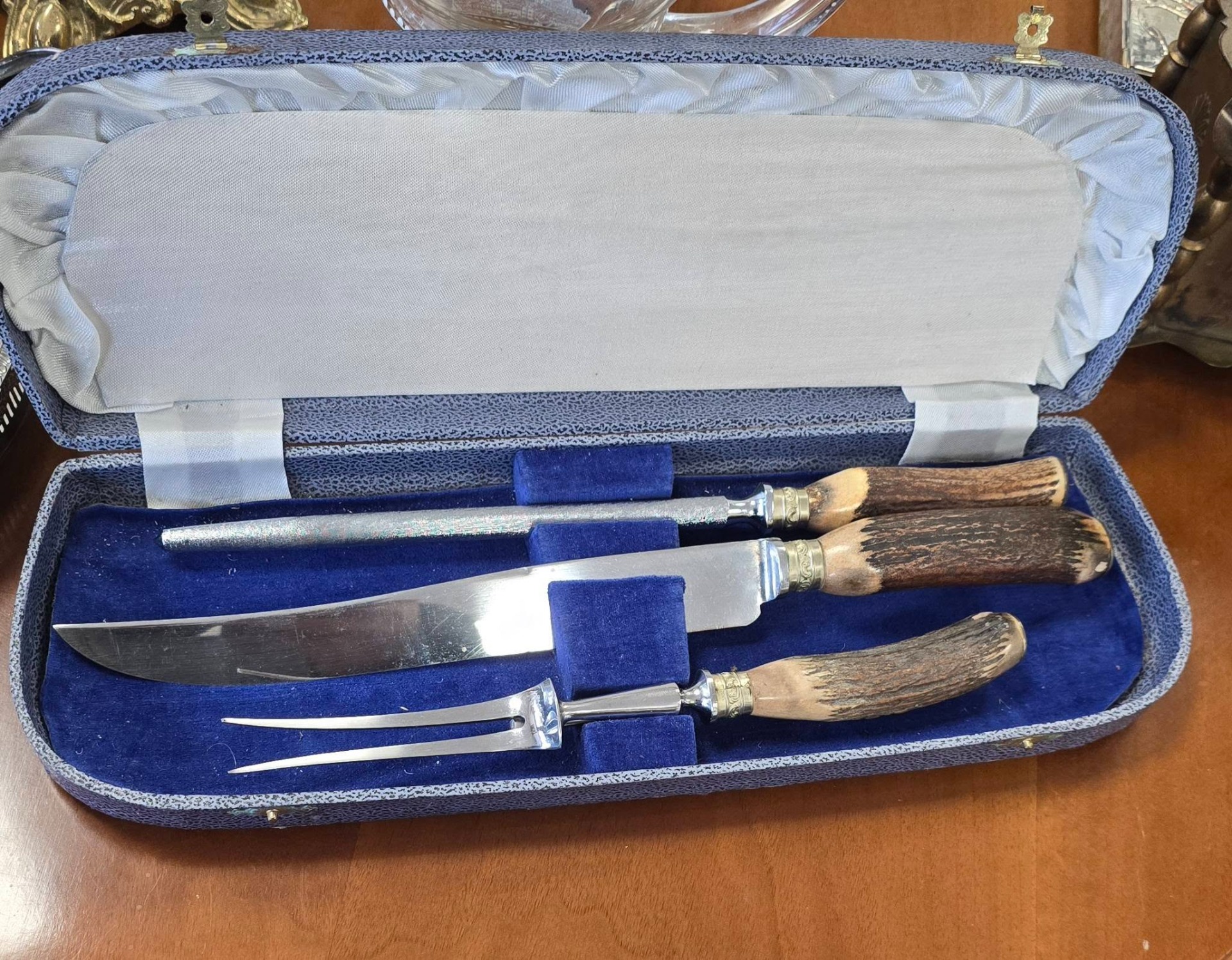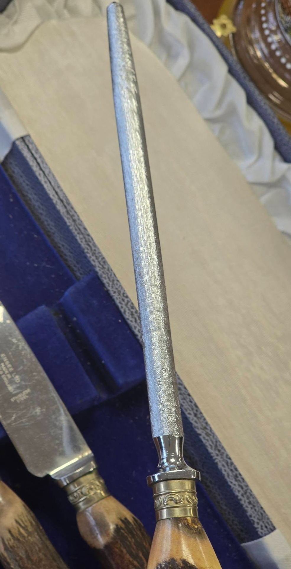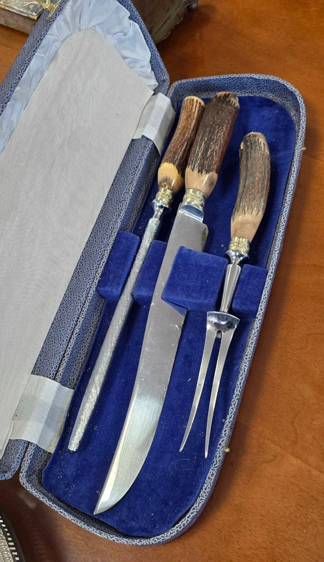 Set pentru porționare vintage, de colecție, compus din trei piese, cuțit, furculiță și tijă de ascuțit, din oțel inoxidabil cu mânere din corn de cerb,