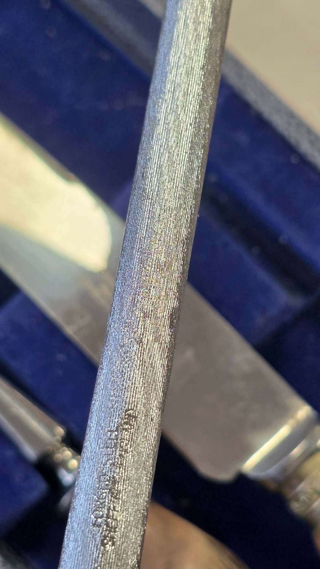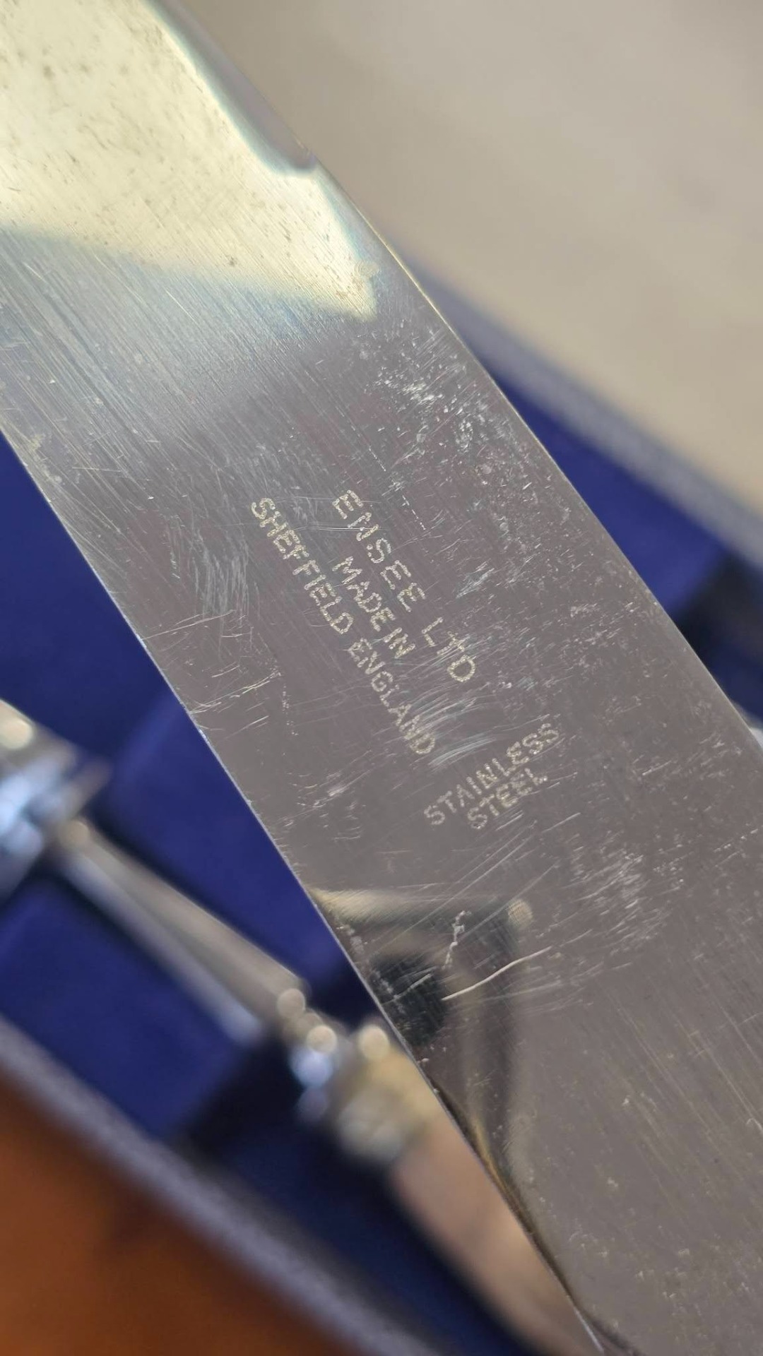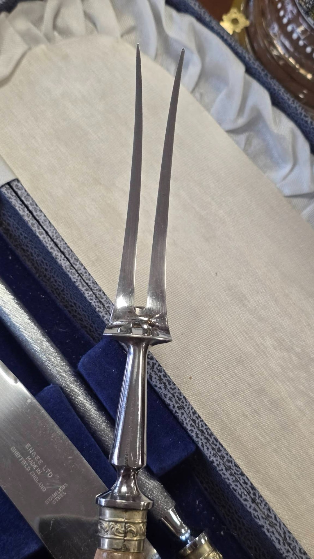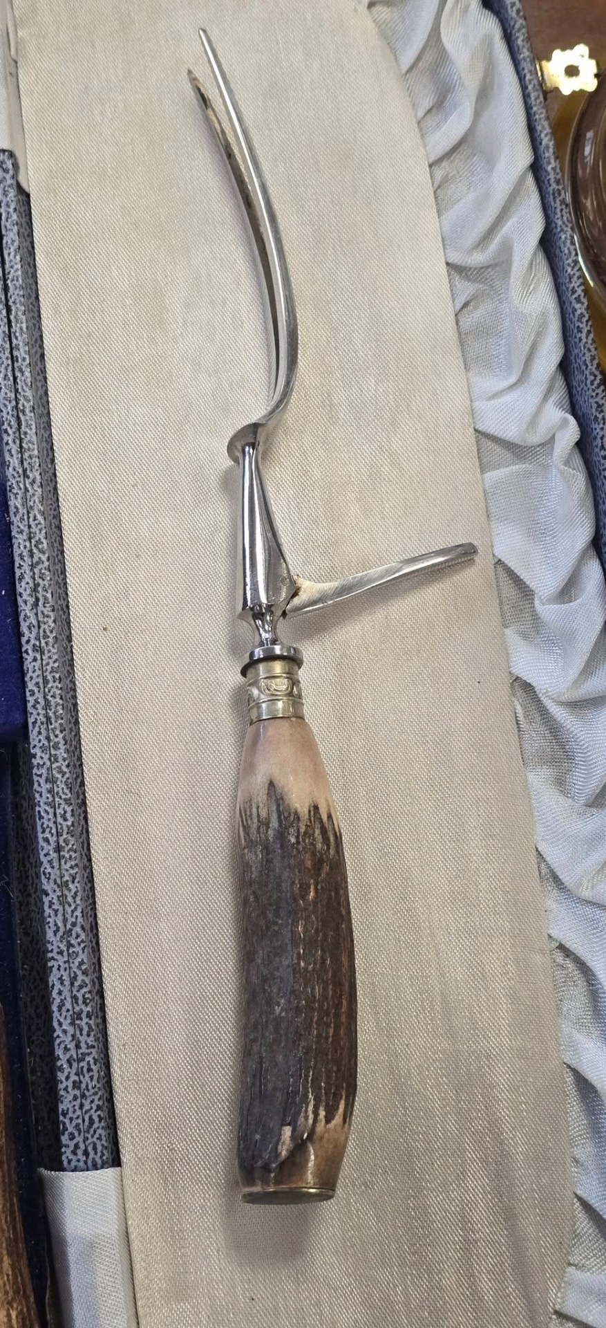 Set pentru porționare vintage, de colecție, compus din trei piese, cuțit, furculiță și tijă de ascuțit, din oțel inoxidabil cu mânere din corn de cerb,
