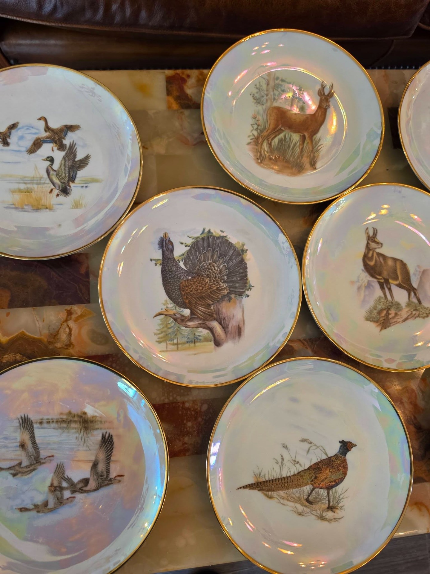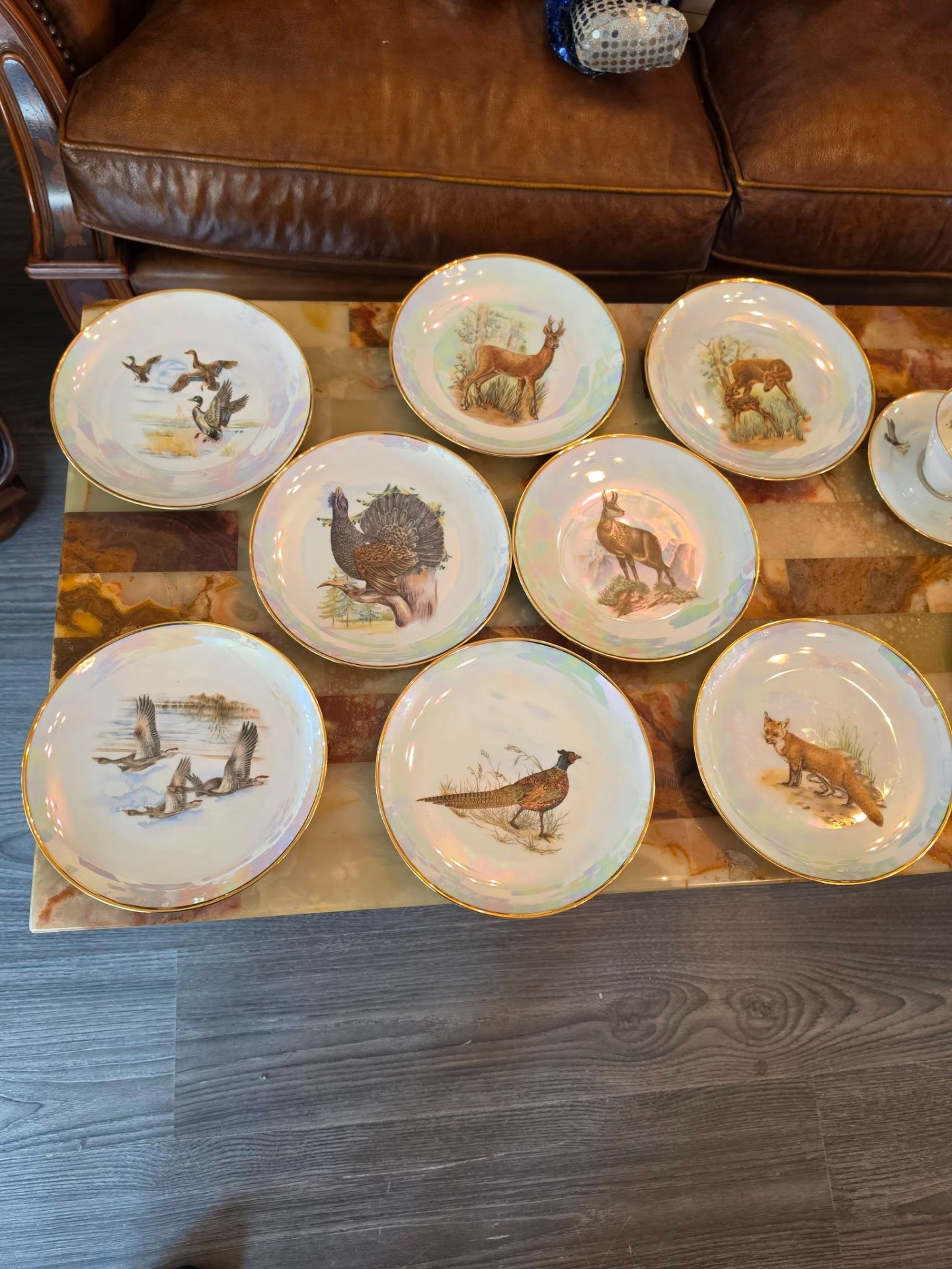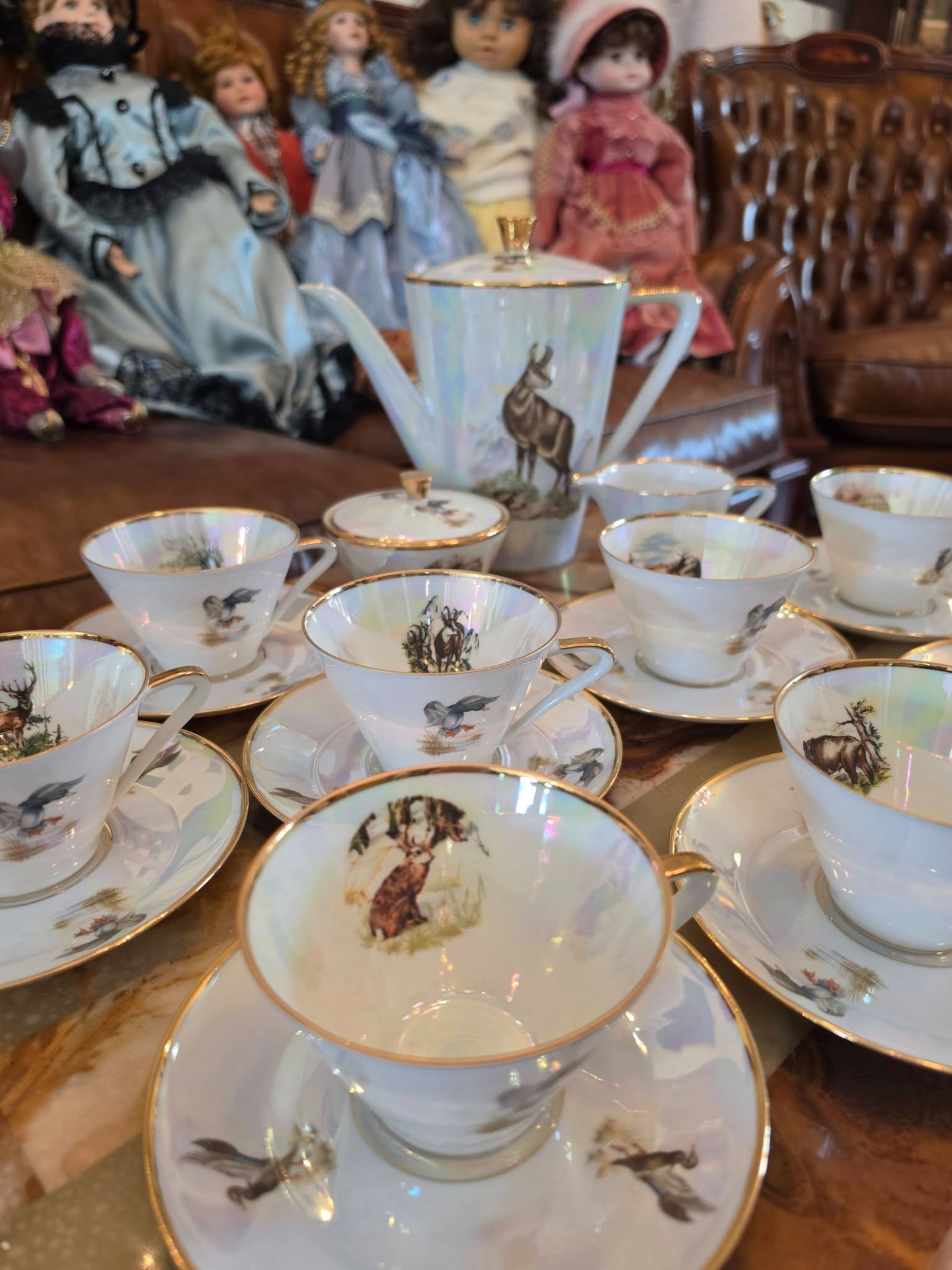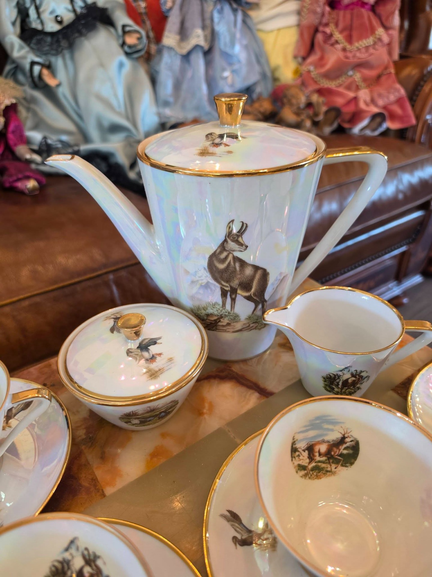 Set elegant din porțelan fin, marcat Royal Bavaria (Germania), cu decor deosebit reprezentând animale sălbatice (căprioare, fazani, rațe, vulpe etc.). Ideal pentru colecționari sau pentru decor vintage deosebit.