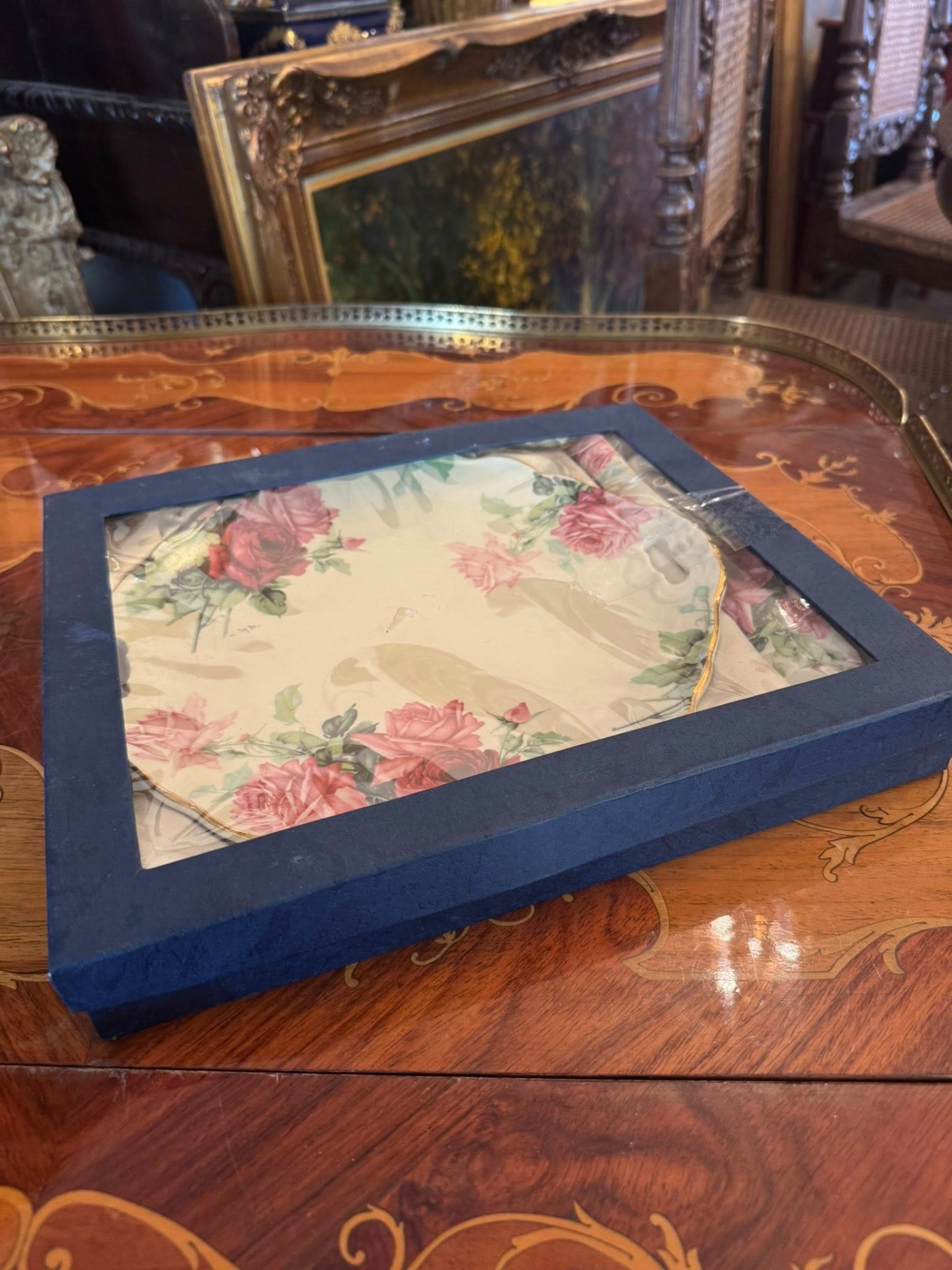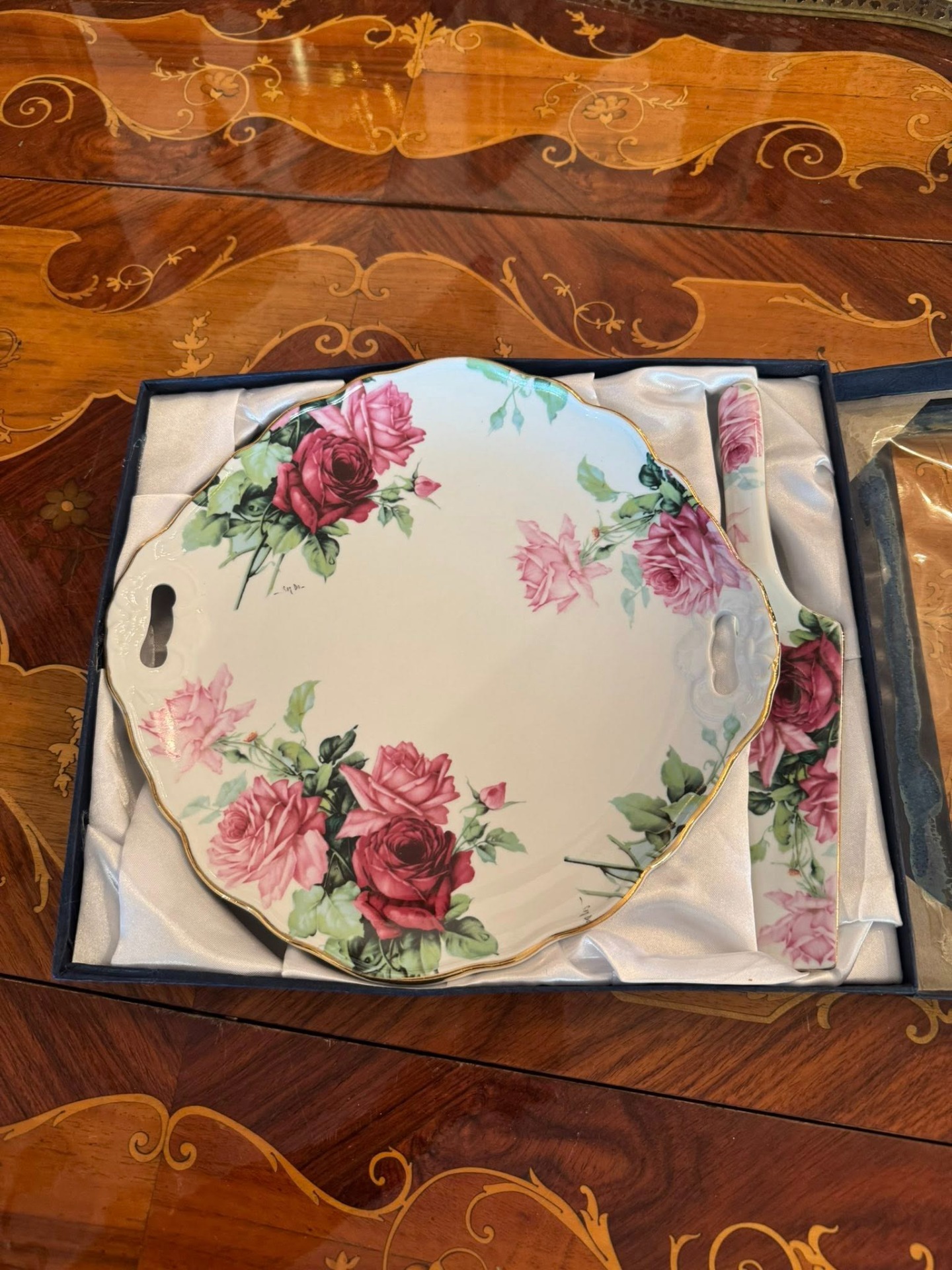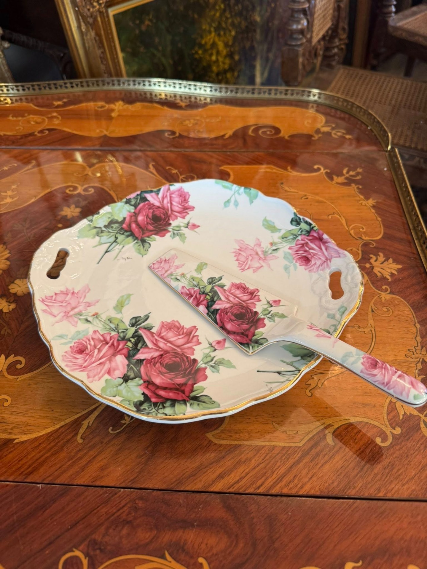 Set Royal England, de servire pentru desert realizat din Bone China (Porțelan de oase), compus dintr-un platou generos și o spatulă asortată, prezentate în cutia originală.