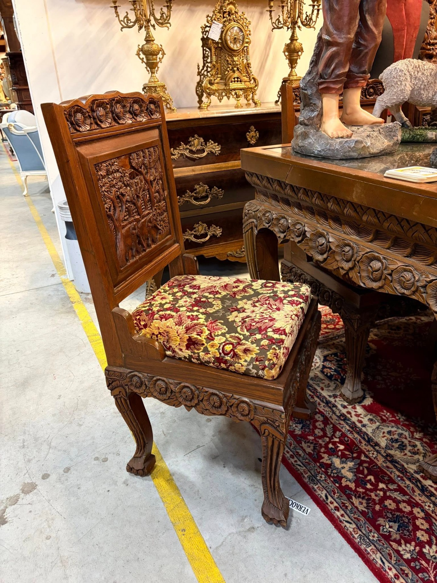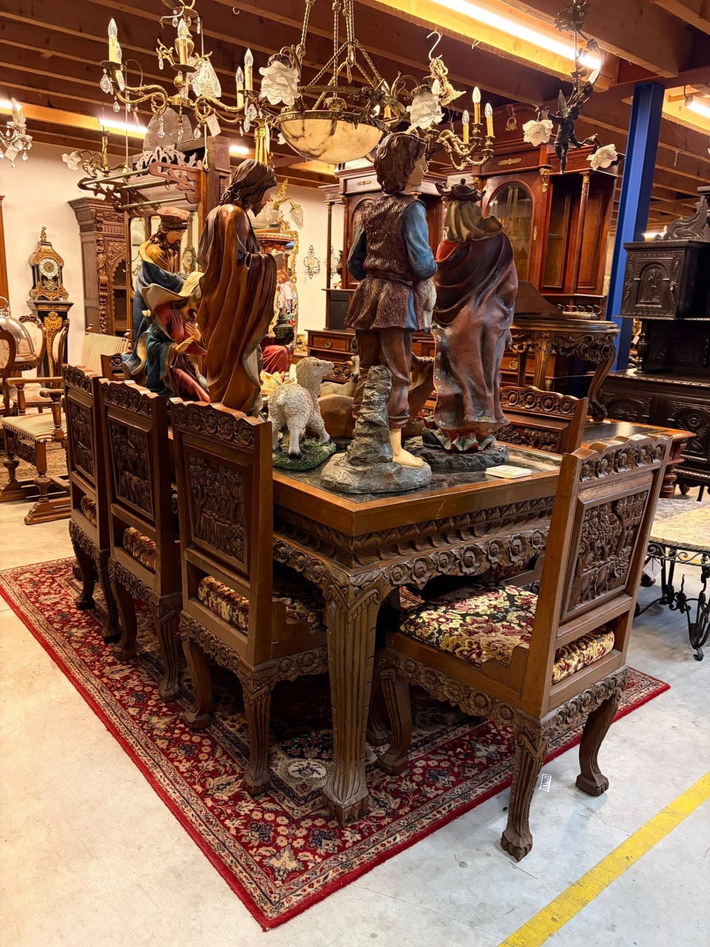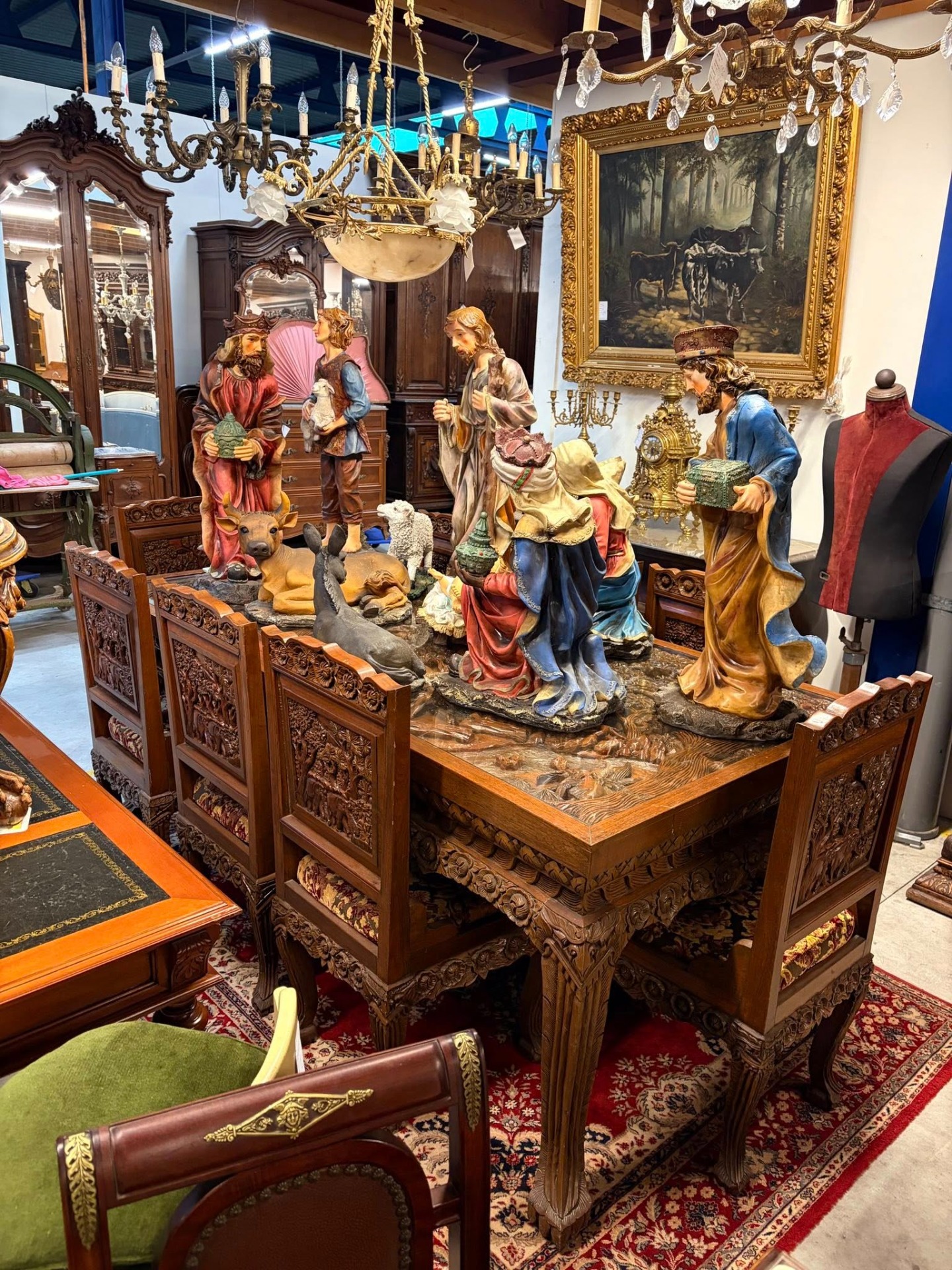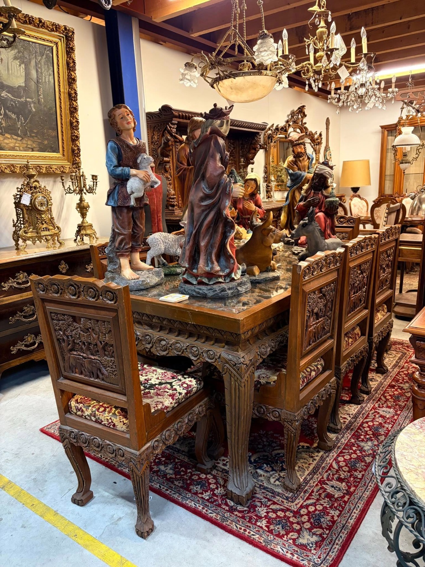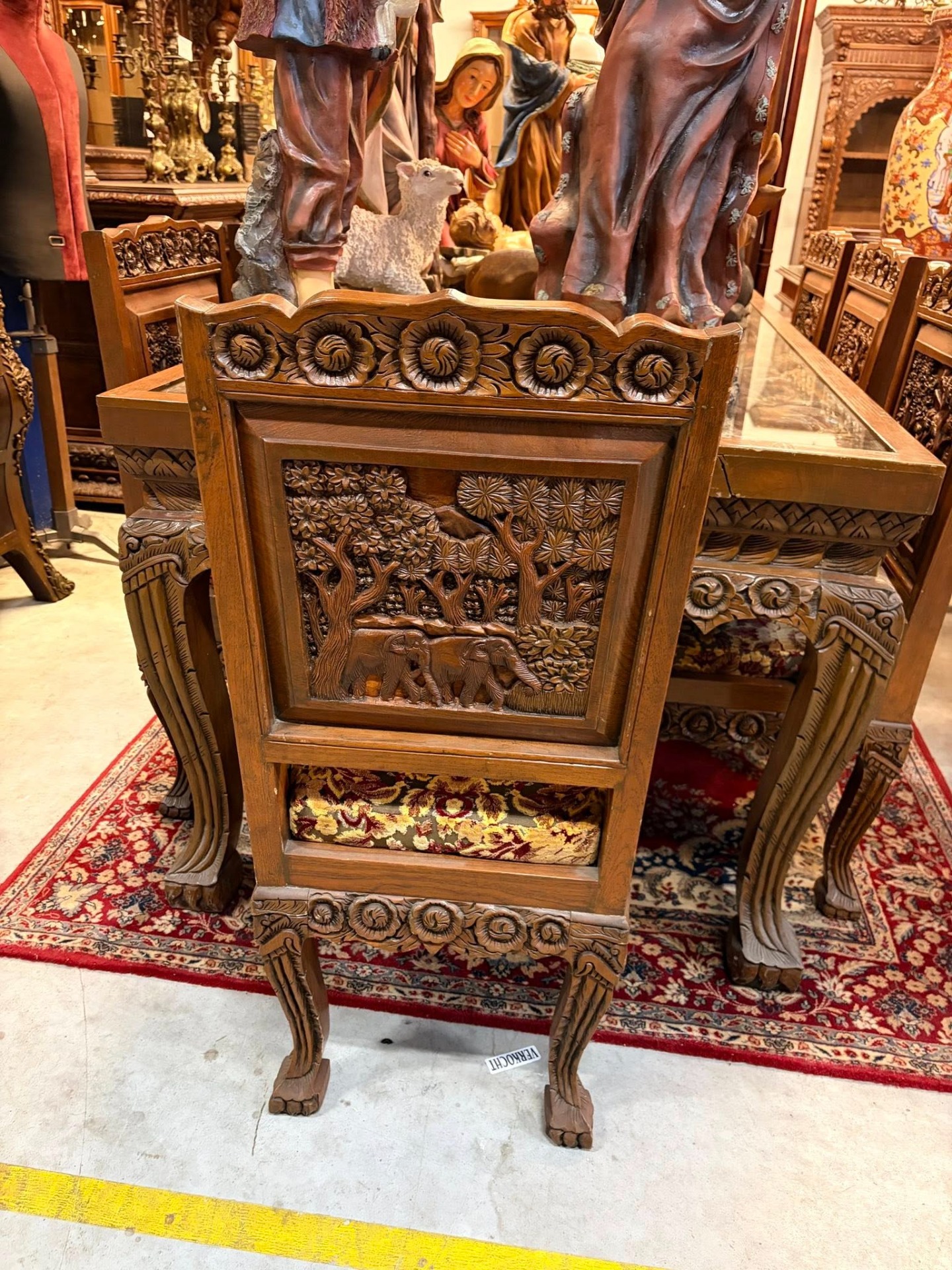 Set spectaculos format din masă + 8 scaune din lemn masiv, lucrate manual, cu sculpturi bogate și detalii deosebite. Spătarele scaunelor sunt decorate cu scene sculptate în relief (elefanți și vegetație), iar picioarele mesei și ale scaunelor sunt masive, cu ornamente florale.