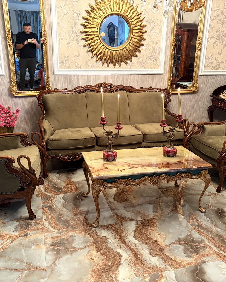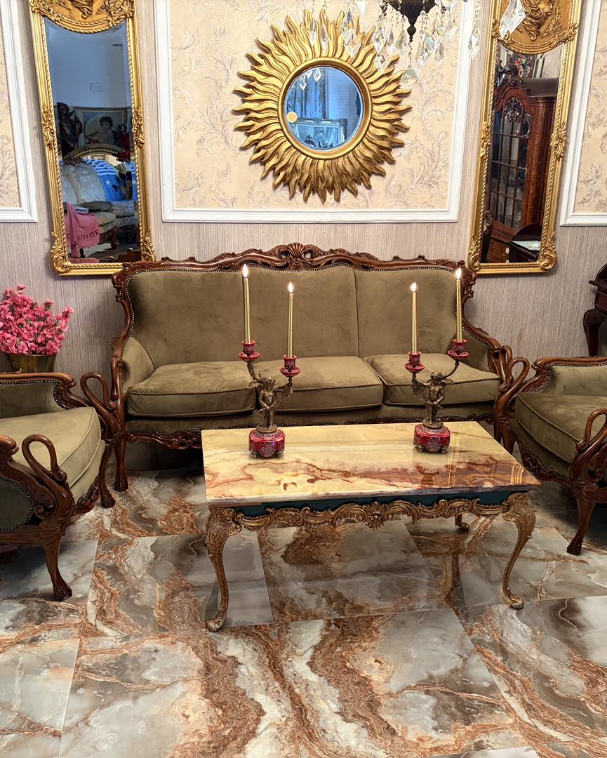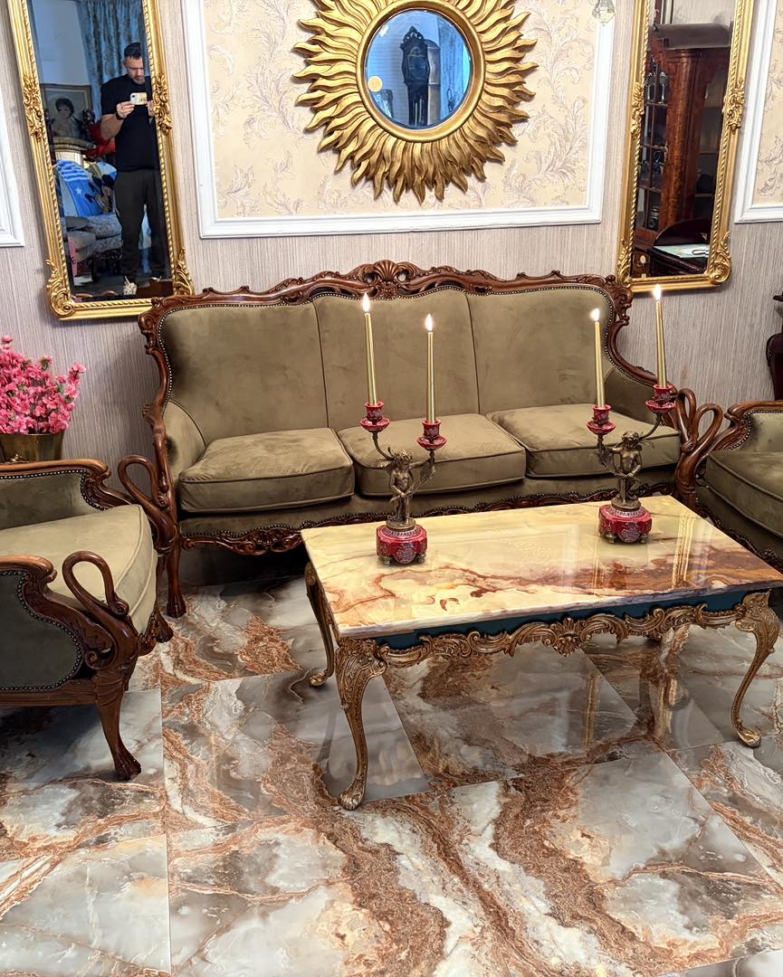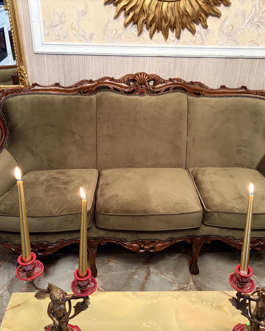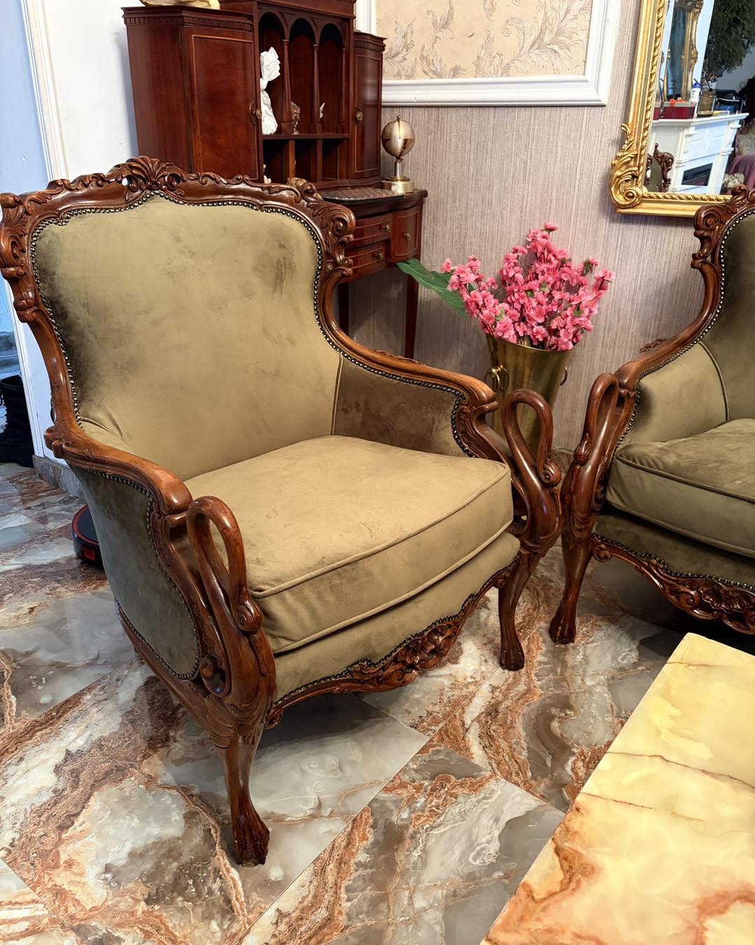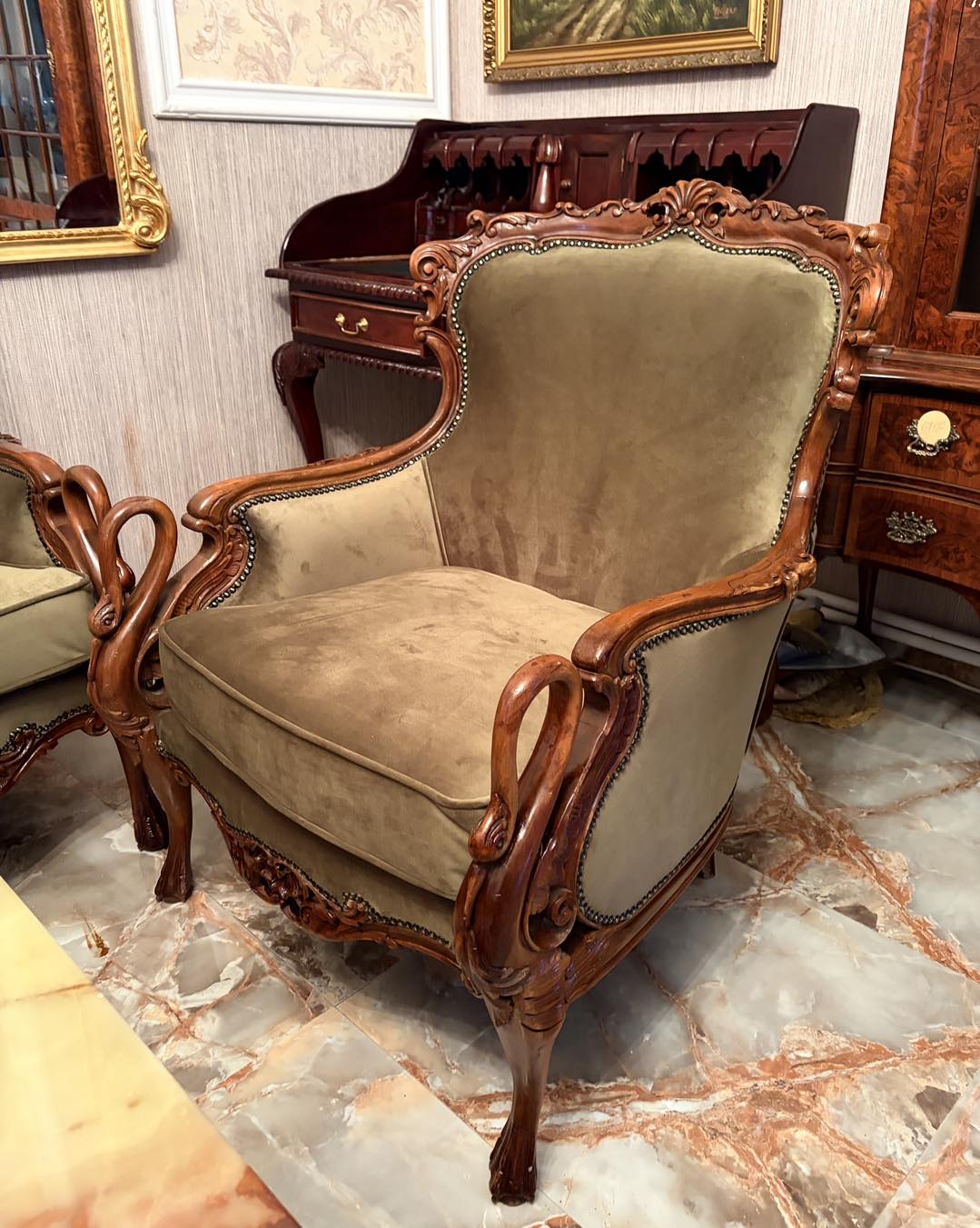 Acest set spectaculos nu este doar mobilier, este o piesă de istorie și artă. De la brațele sculptate sub formă de lebede până la confortul incredibil al catifelei, totul emană rafinament. Perfect pentru un decor clasic sau un mix eclectic modern-vintage.