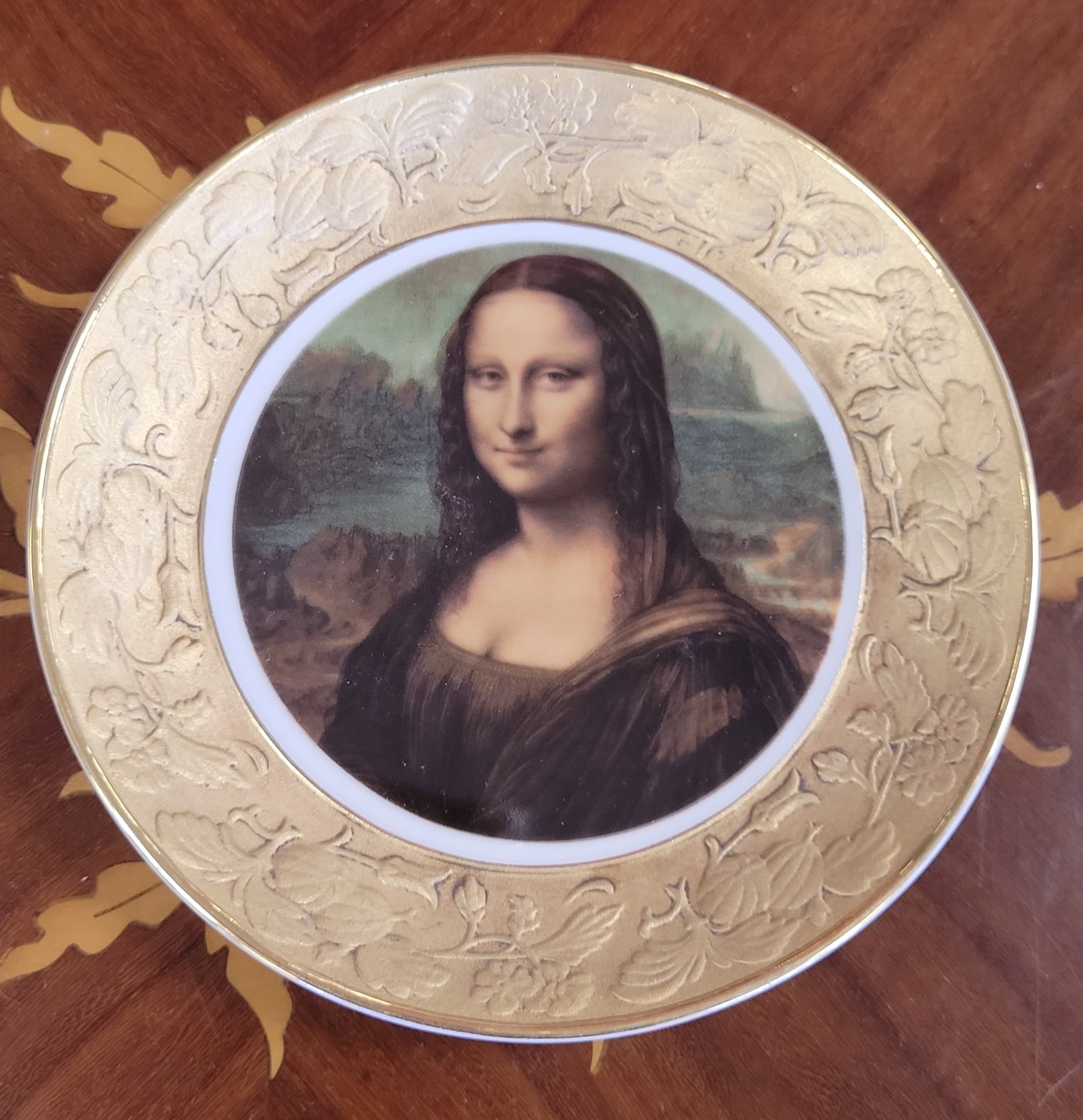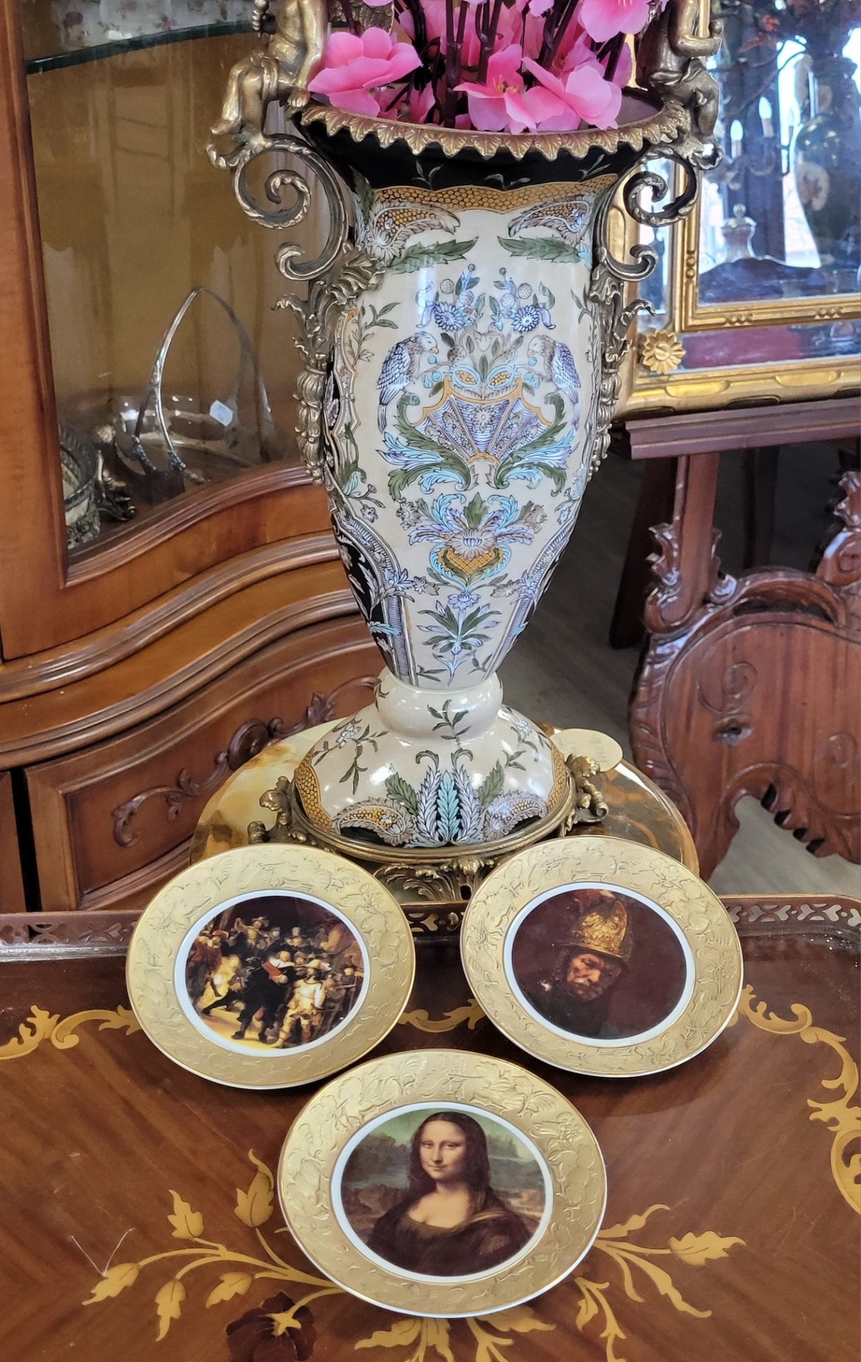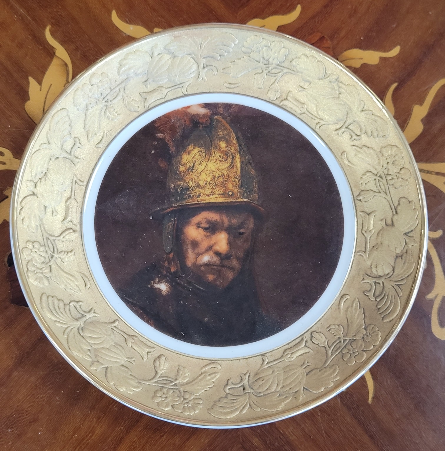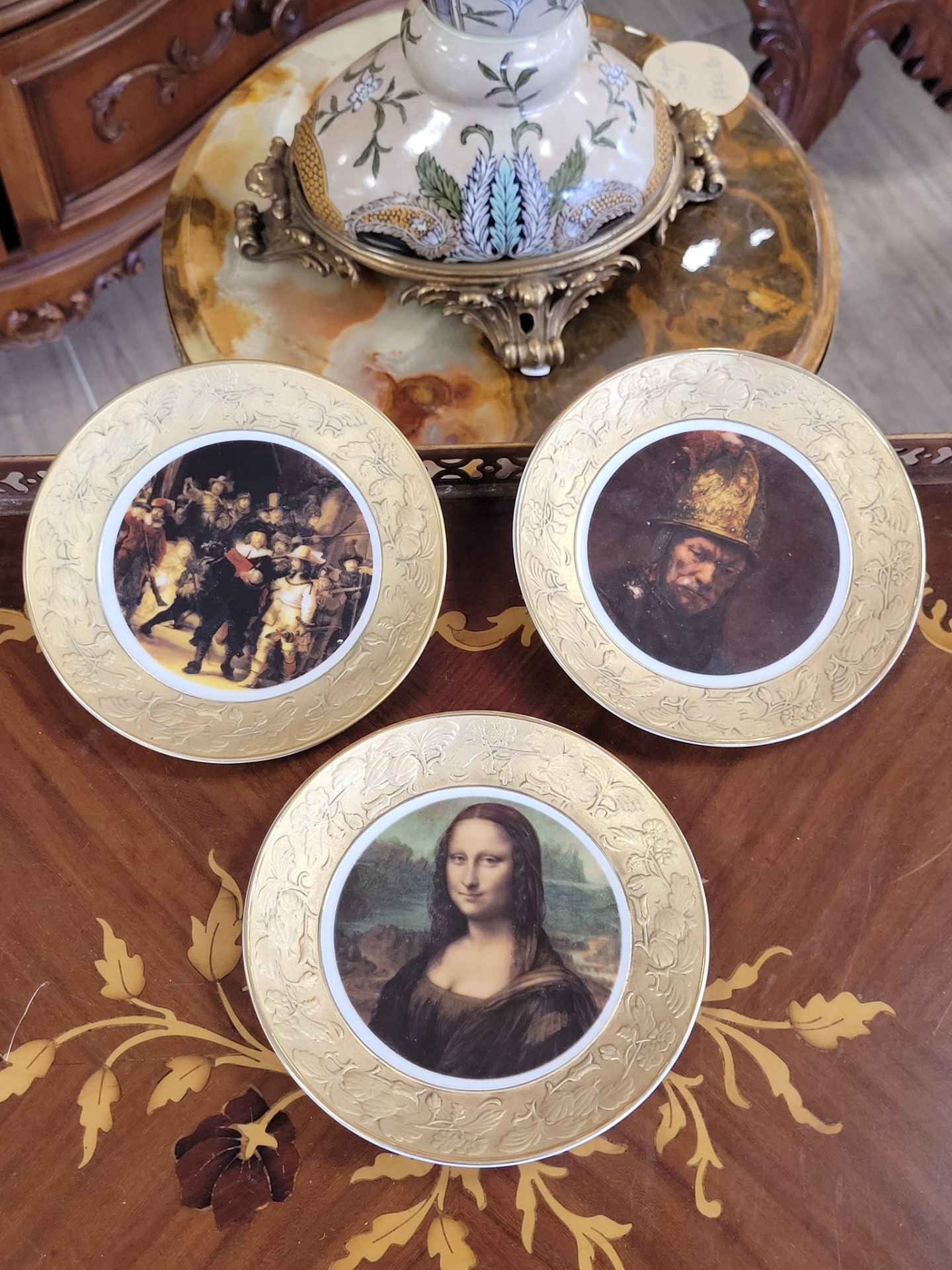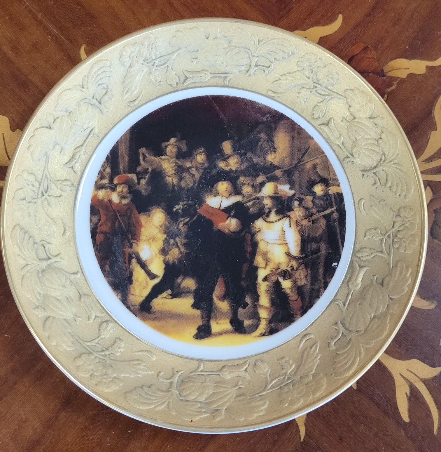 Farfuriile redau capodopere ale picturii universale, fiind încadrate de o bordură lată, bogat ornamentată cu motive florale aurii (aurit mat/lucios).