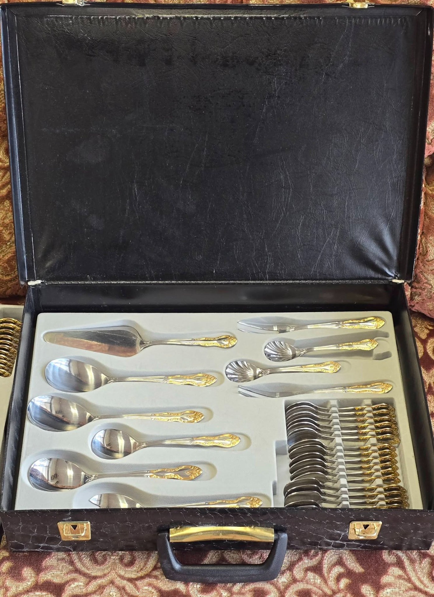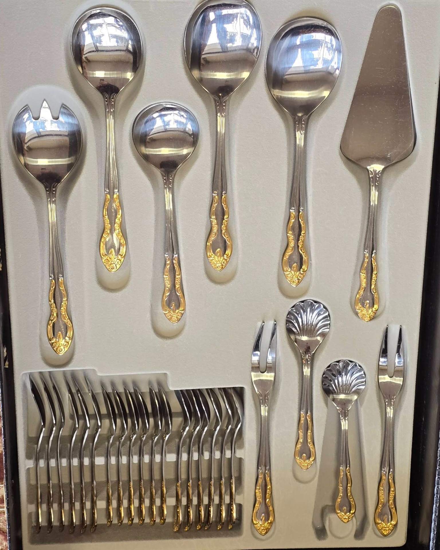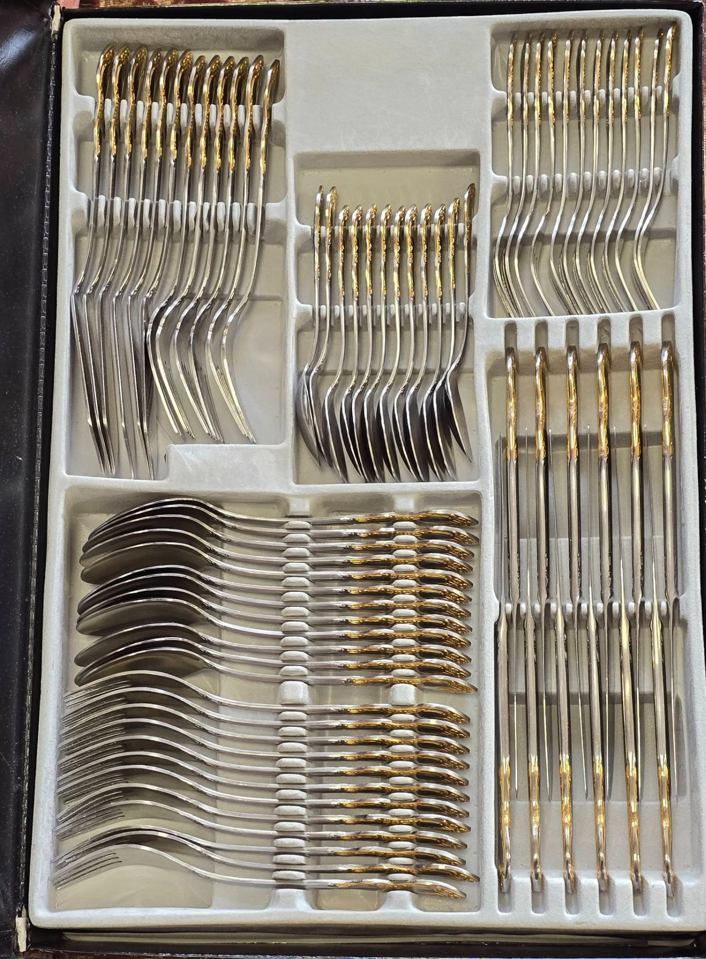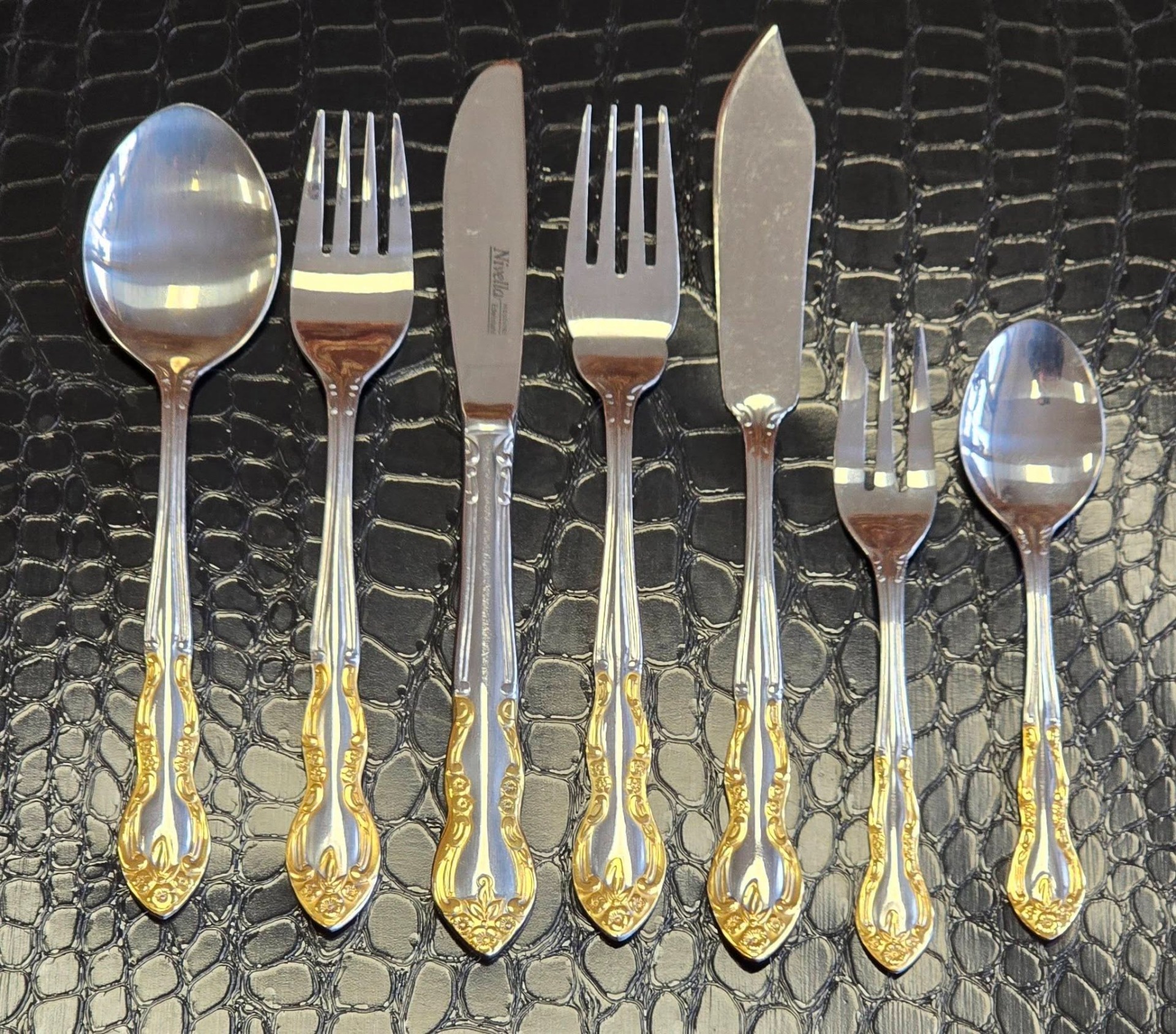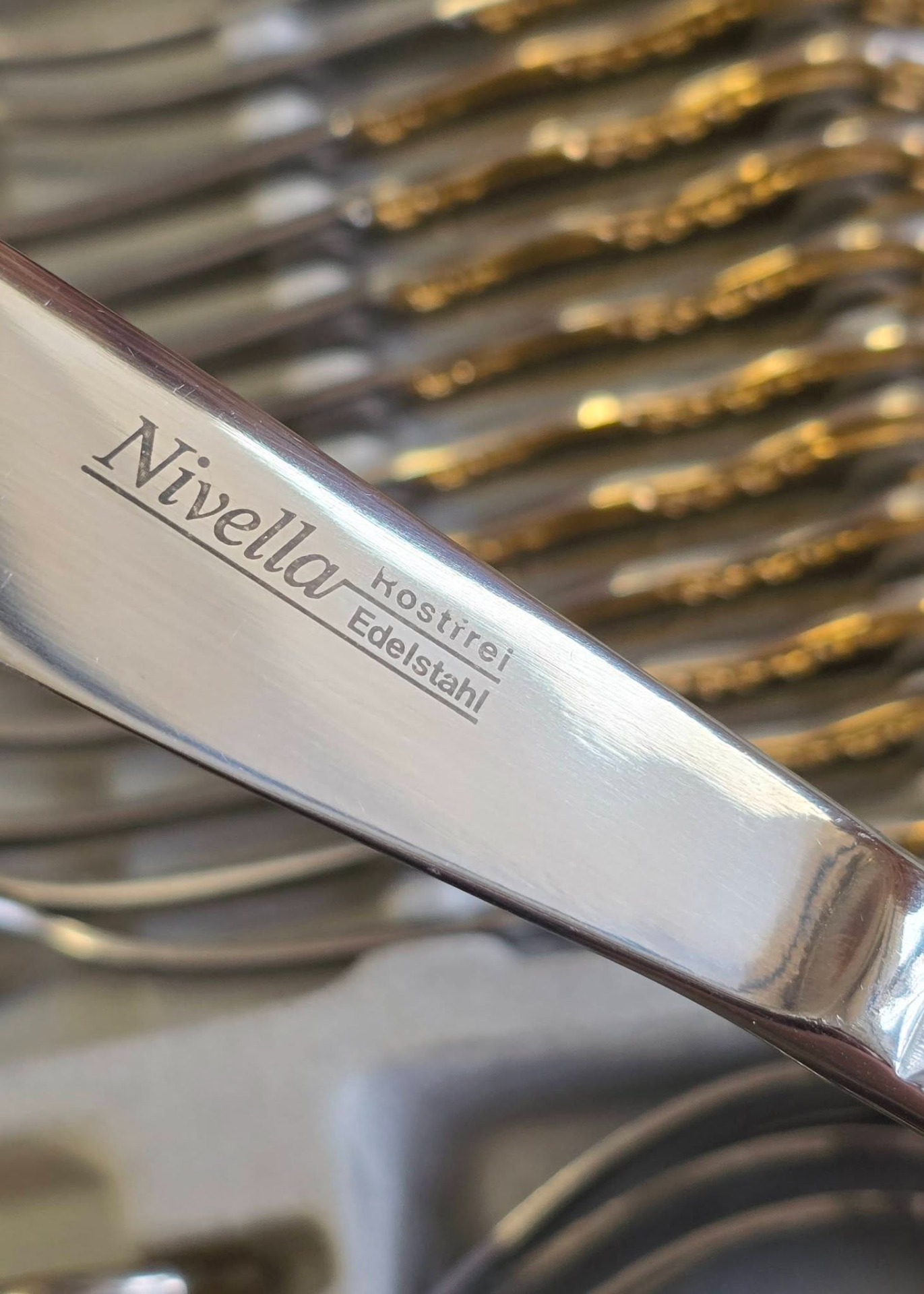 Set tacâmuri Nivella Solingen pentru 12 persoane, cu elemente aurite, compus din 100 de piese: 12 cuțite, 12 furculițe, 12 linguri, 12 lingurițe, 12 furculițe desert, 6 cuțite pește, 6 furculițe pește, paletă tort, 3 linguri salate, 2 linguri sosuri, 2 furculițe servire, 2 lingurițe servire, 6 lingurițe zahăr, 6 lingurițe frișcă/smântână și 6 lingurițe cafea/ceai.