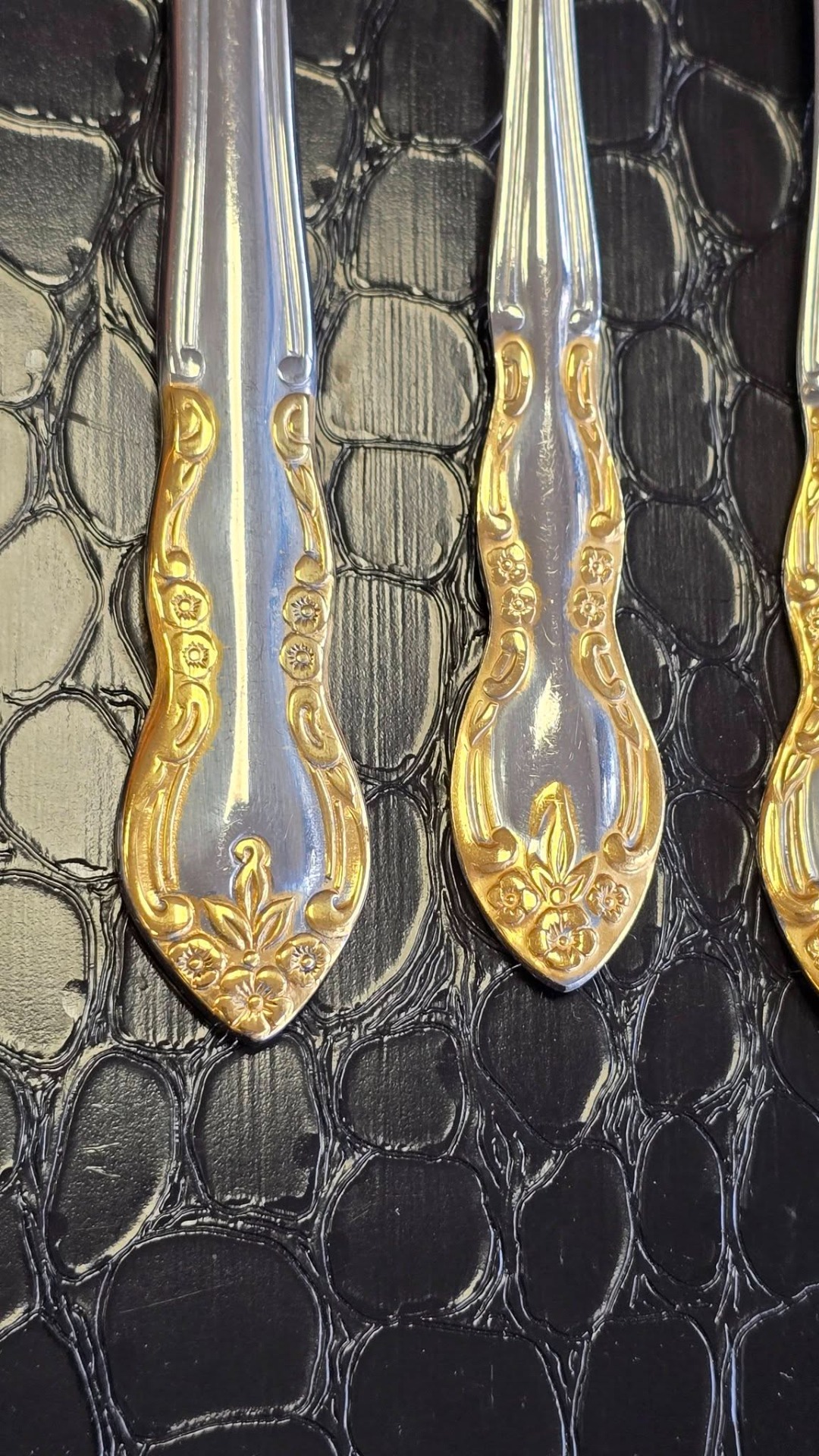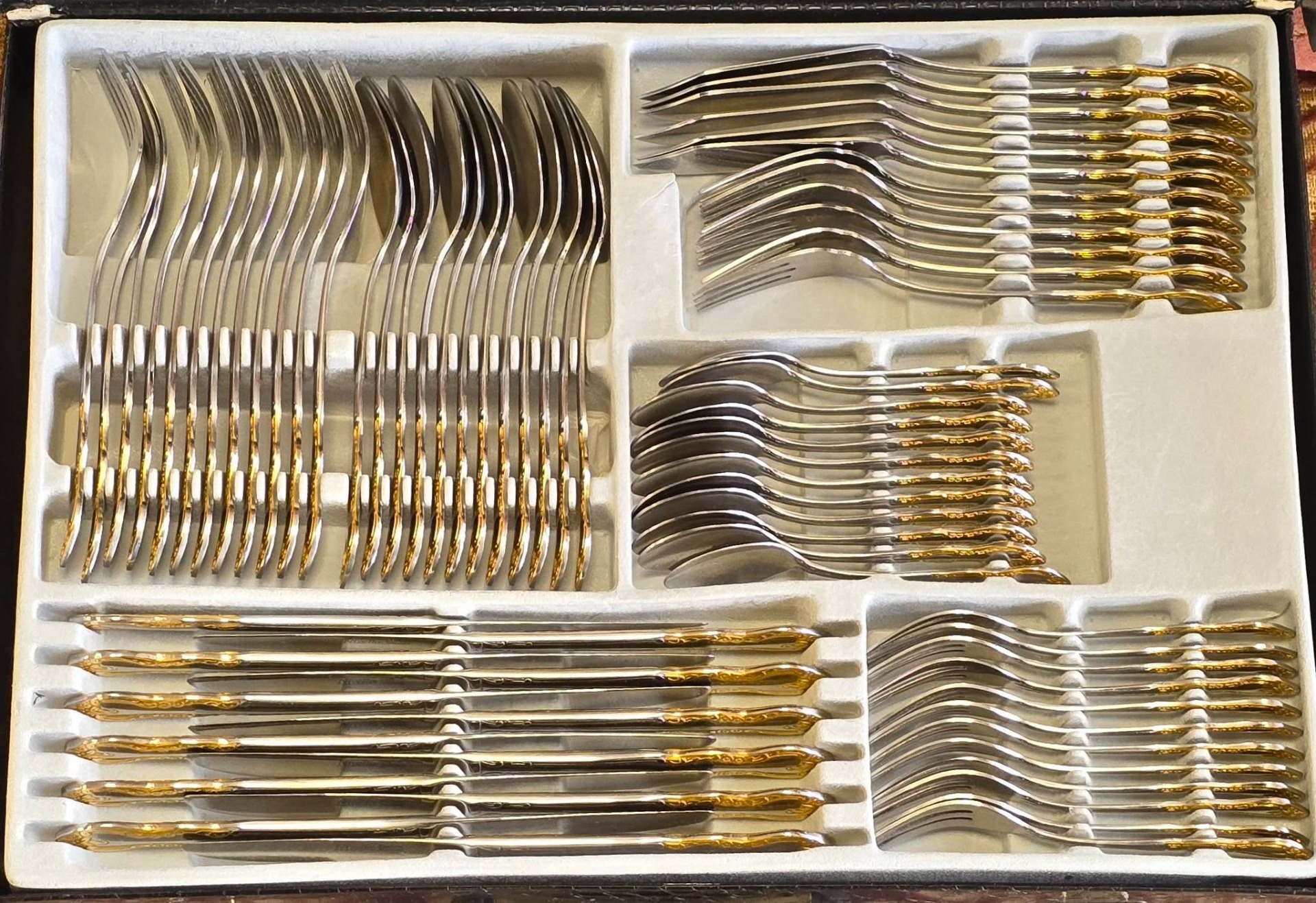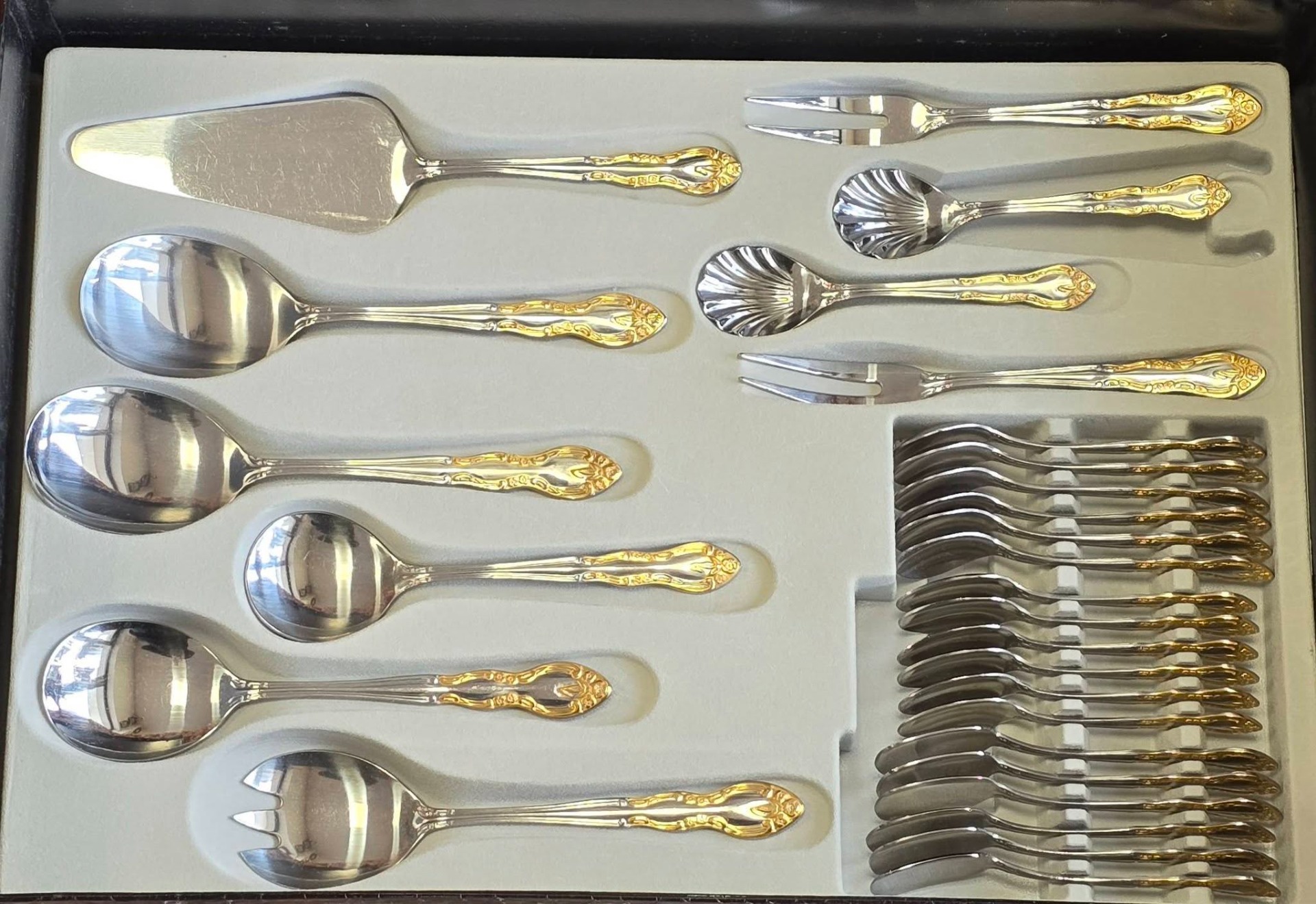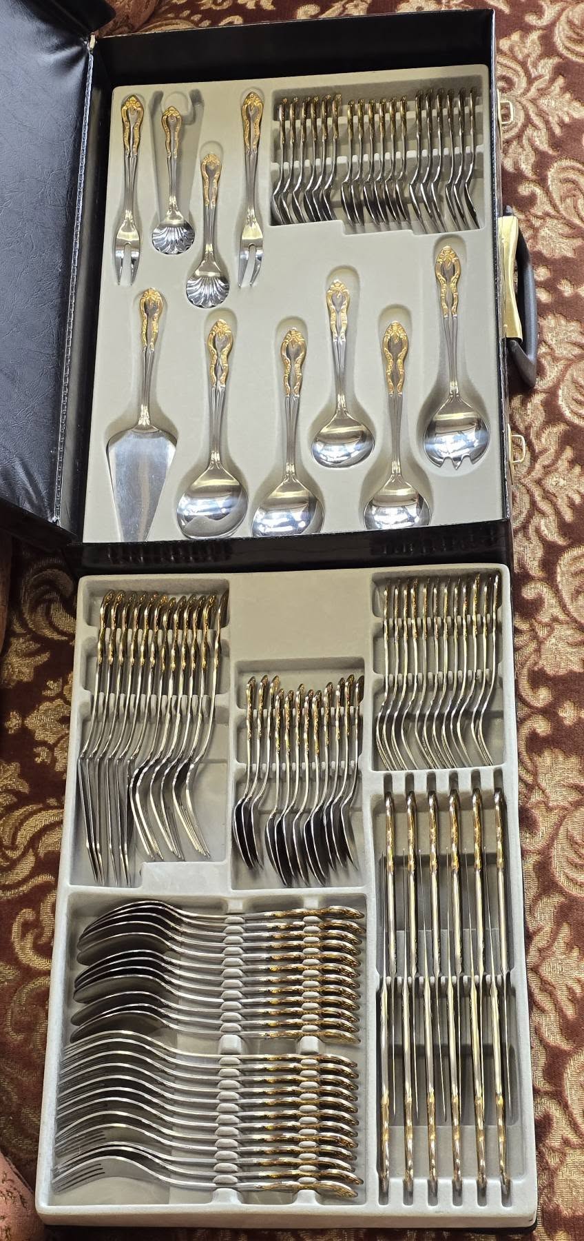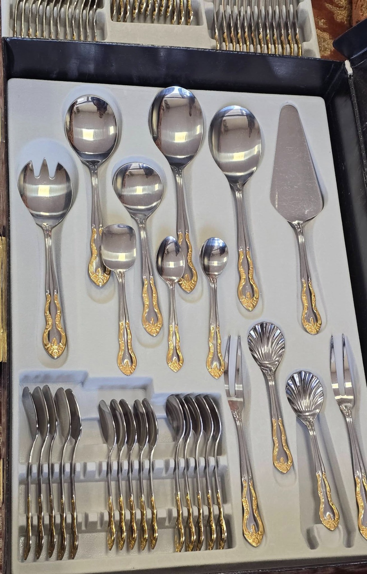 Set tacâmuri Nivella Solingen pentru 12 persoane, cu elemente aurite, compus din 100 de piese: 12 cuțite, 12 furculițe, 12 linguri, 12 lingurițe, 12 furculițe desert, 6 cuțite pește, 6 furculițe pește, paletă tort, 3 linguri salate, 2 linguri sosuri, 2 furculițe servire, 2 lingurițe servire, 6 lingurițe zahăr, 6 lingurițe frișcă/smântână și 6 lingurițe cafea/ceai.