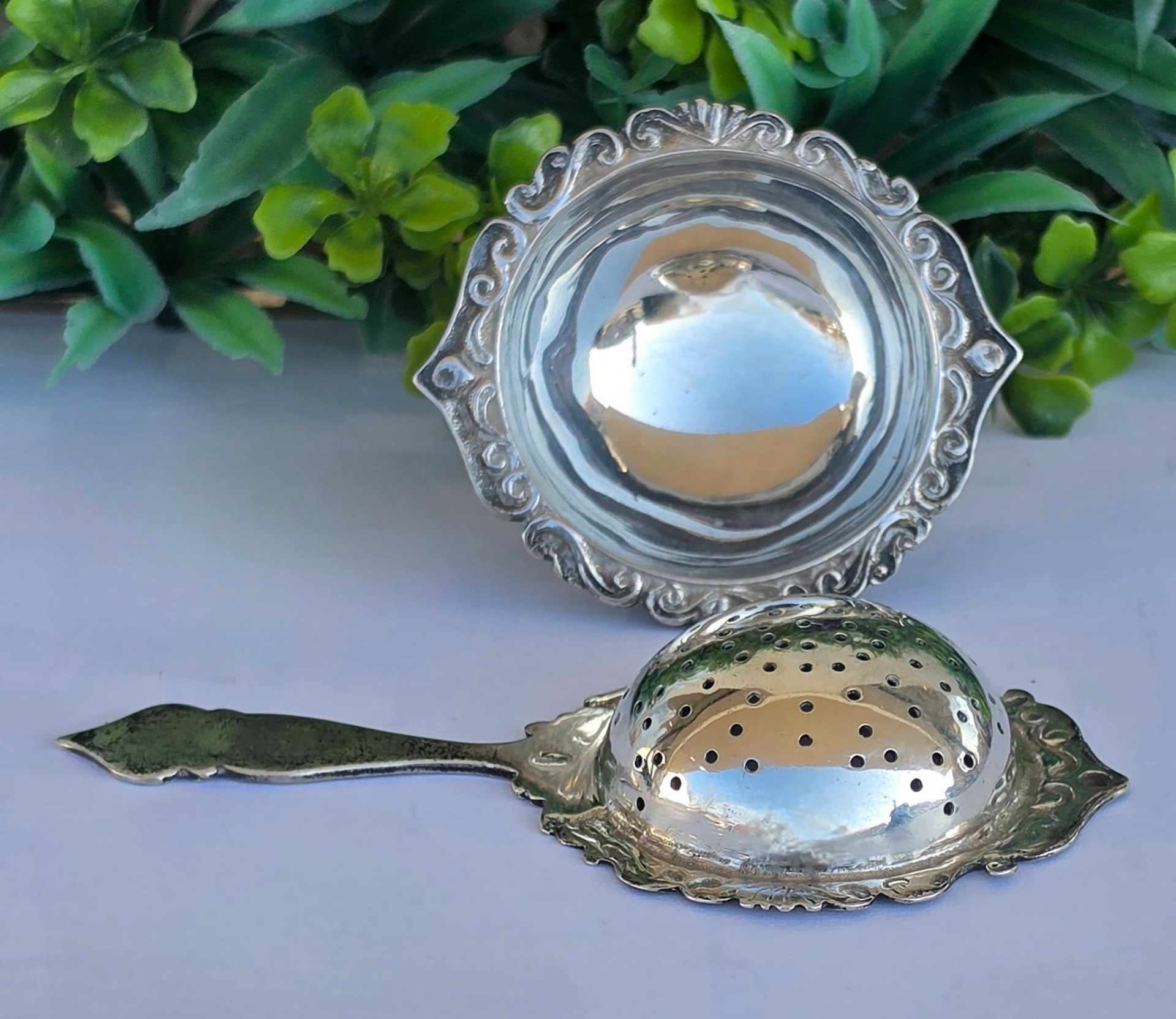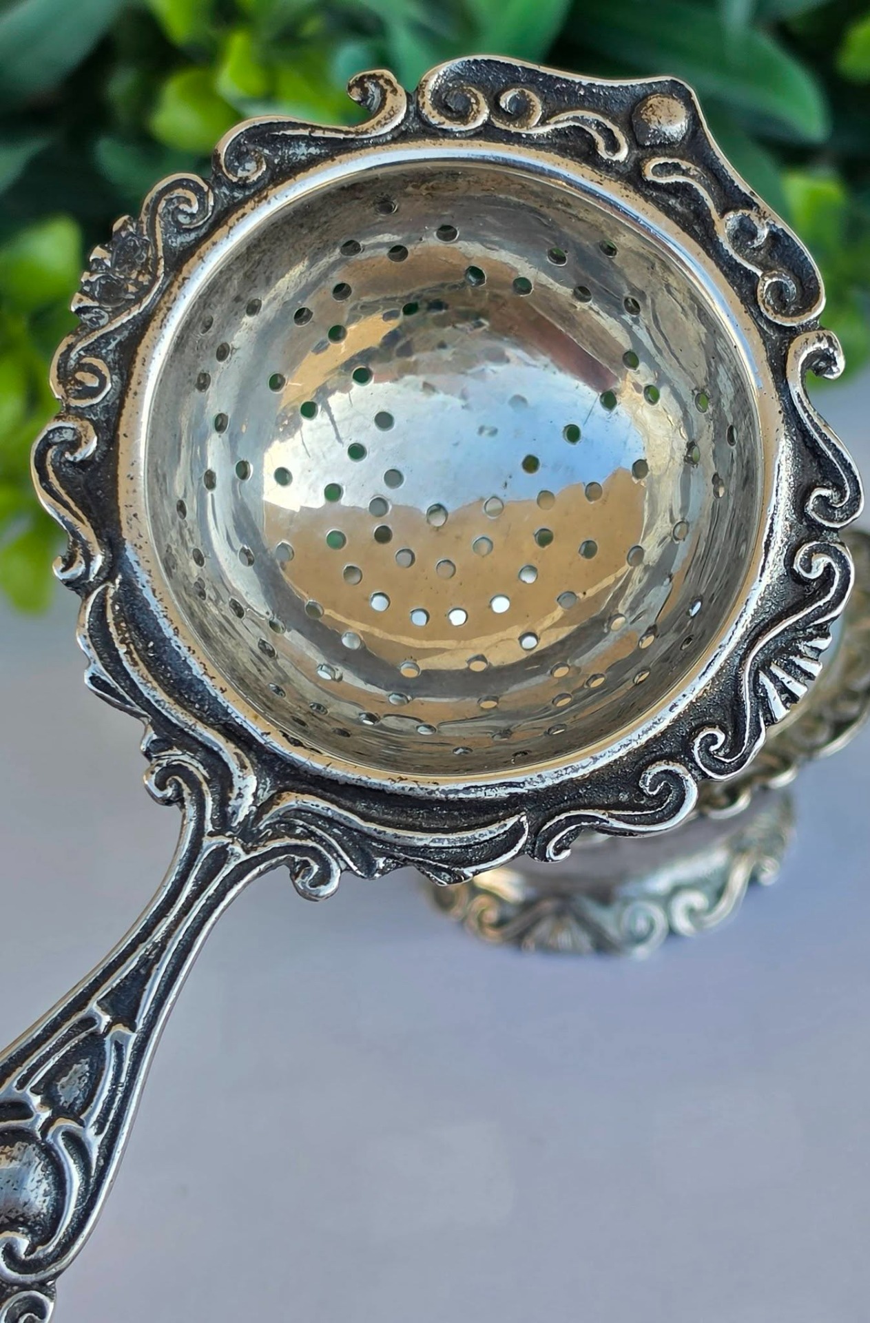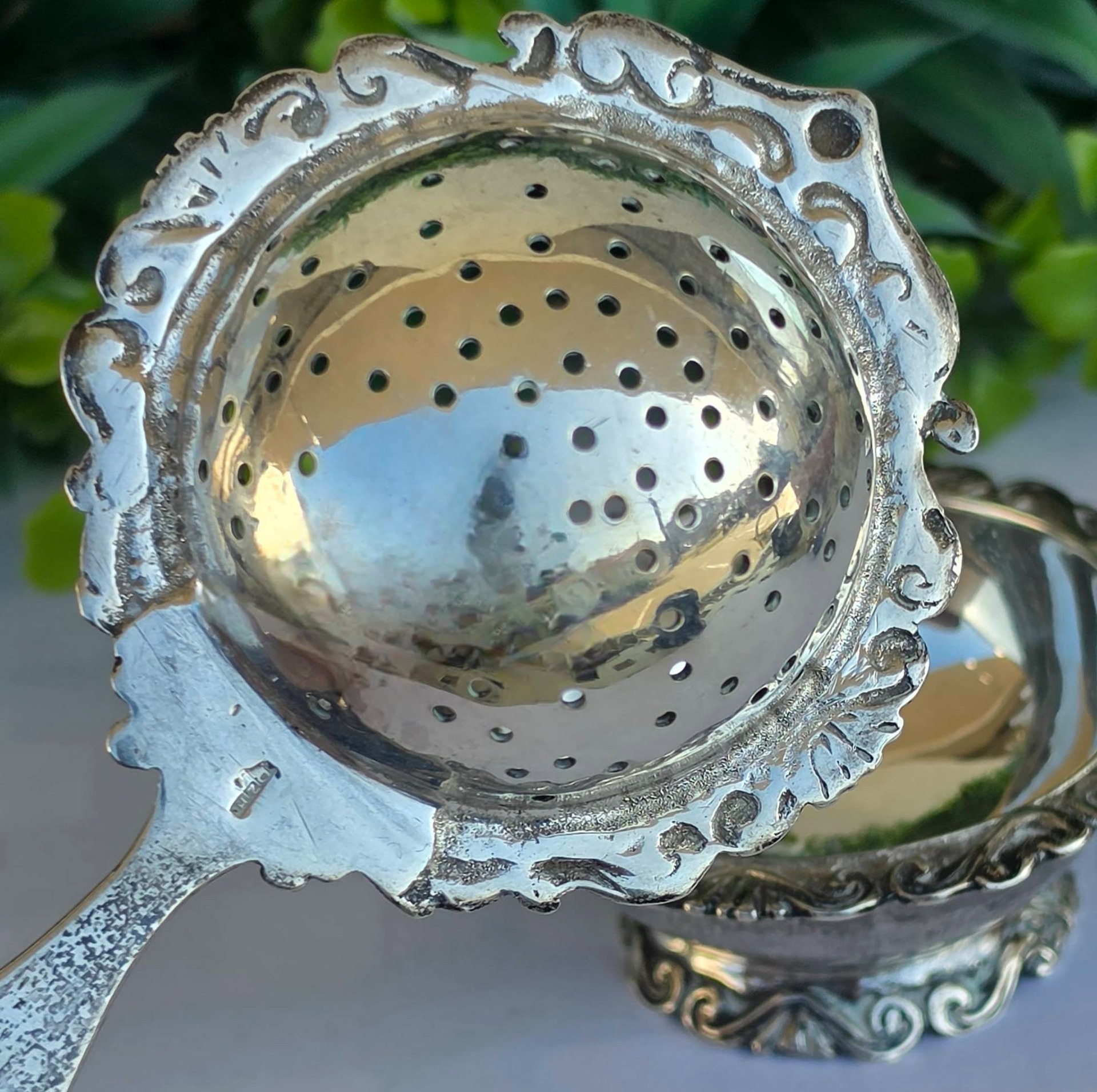 Set vechi din argint compus din strecurătoare pentru ceai și suport pentru picături, de colecție, cu design bogat ornamentat în stil Neo-Rococo, cu motive florale și margini festonate lucrate în detaliu, manufactură de meșter olandez (anii 1890-1910, Olanda).
