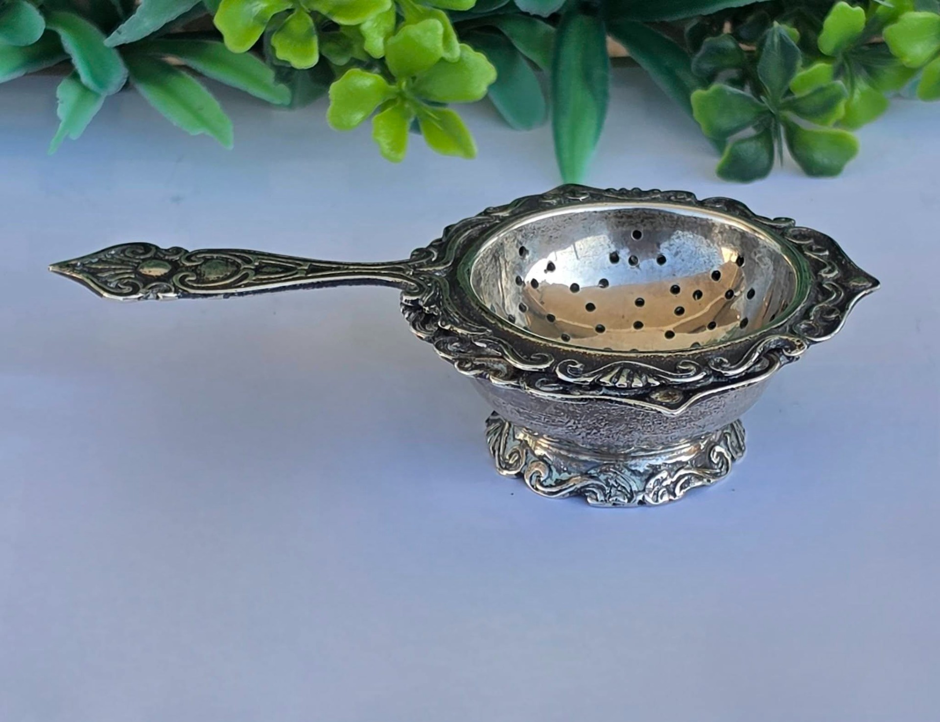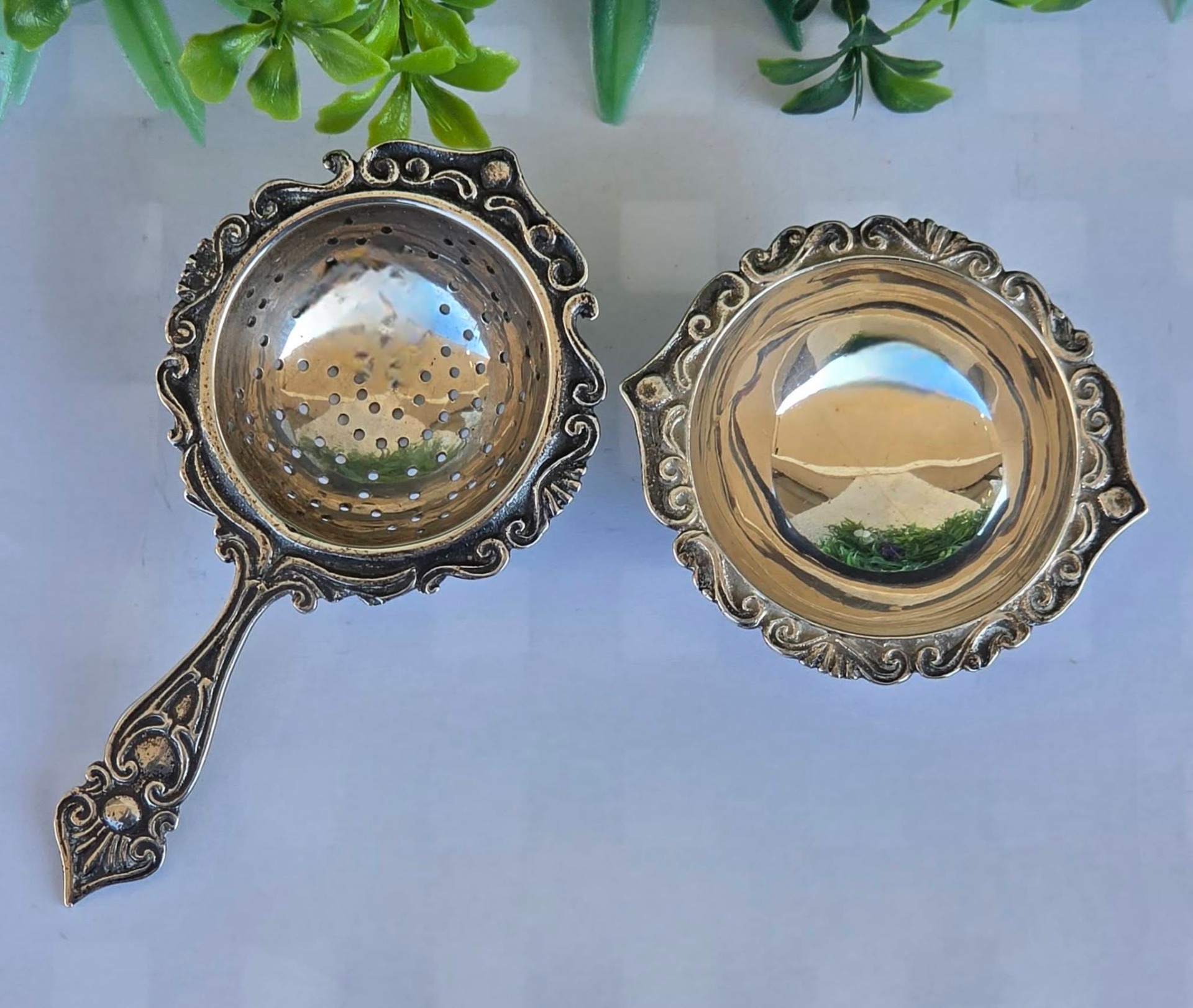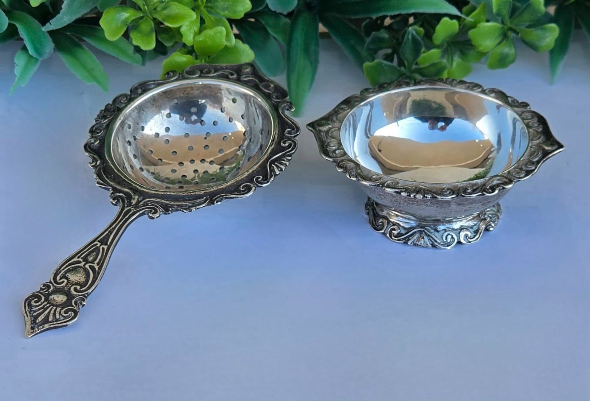 Set vechi din argint compus din strecurătoare pentru ceai și suport pentru picături, de colecție, cu design bogat ornamentat în stil Neo-Rococo, cu motive florale și margini festonate lucrate în detaliu, manufactură de meșter olandez (anii 1890-1910, Olanda).