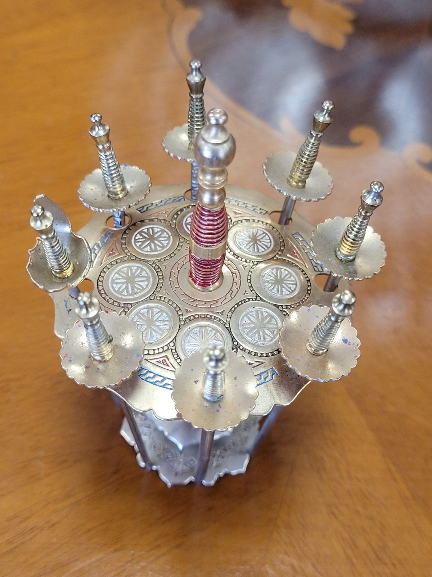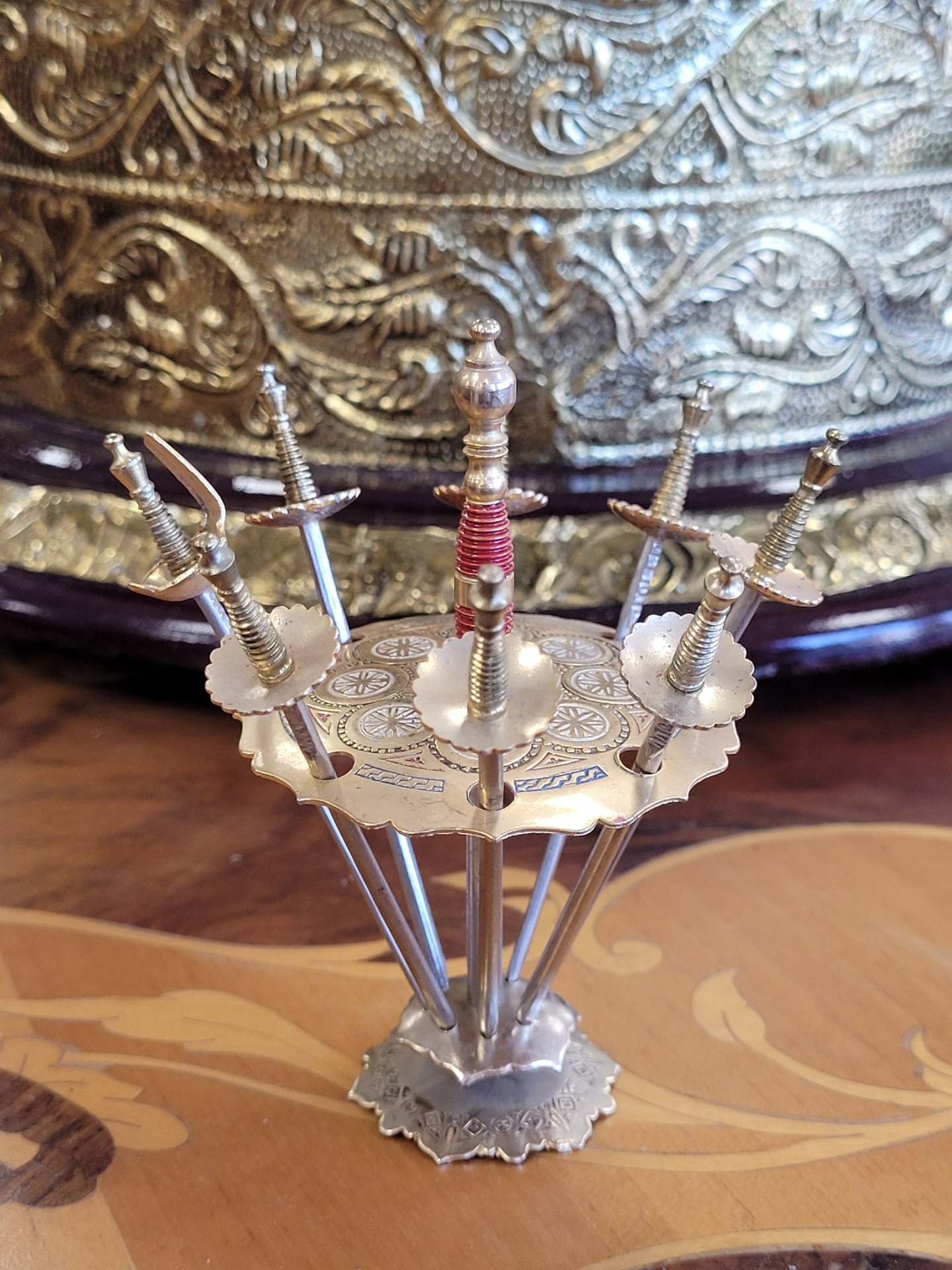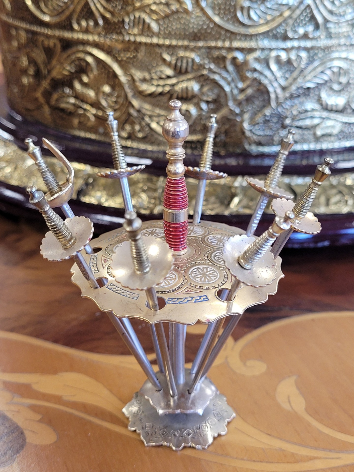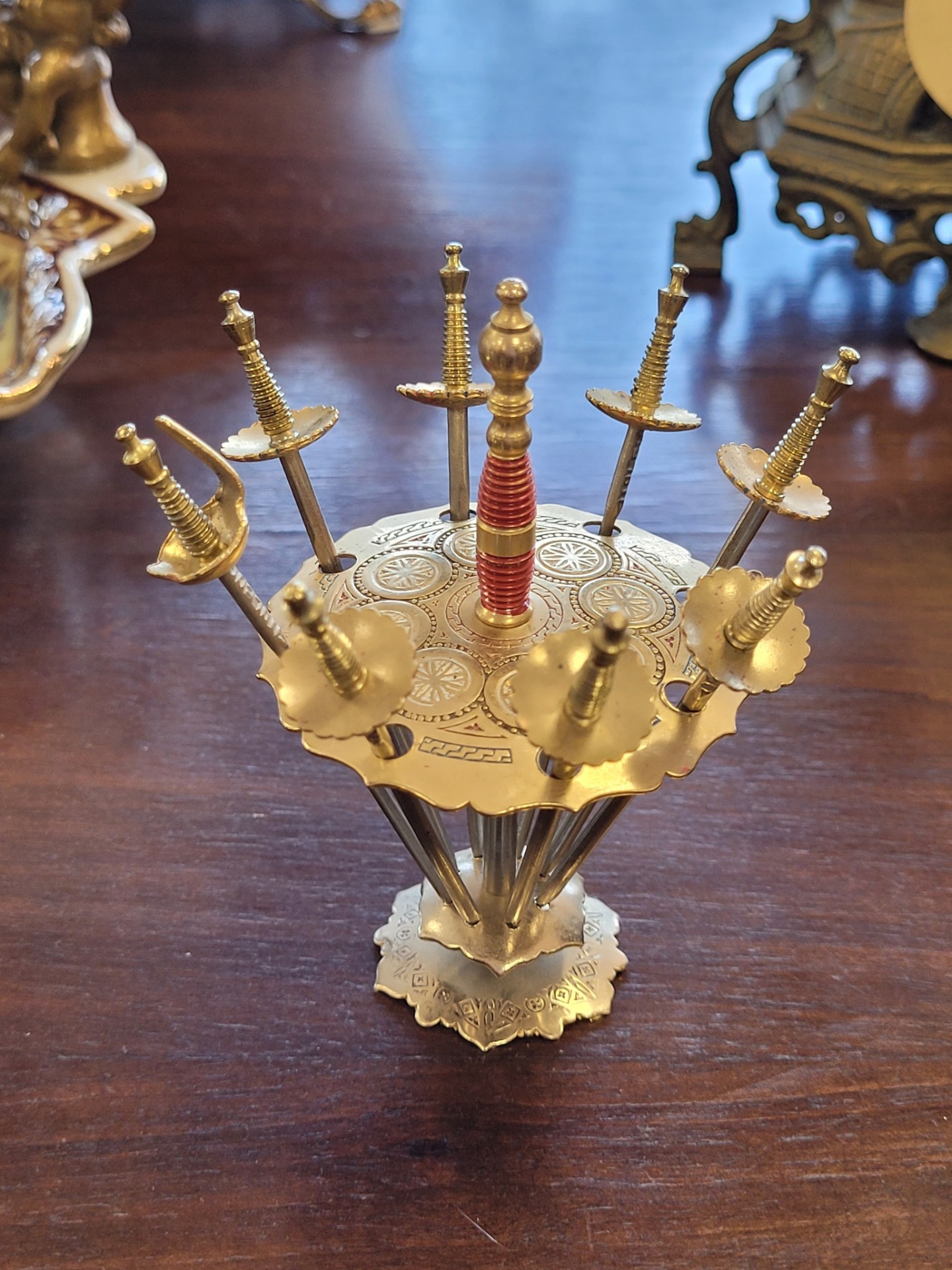 Set vintage aperitive "săbiile din Toledo", suport cu 6 scobitori tip sabie, din alamă.