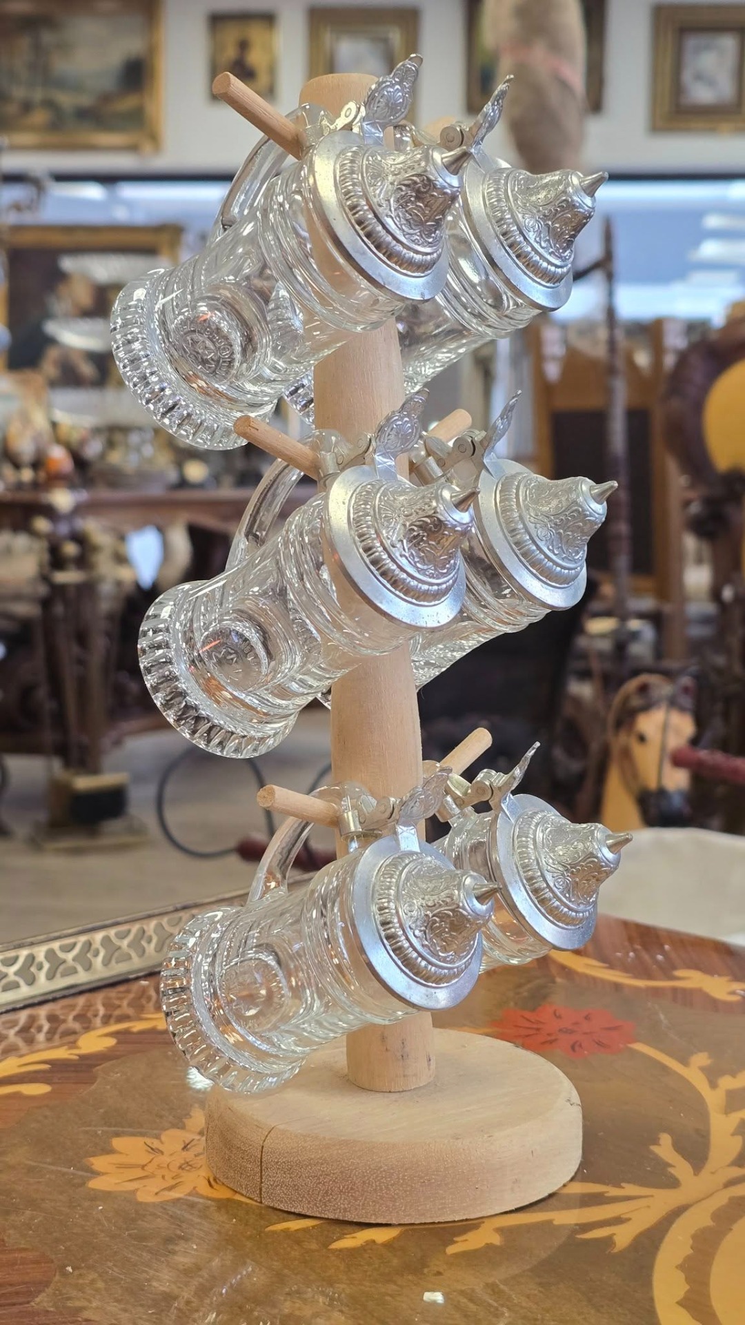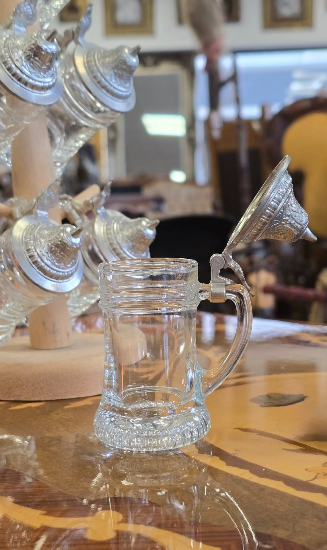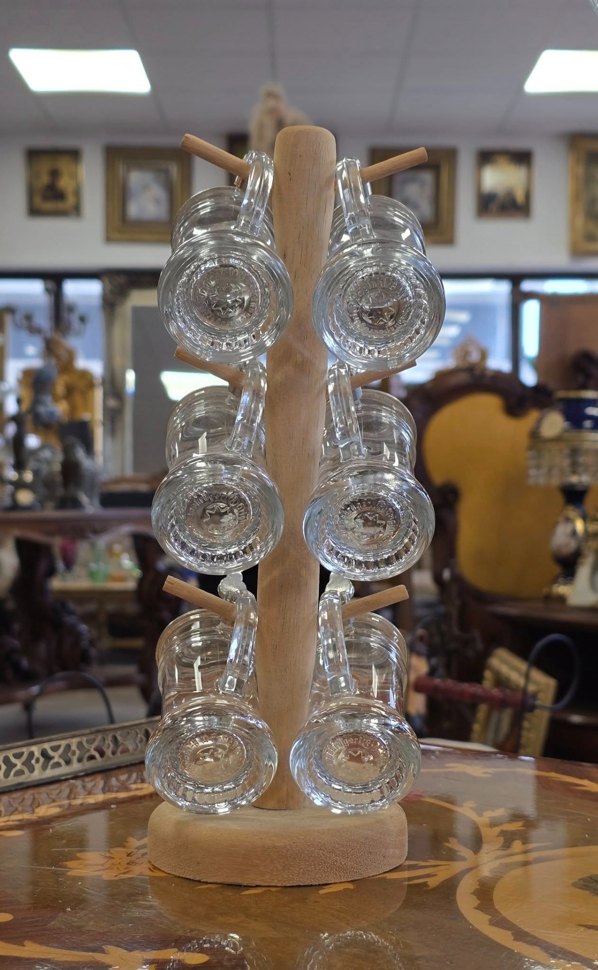 Set vintage BMF Germania, de colecție, compus din 6 păhărele pentru tărie de tip halbă cu capac și suport din lemn de tip copac (anii 1970-1980, Germania).