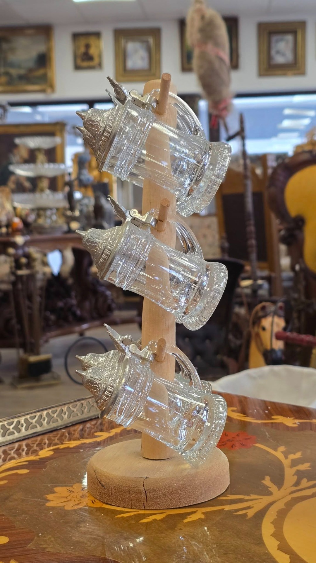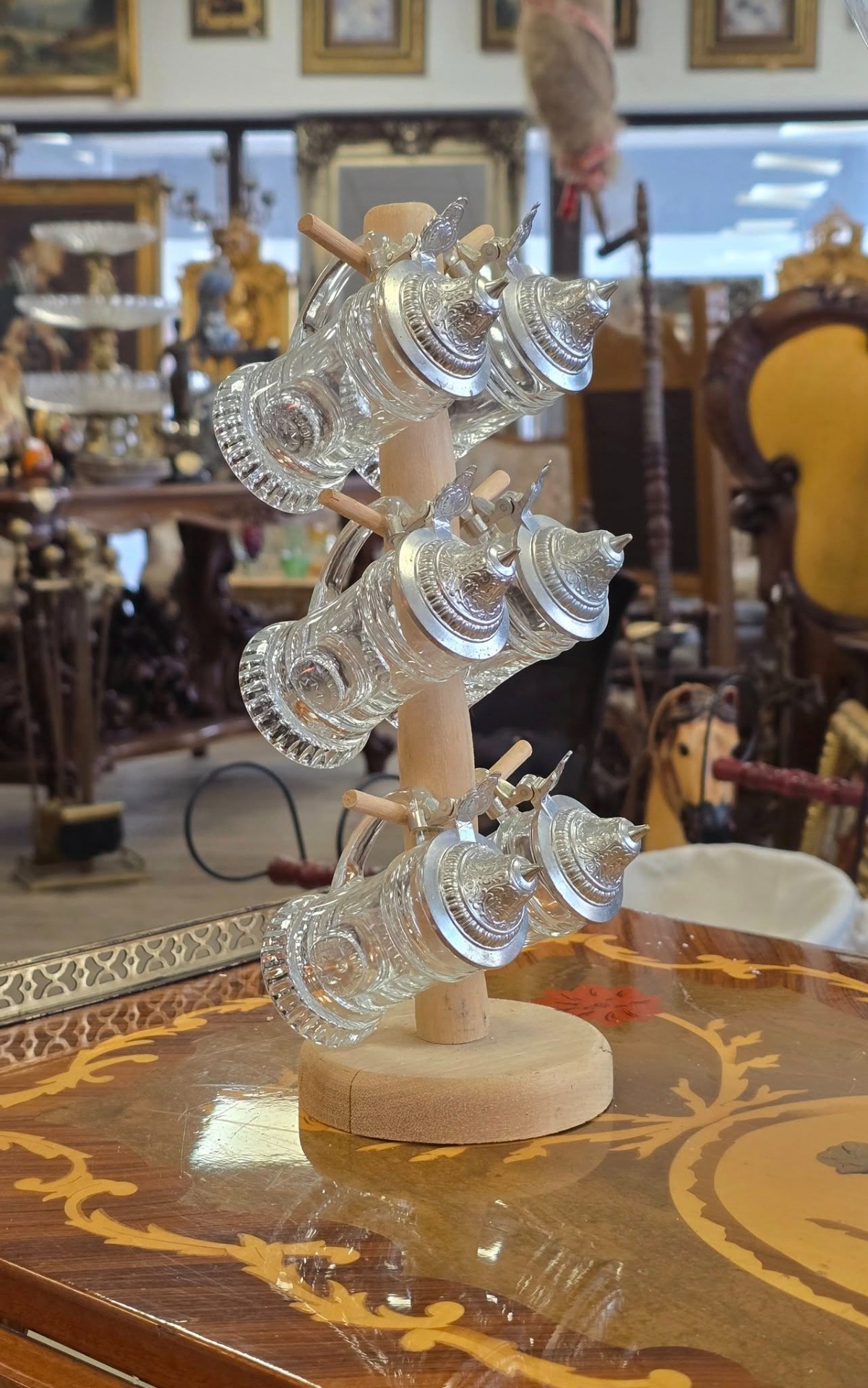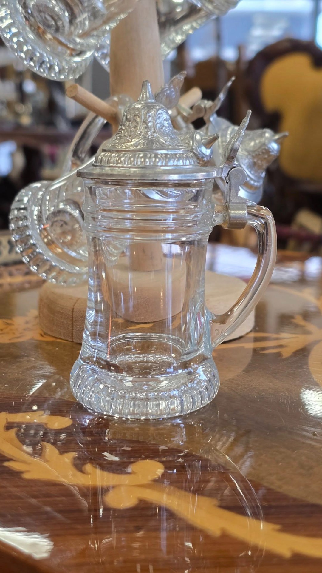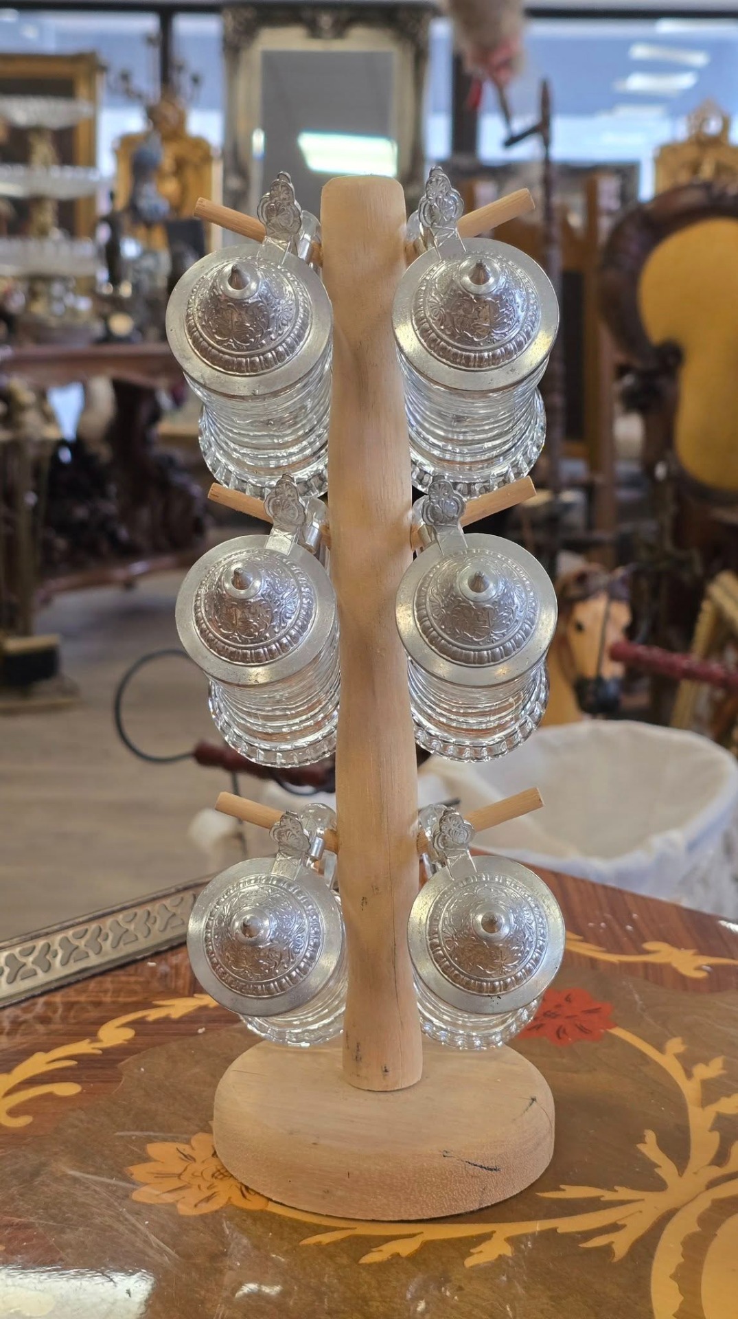 Set vintage BMF Germania, de colecție, compus din 6 păhărele pentru tărie de tip halbă cu capac și suport din lemn de tip copac (anii 1970-1980, Germania).