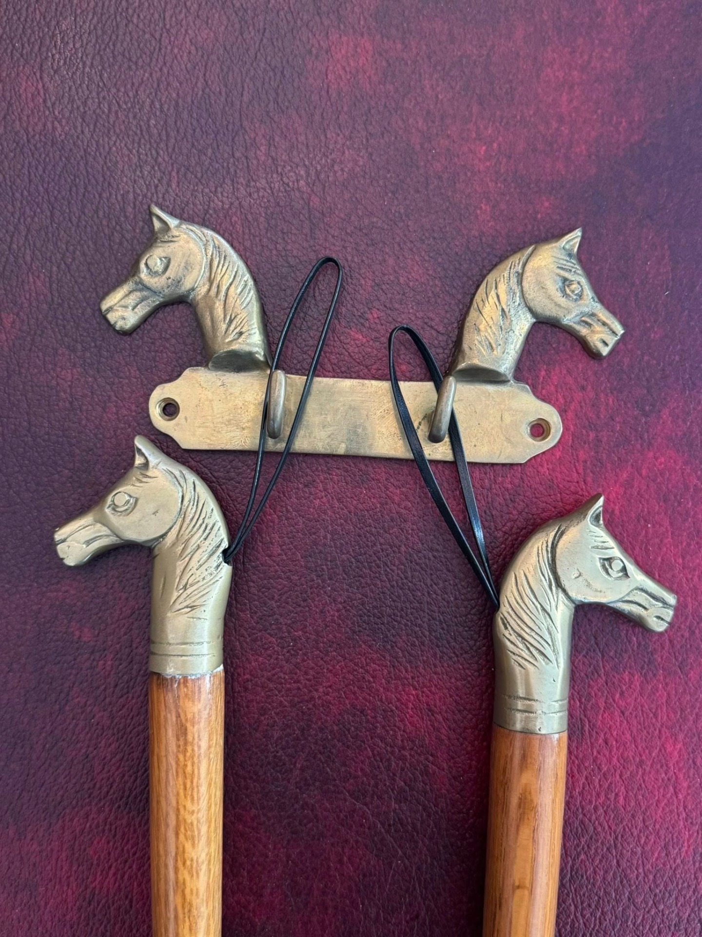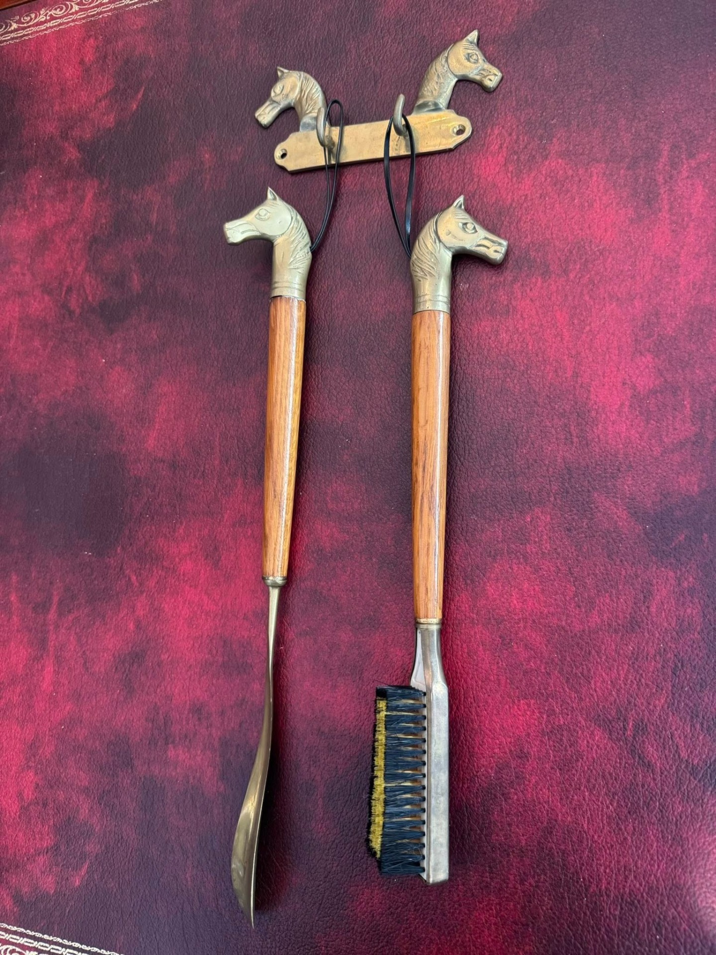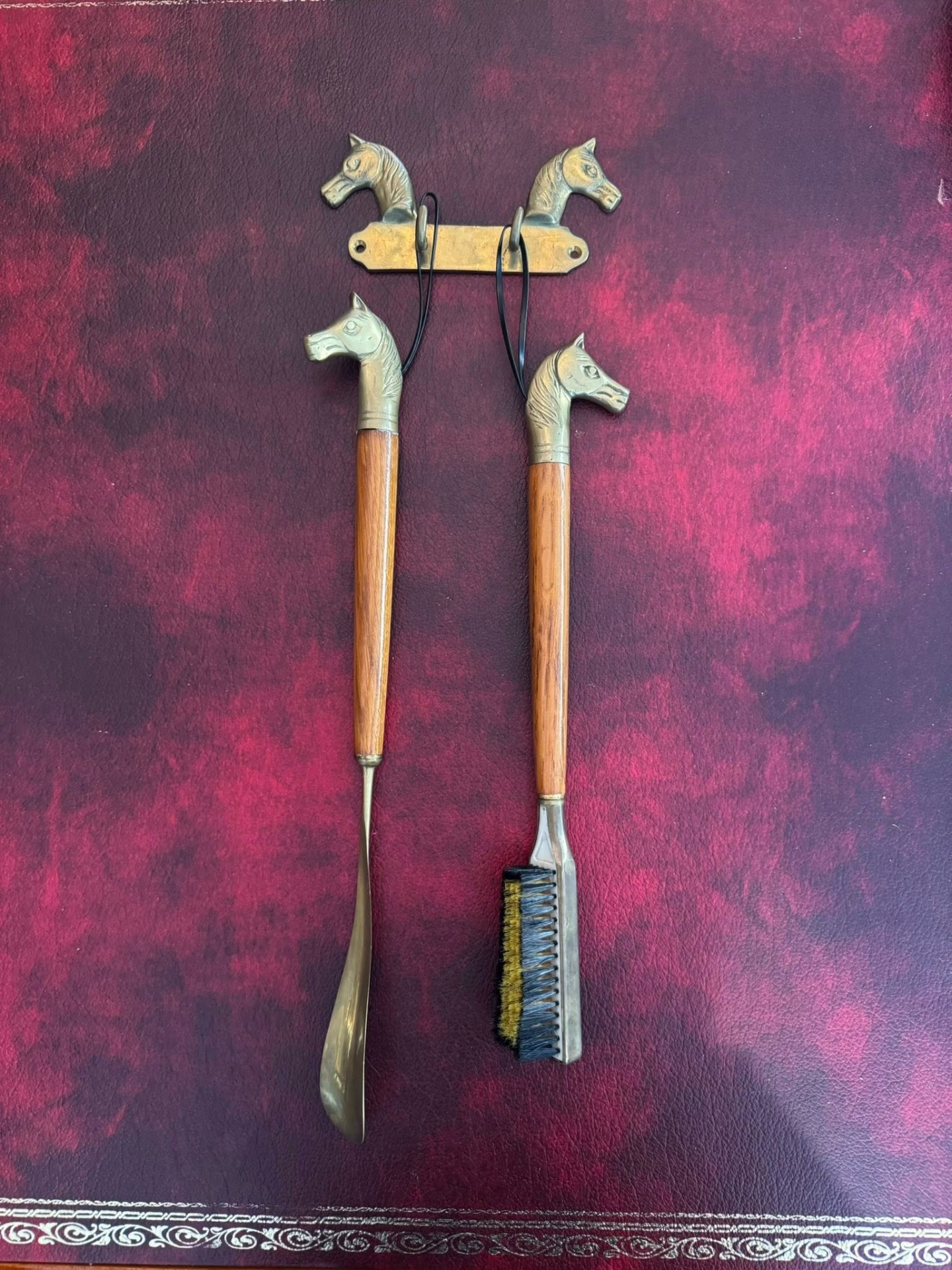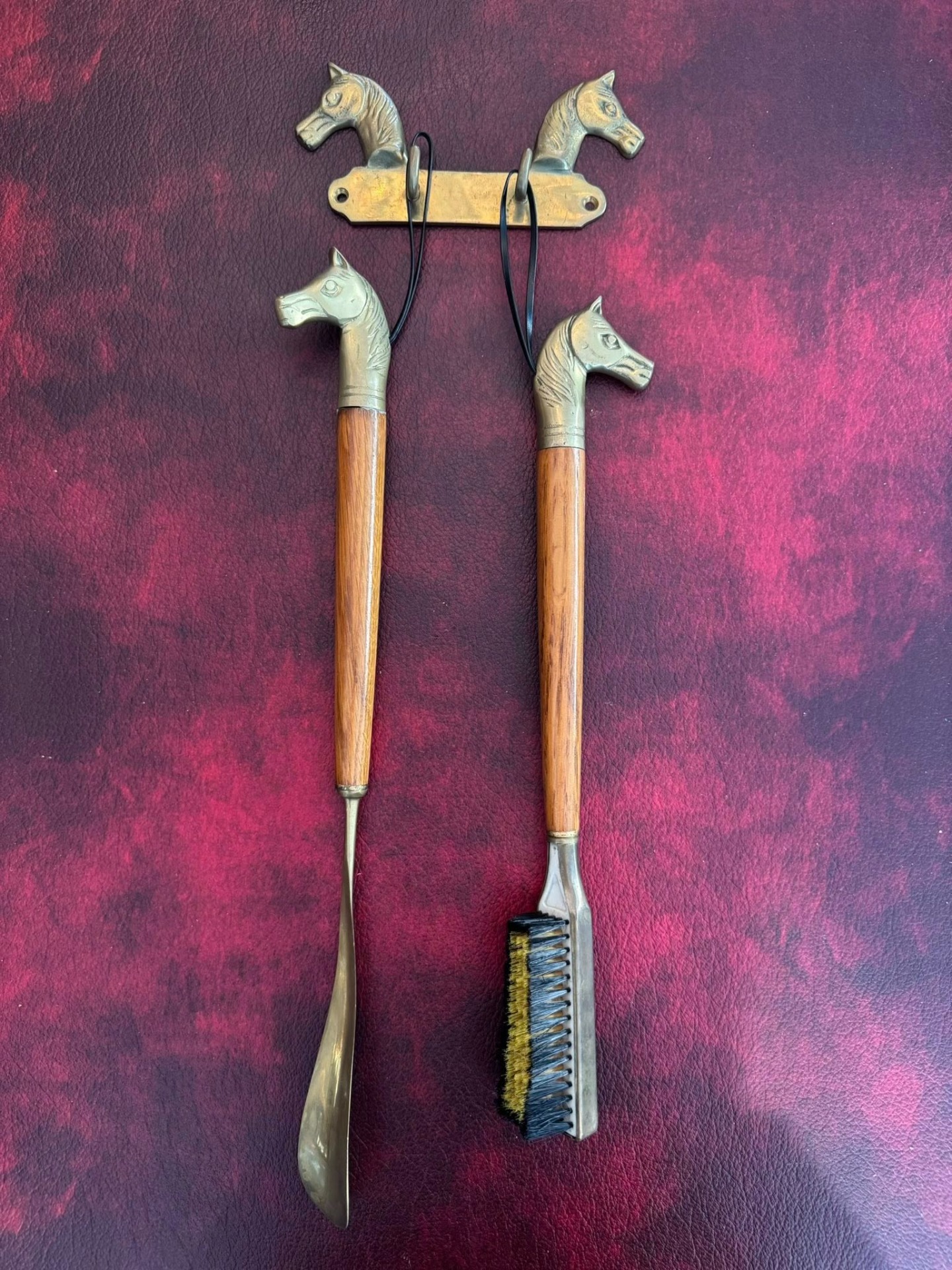 Set vintage de îngrijire a încălțămintei, compus din încălțător, perie pentru pantofi și suport de perete, realizate din bronz și lemn. (cca 1950)