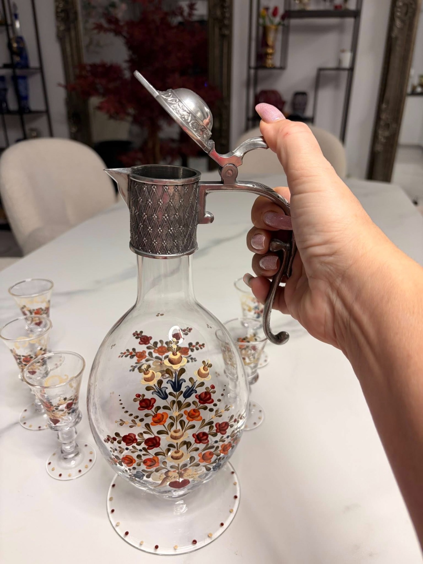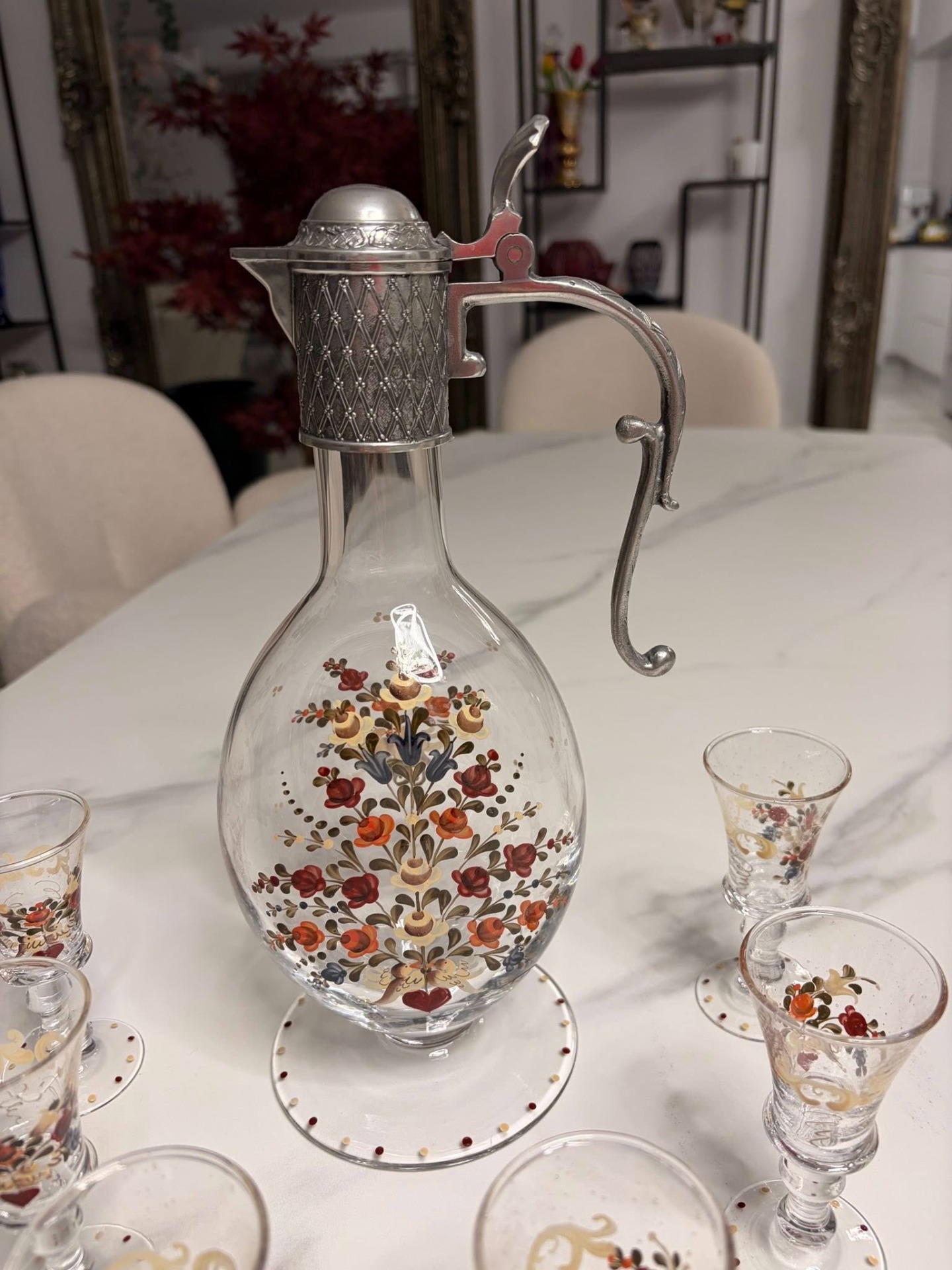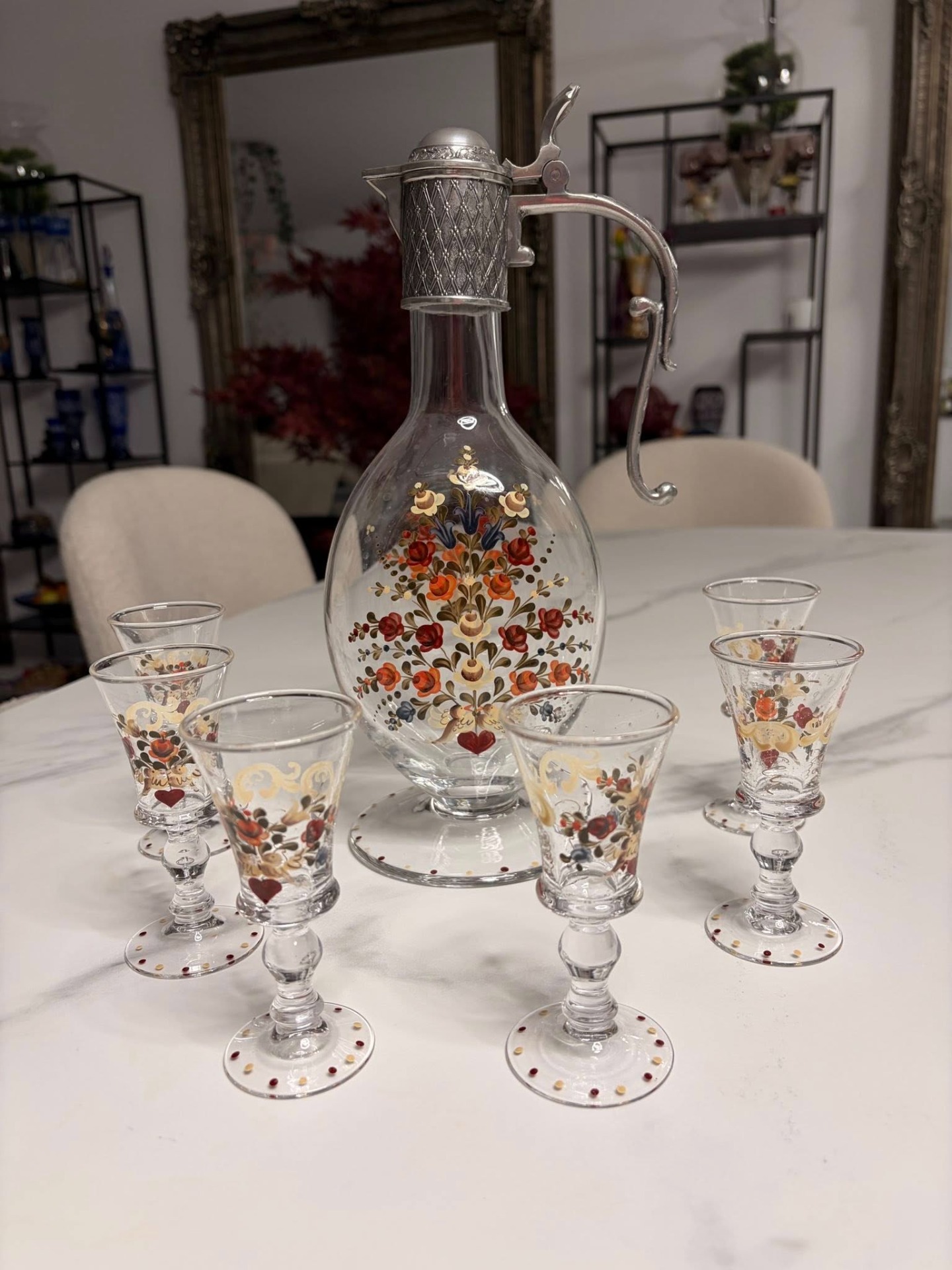 Set vintage din sticlă pictată manual – carafă cu 6 pahare