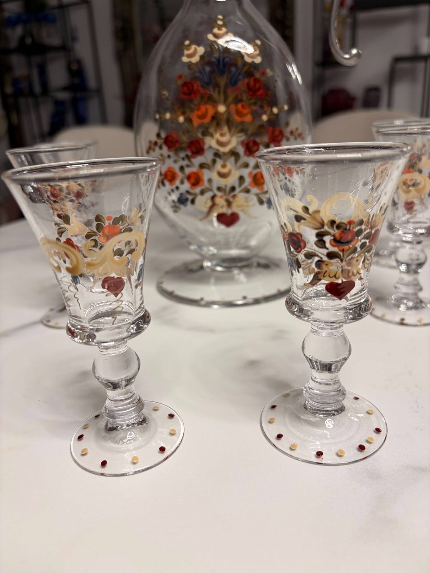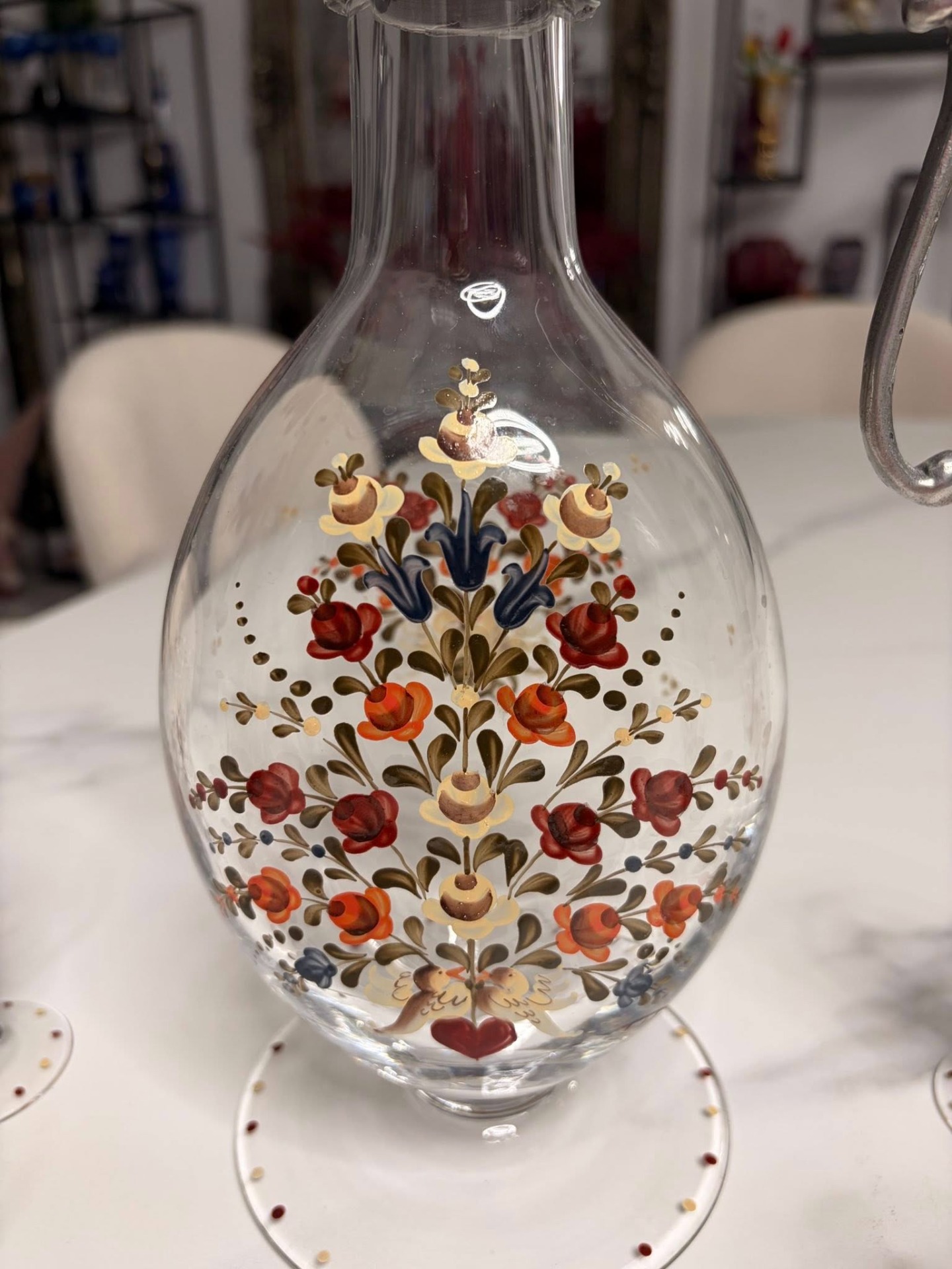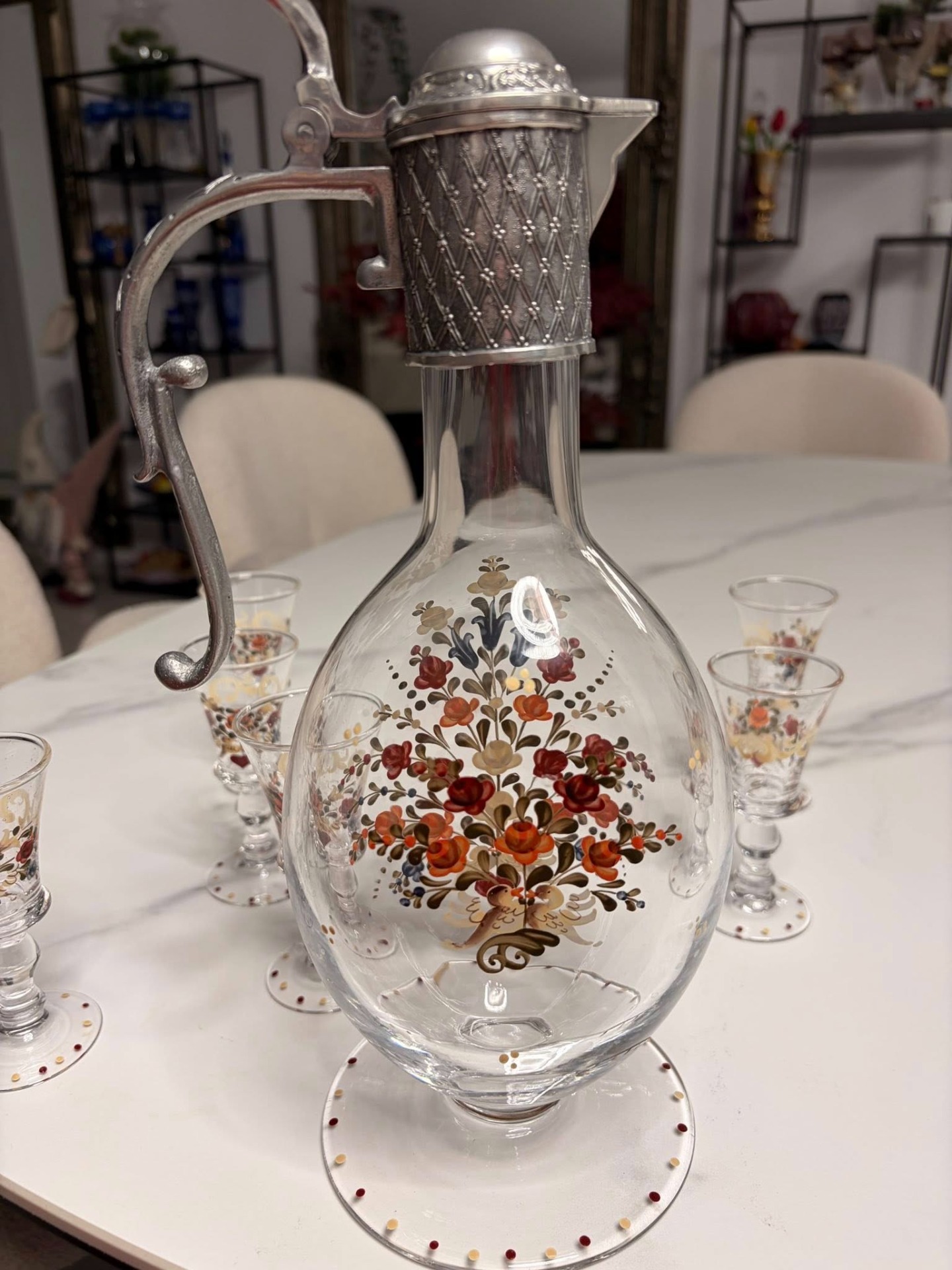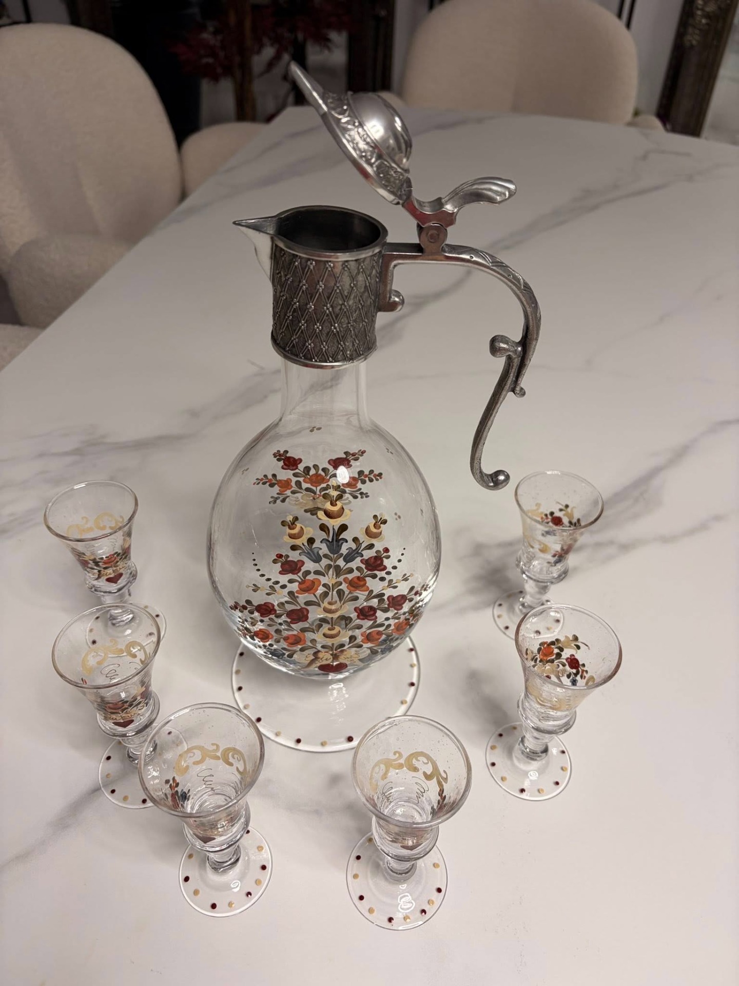 Set vintage din sticlă pictată manual – carafă cu 6 pahare