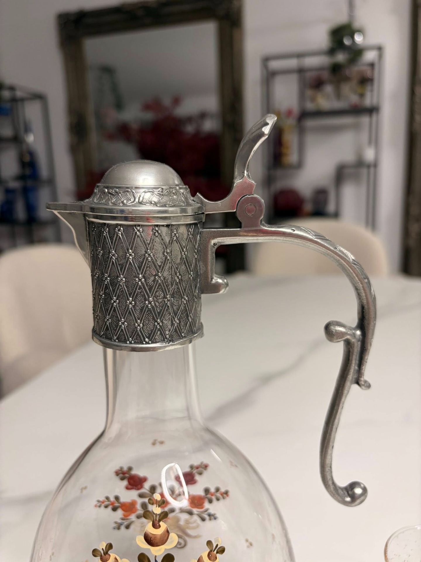 Carafa este prevăzută cu montură din zinc ornamentată, cu mecanism de închidere funcțional, specific pieselor vintage de calitate. Paharele sunt stabile, cu bază decorată manual, perfect asortate cu carafa.