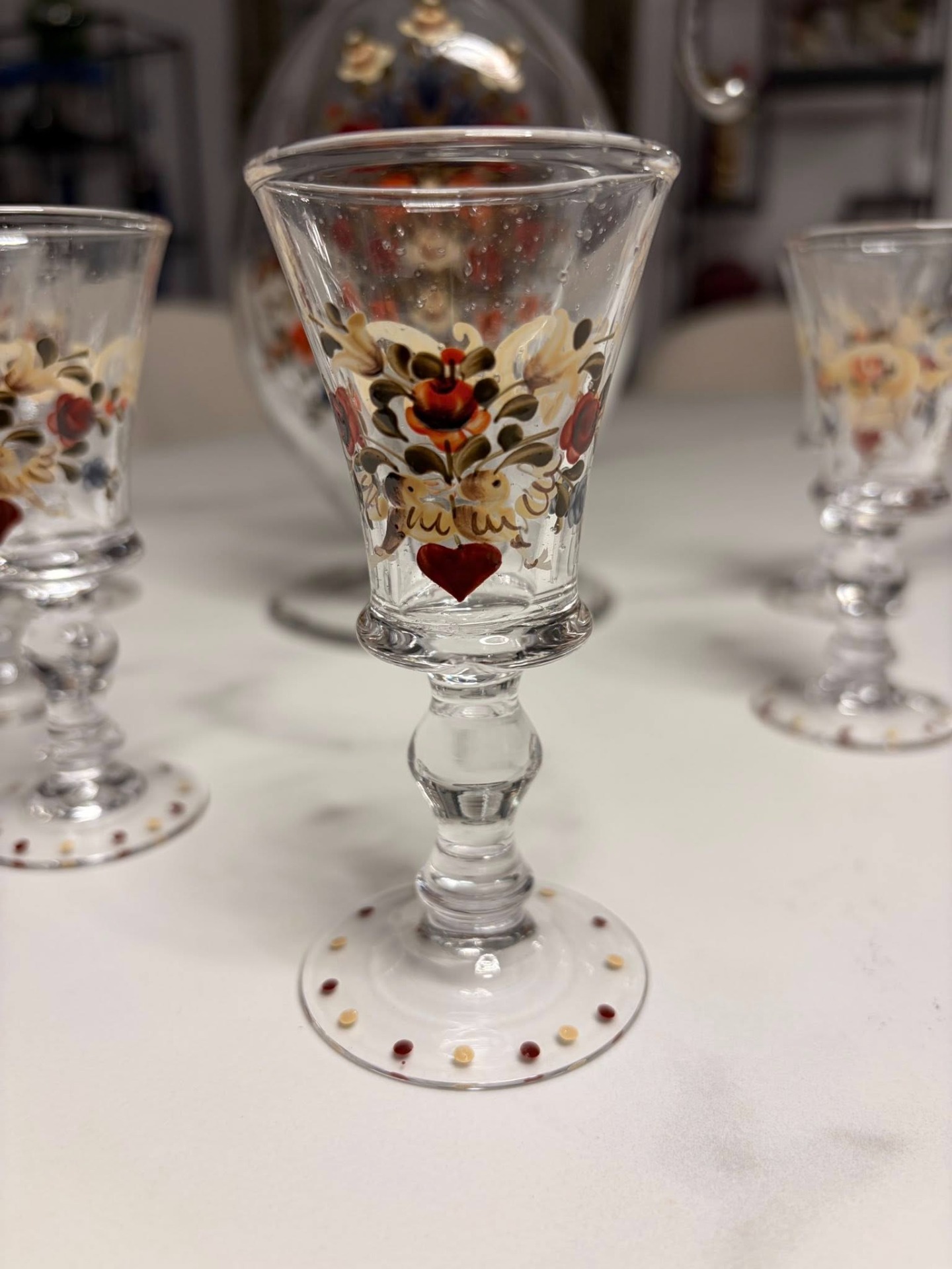 Set decorativ și funcțional, compus din 1 carafă cu capac din zinc basculant și 6 pahare pe picior, realizate din sticlă transparentă, pictată manual cu motive florale tradiționale și accente în relief. Designul este completat de detalii aurii și roșii, inclusiv inimioare stilizate, oferind un aspect elegant și cald.