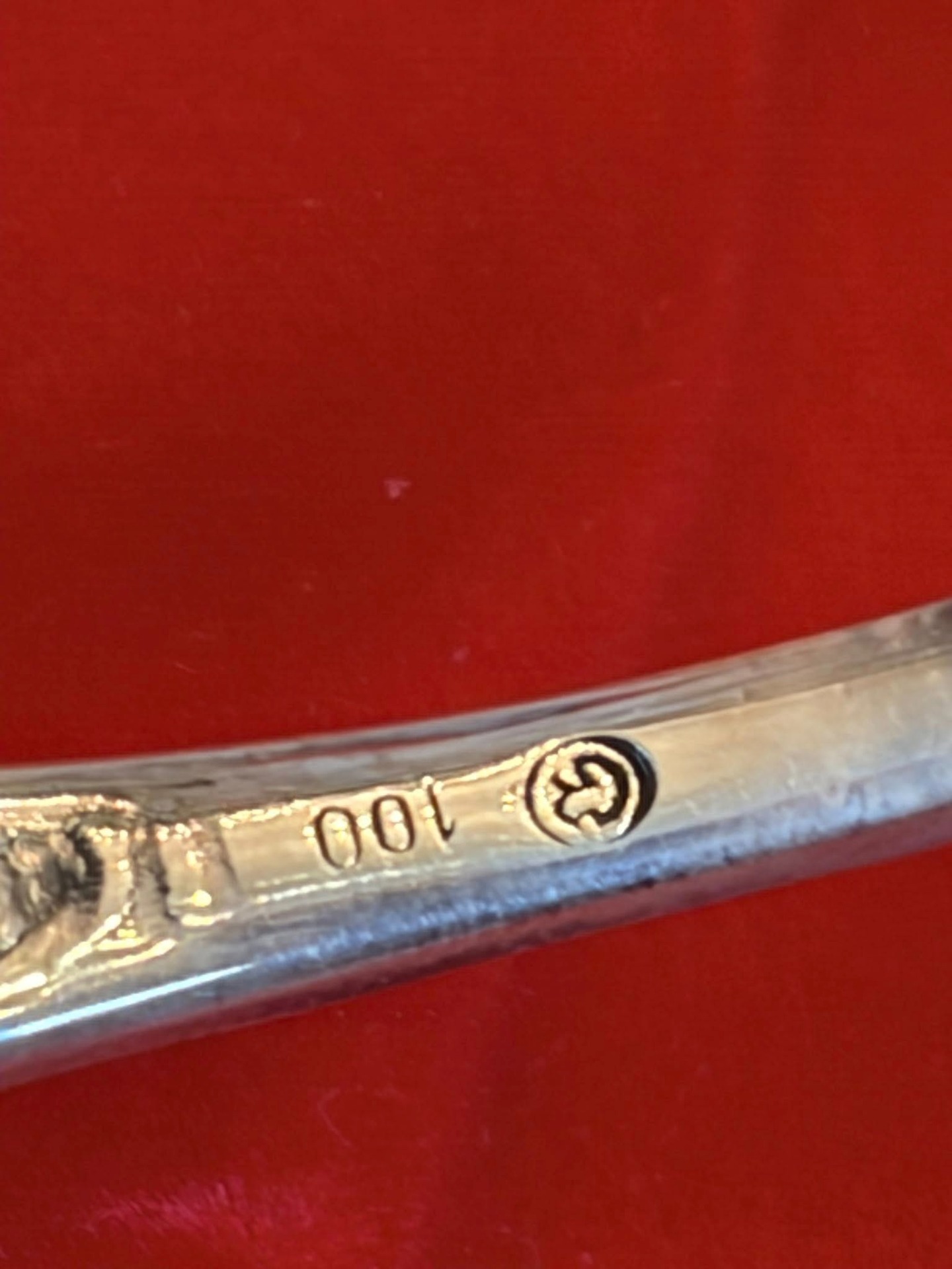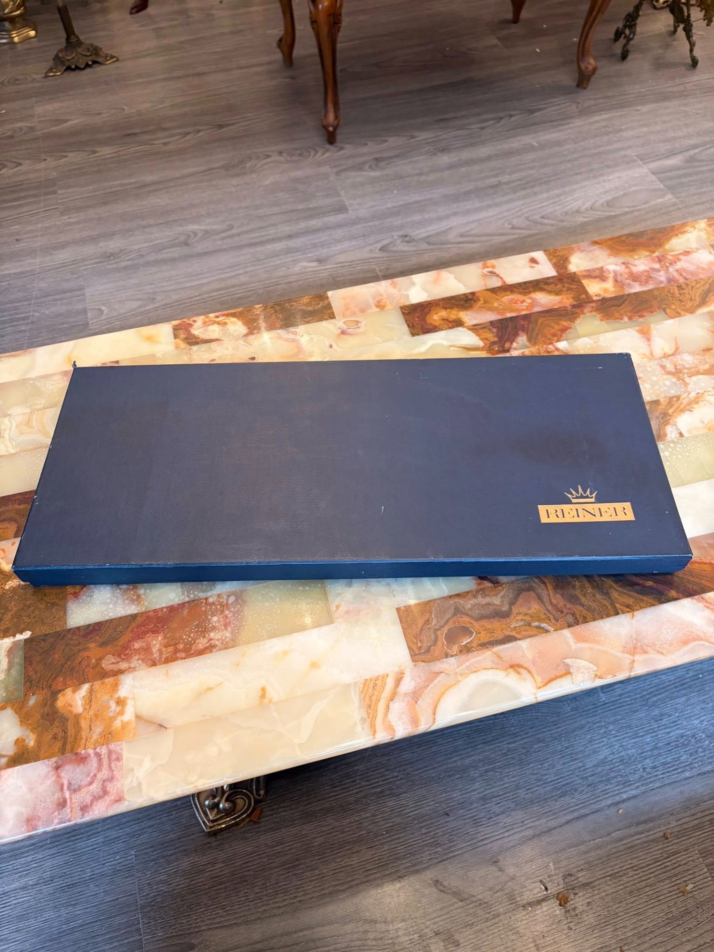 Set elegant de tacâmuri marca REINER, renumita manufactură germană de argint înființată în 1874. Setul este complet, prezentat în cutia originală, cu interior roșu din catifea și capac ilustrat cu un serviciu de ceai clasic.