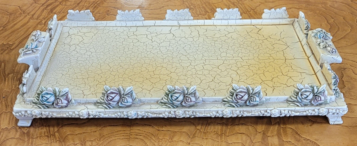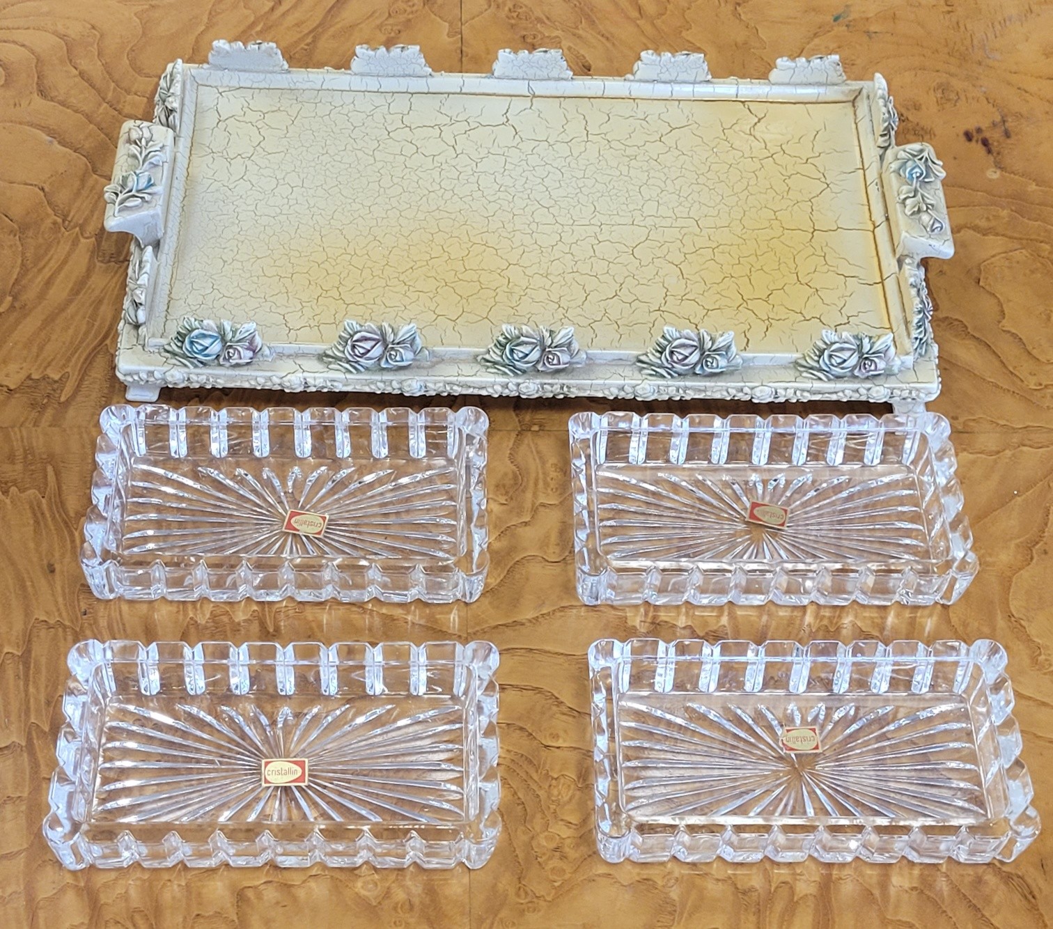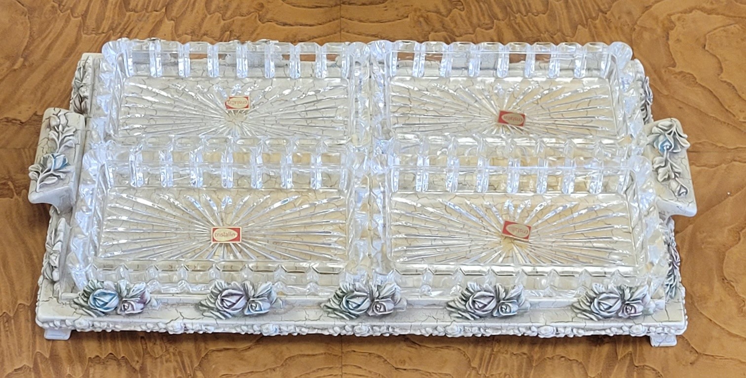 Set vintage Shabby Chic pentru aperitive, compus dintr-o tavă realizată în stil rustic-elegant, cu un finisaj tip "crackled" (vopsea crăpată) de culoare "ivoire", decorată manual cu motive florale (trandafiri) în relief, cu accente delicate de albastru și roz pudrat și 4 boluri din cristal de înaltă calitate, cu model geometric clasic care reflectă frumos lumina.