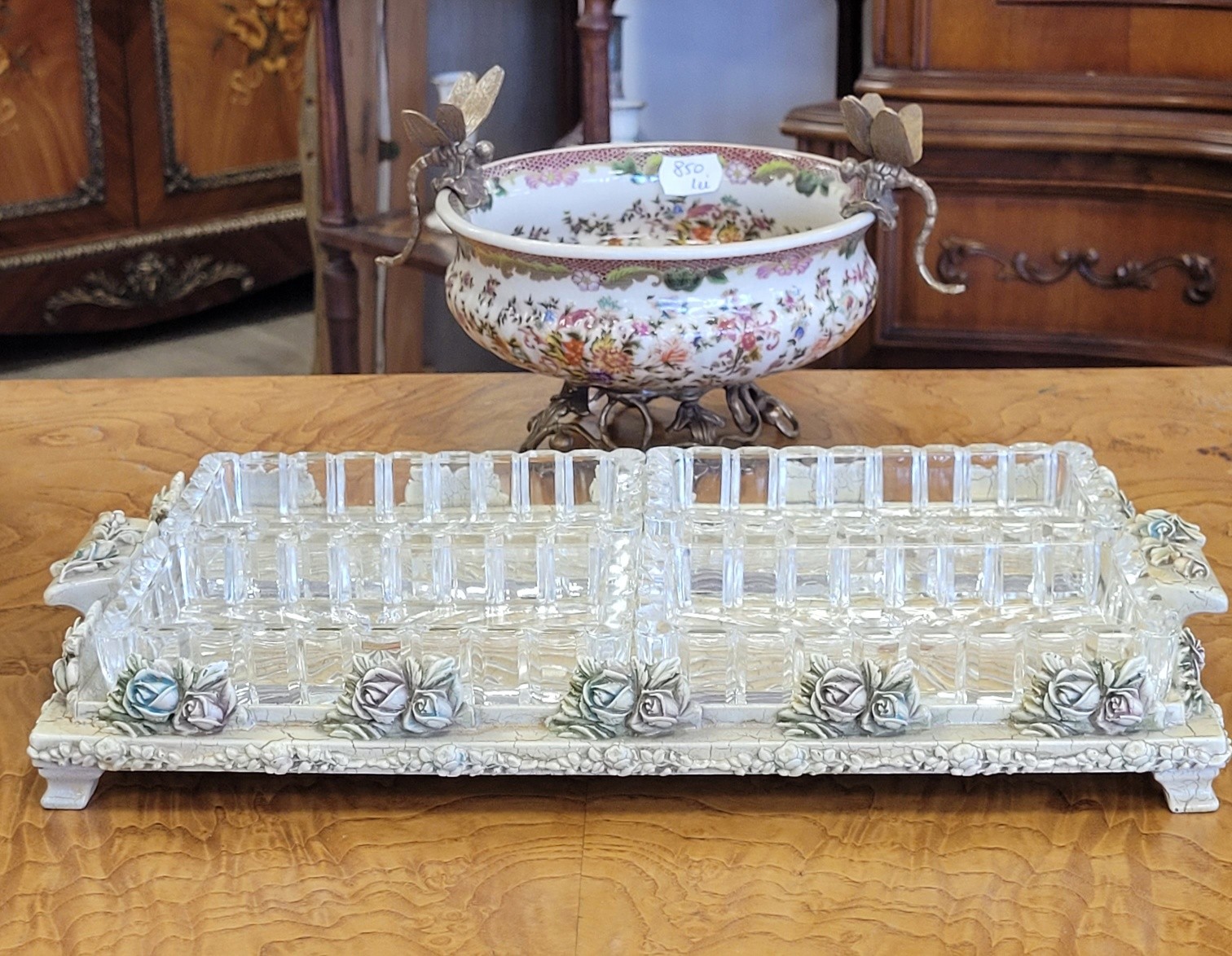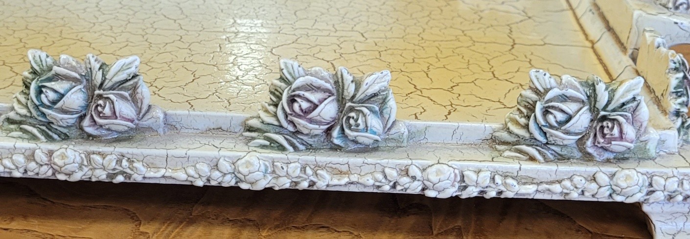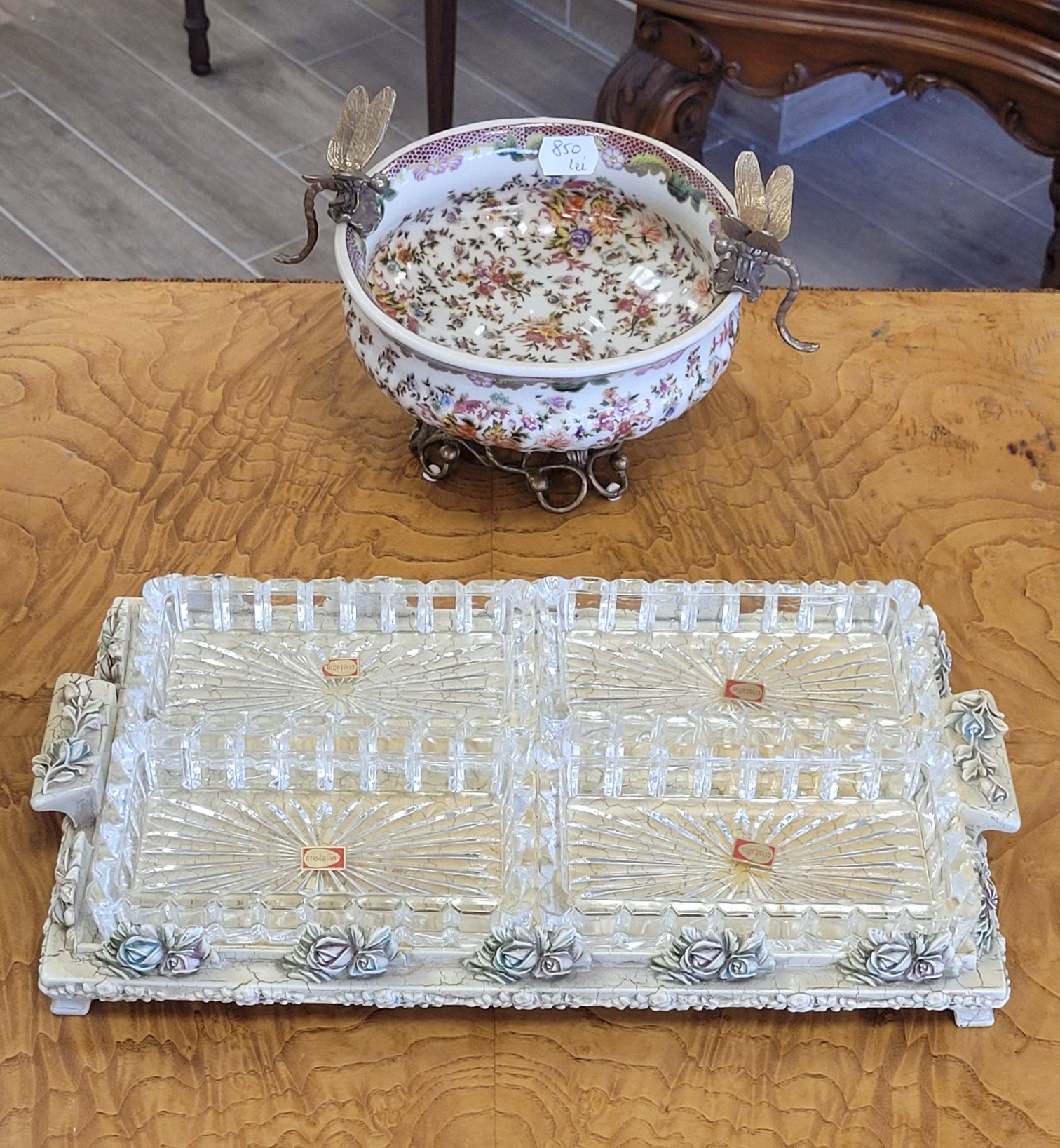 Set vintage Shabby Chic pentru aperitive, compus dintr-o tavă realizată în stil rustic-elegant, cu un finisaj tip "crackled" (vopsea crăpată) de culoare "ivoire", decorată manual cu motive florale (trandafiri) în relief, cu accente delicate de albastru și roz pudrat și 4 boluri din cristal de înaltă calitate, cu model geometric clasic care reflectă frumos lumina.