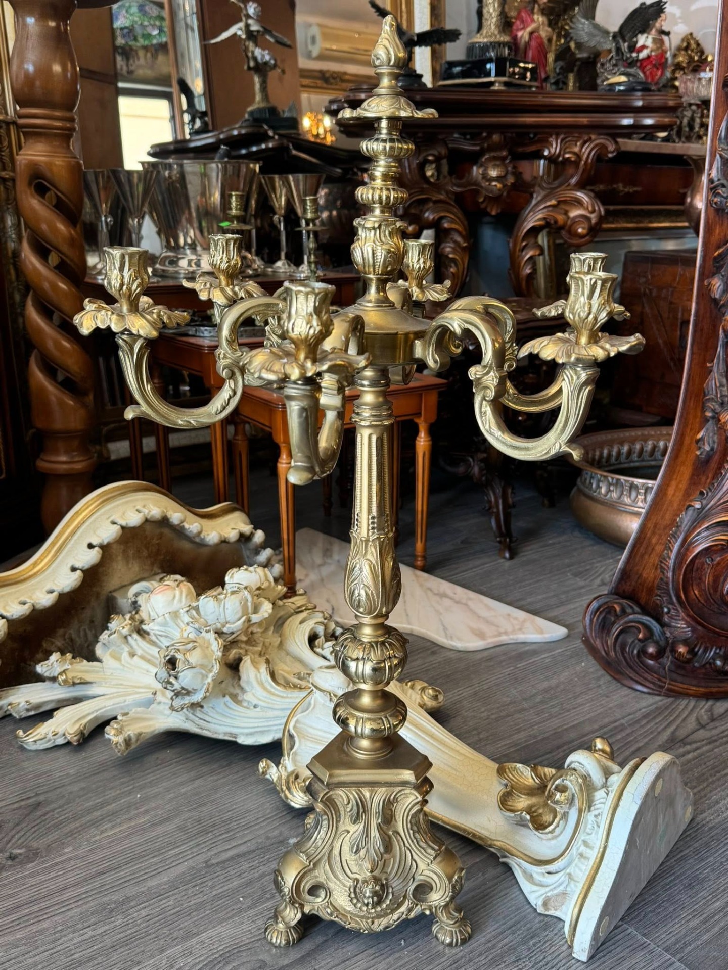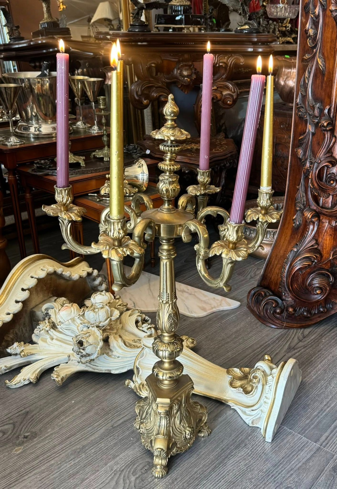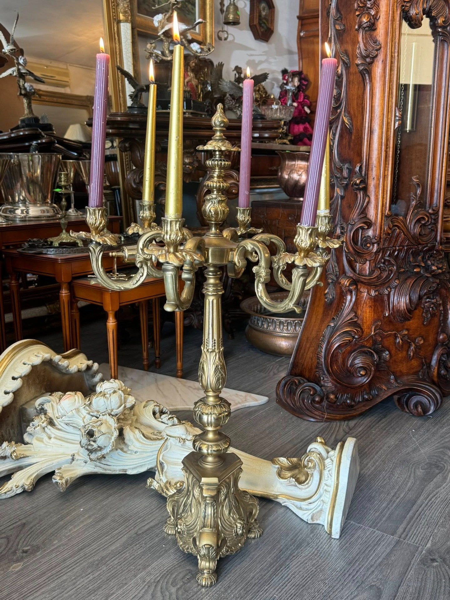 Sfeșnic de dimensiuni mari din bronz, cu un design impunător, realizat într-un stil eclectic care îmbină elemente Baroce și Rococo. (Italia, cca 1910)