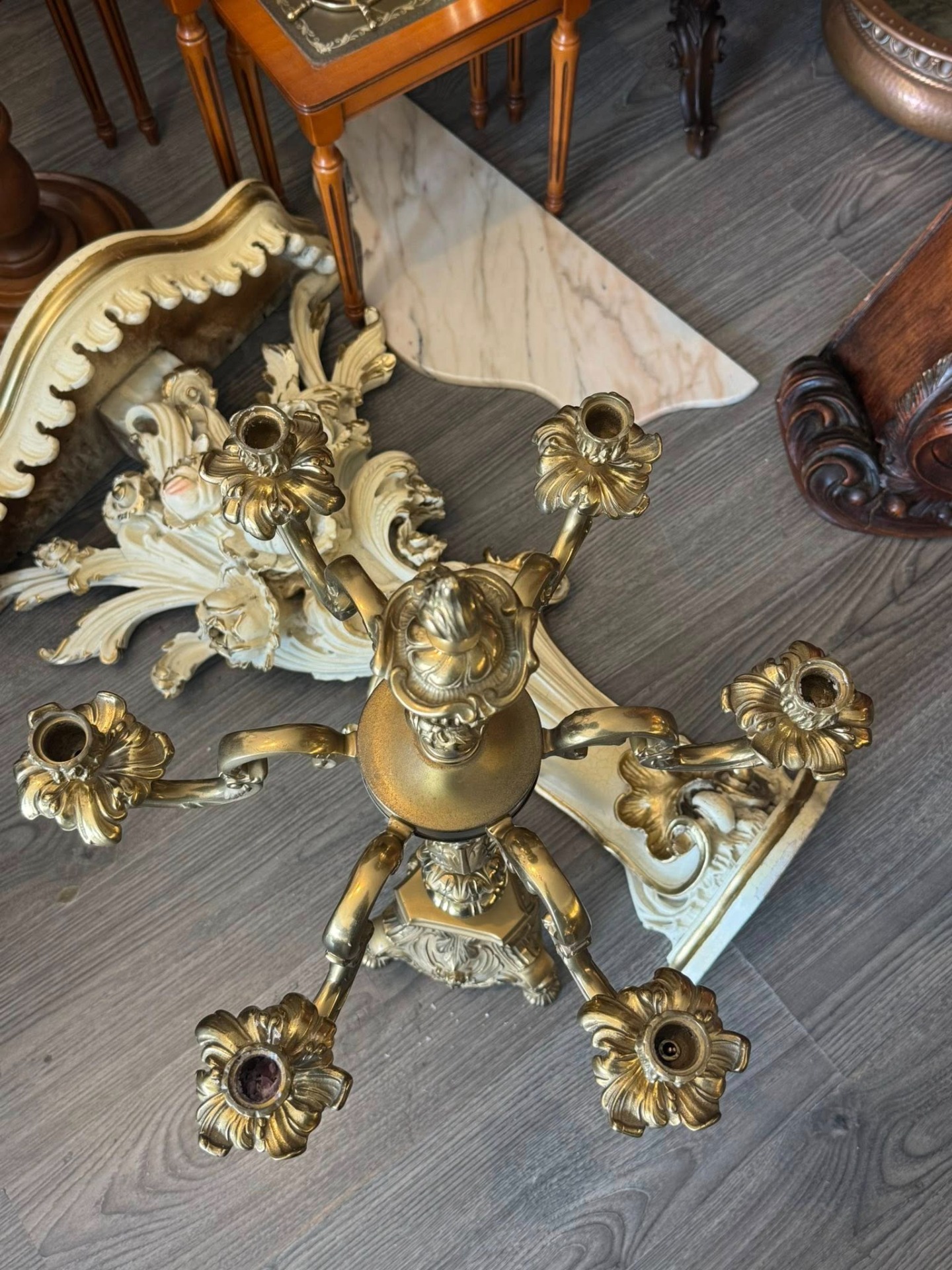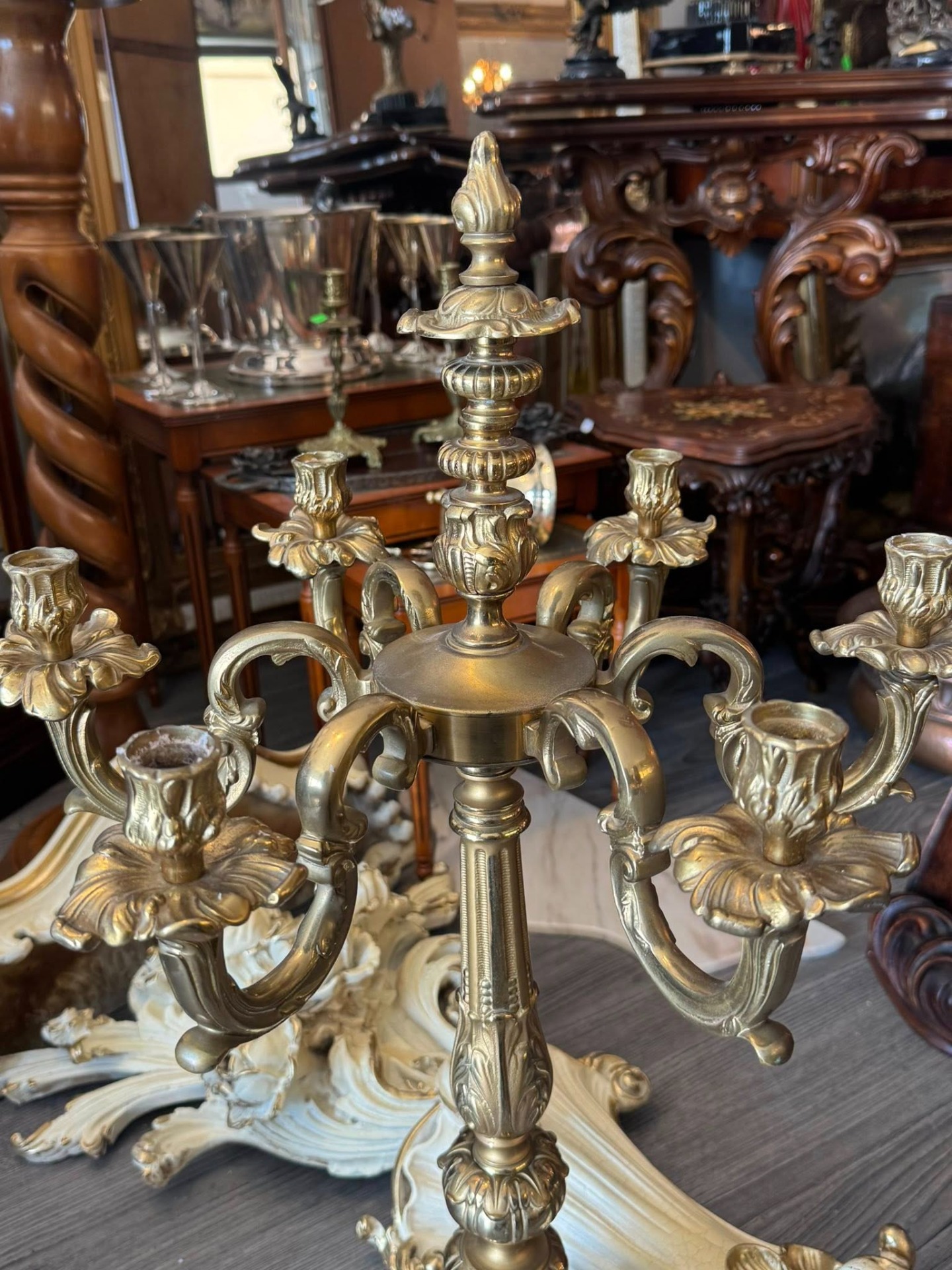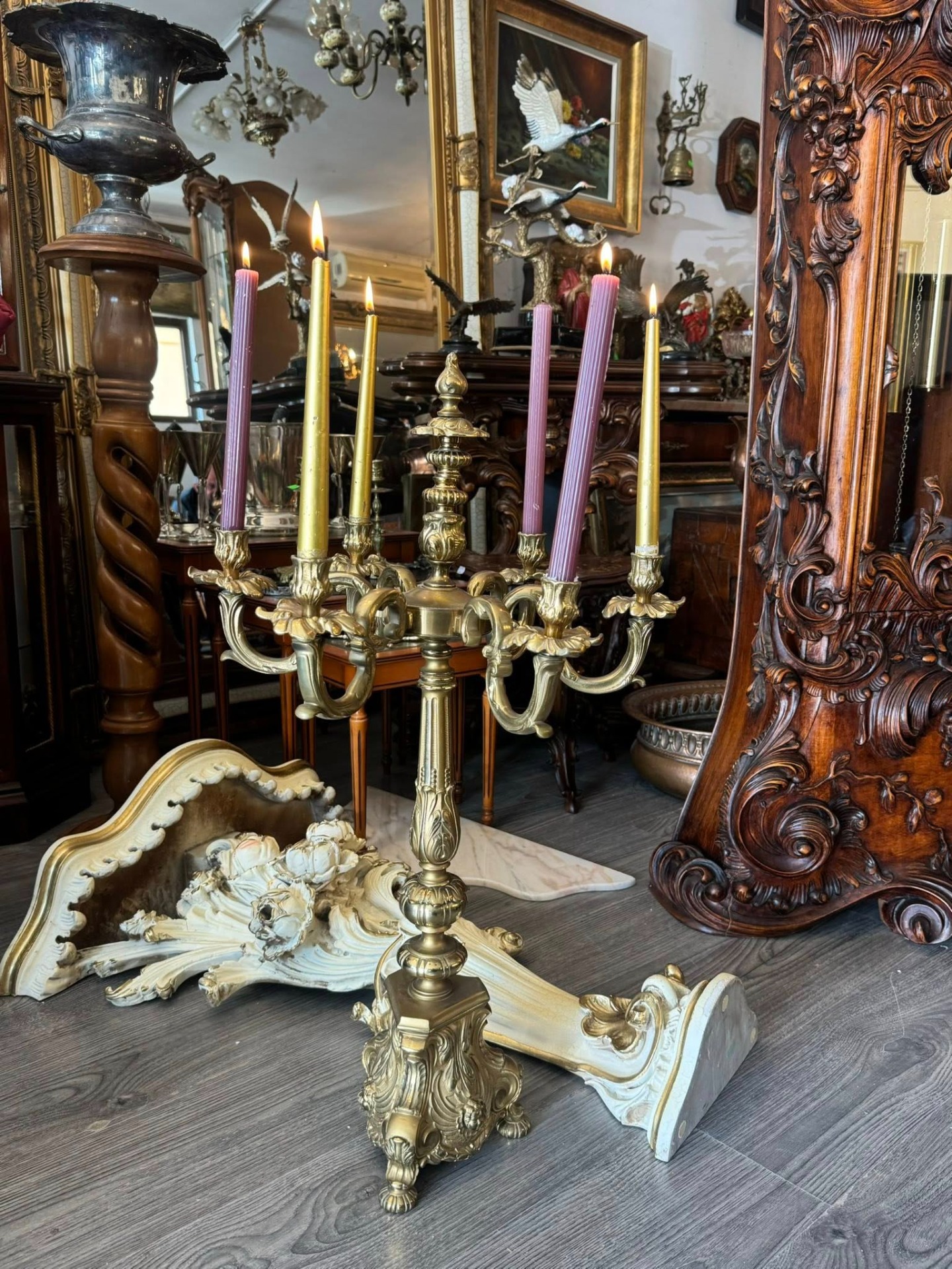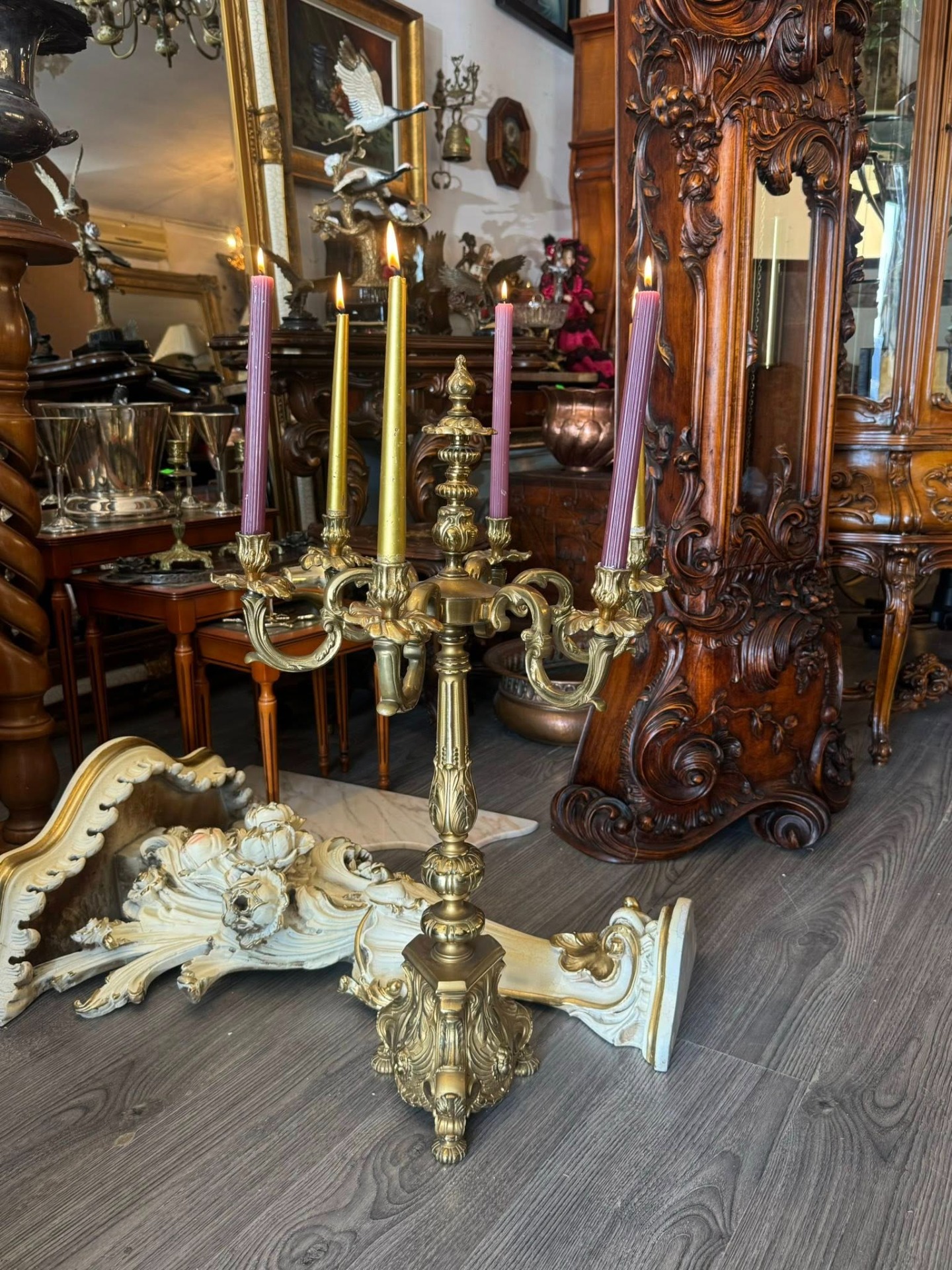 Sfeșnic de dimensiuni mari din bronz, cu un design impunător, realizat într-un stil eclectic care îmbină elemente Baroce și Rococo. (Italia, cca 1910)