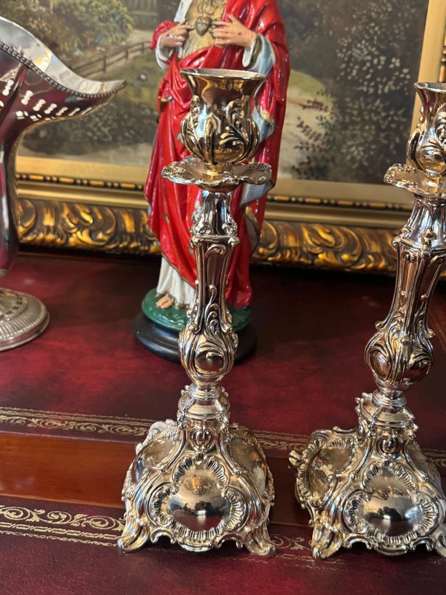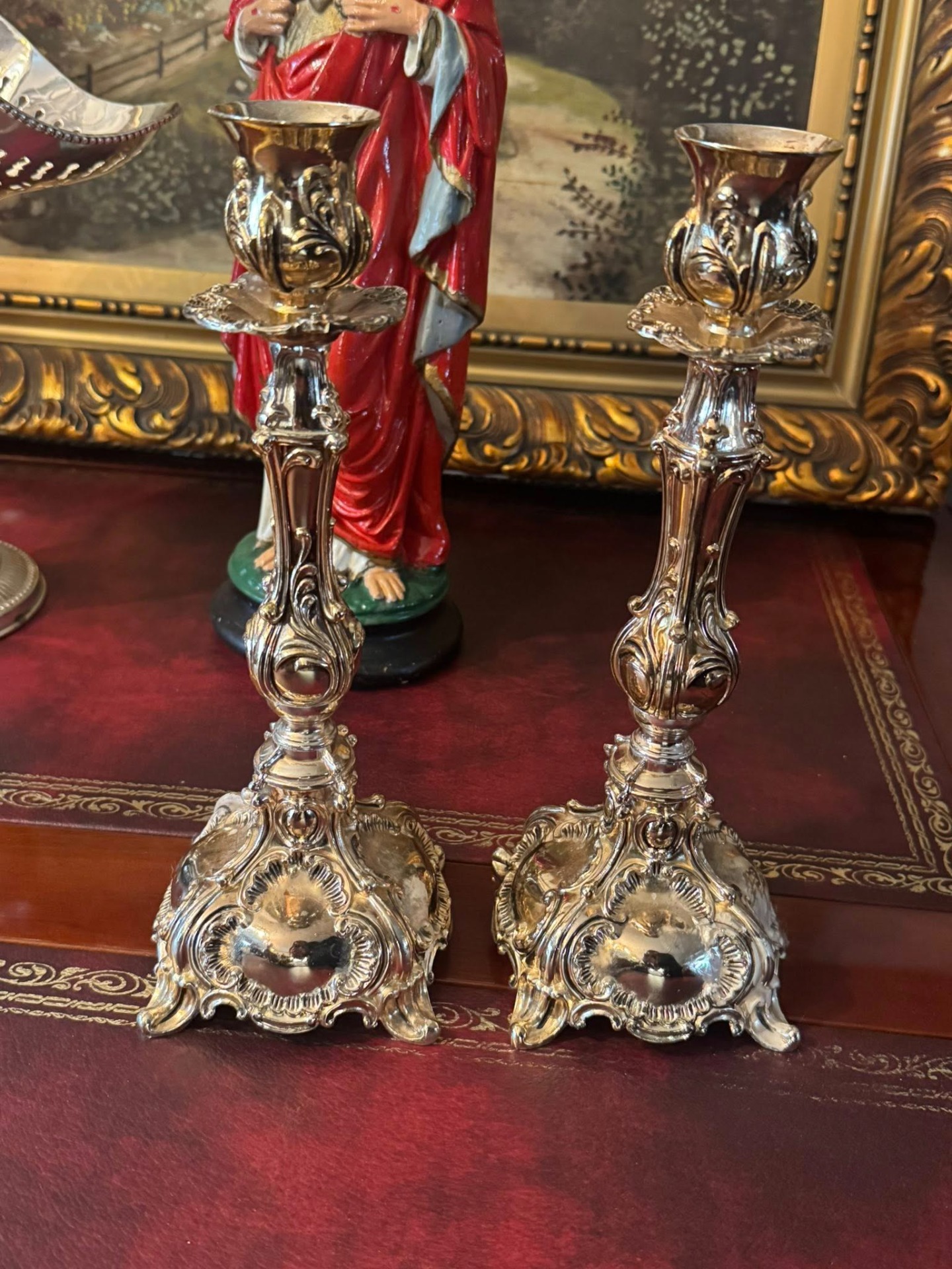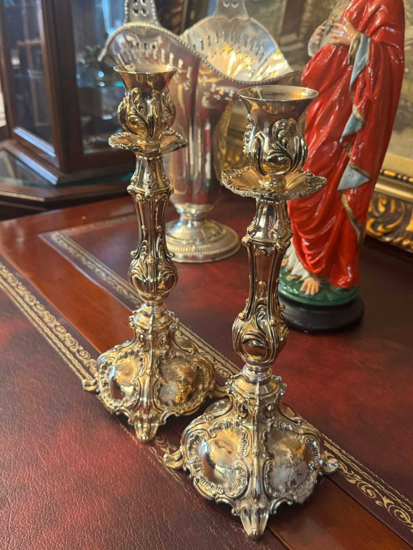Sfeșnice impresionante, realizate într-un stil care amintește de perioada Rococo, caracterizată prin forme curbe, detalii florale și o bază evazată, bogat ornamentată. (Franța, cca 1900)