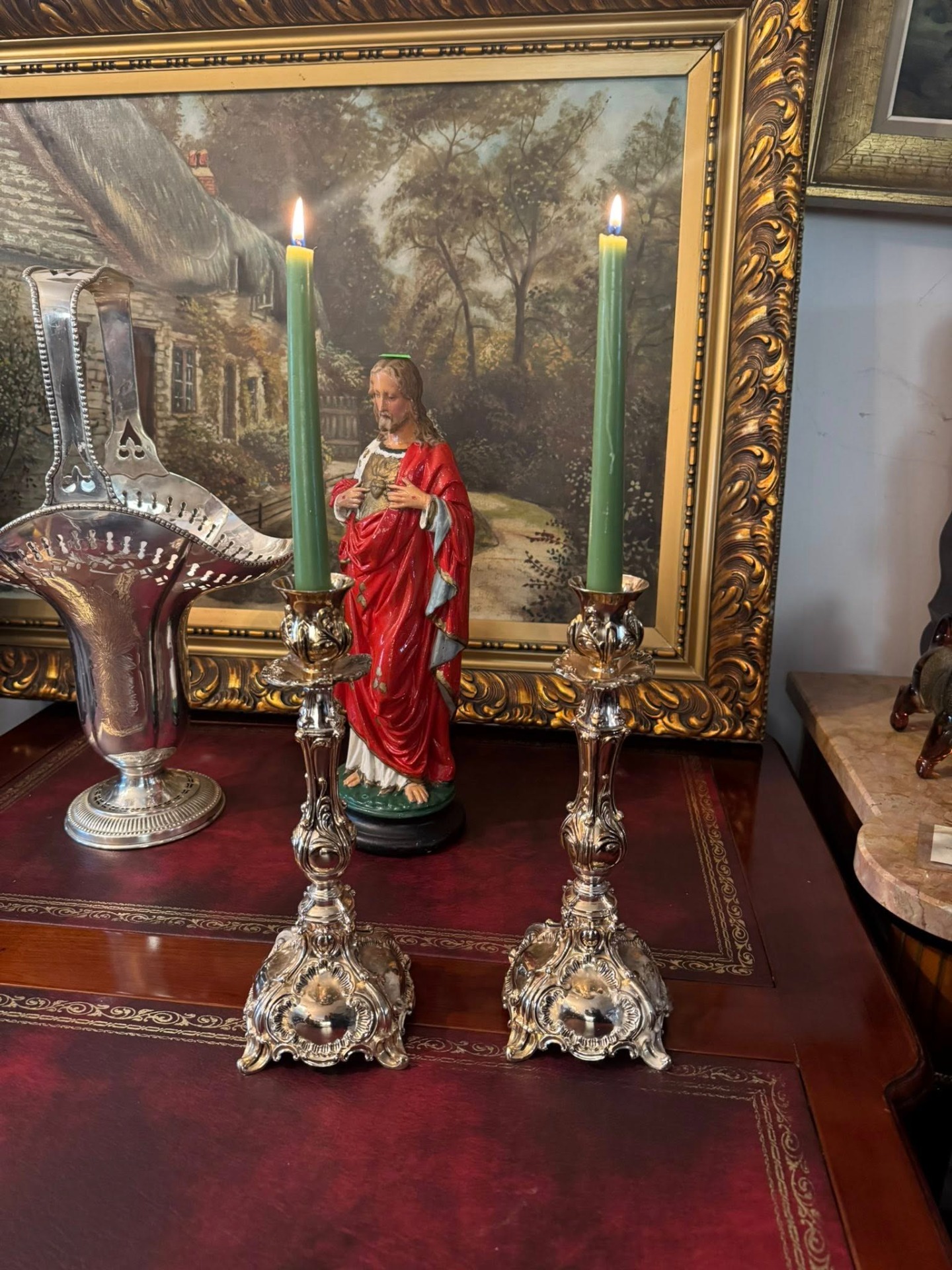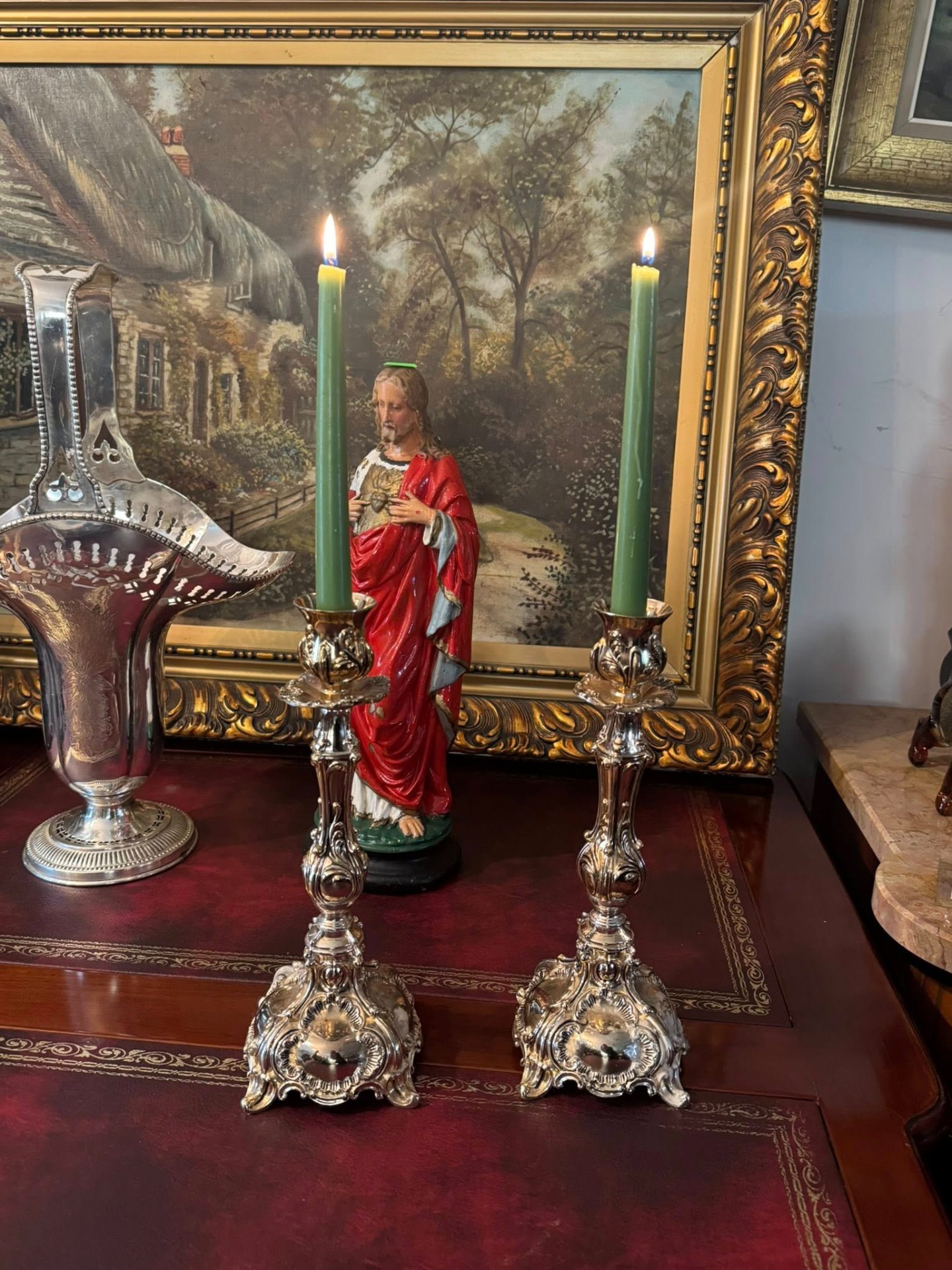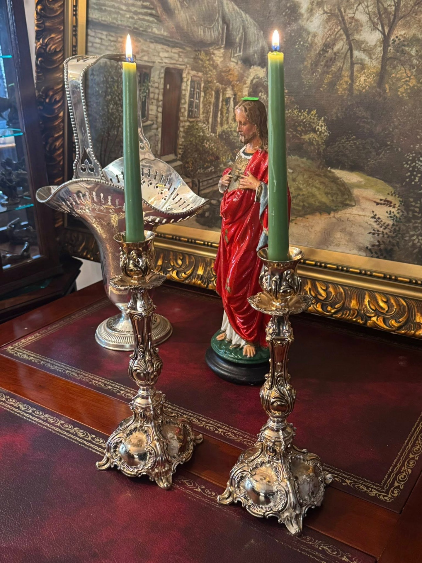 Sfeșnice impresionante, realizate într-un stil care amintește de perioada Rococo, caracterizată prin forme curbe, detalii florale și o bază evazată, bogat ornamentată. (Franța, cca 1900)