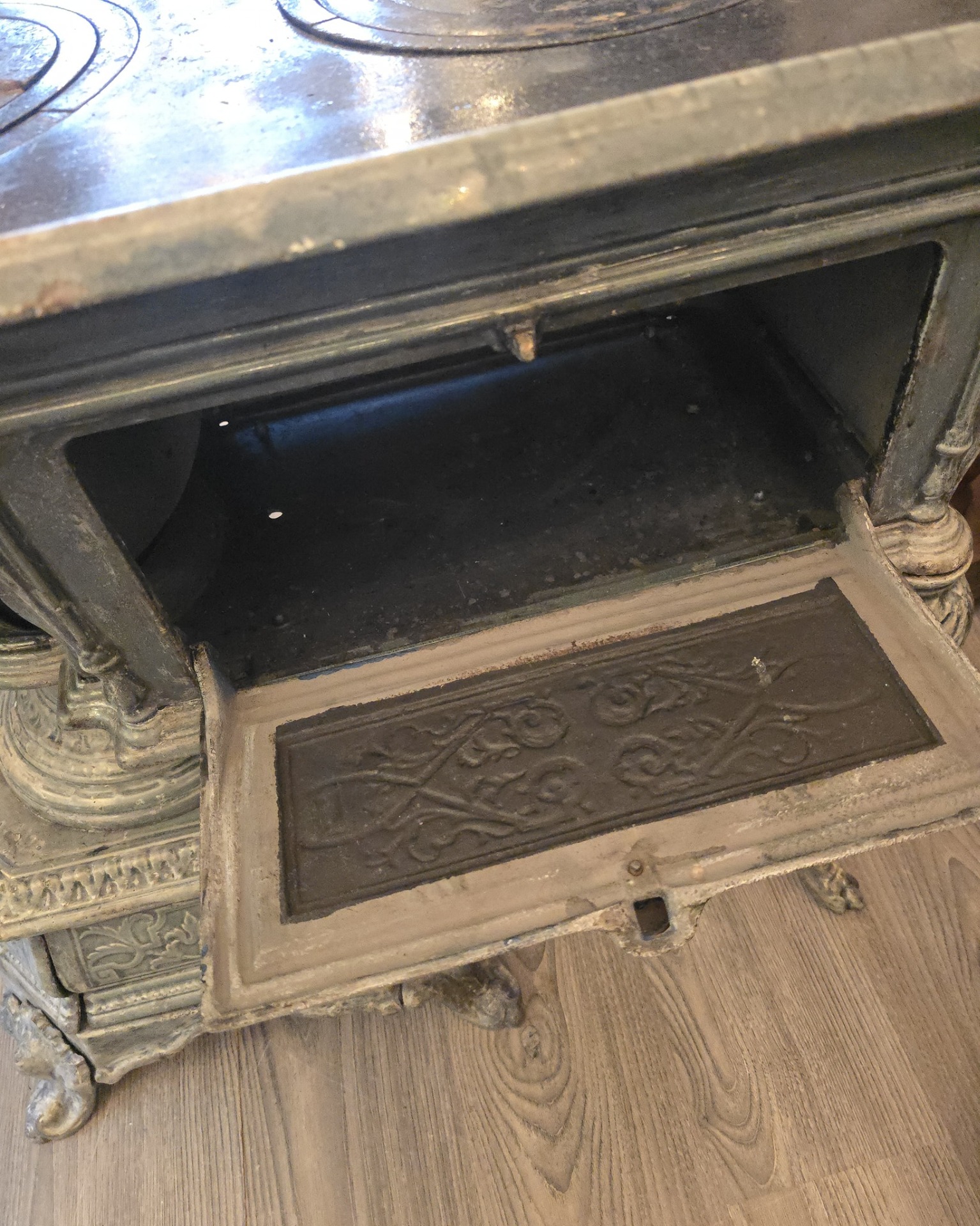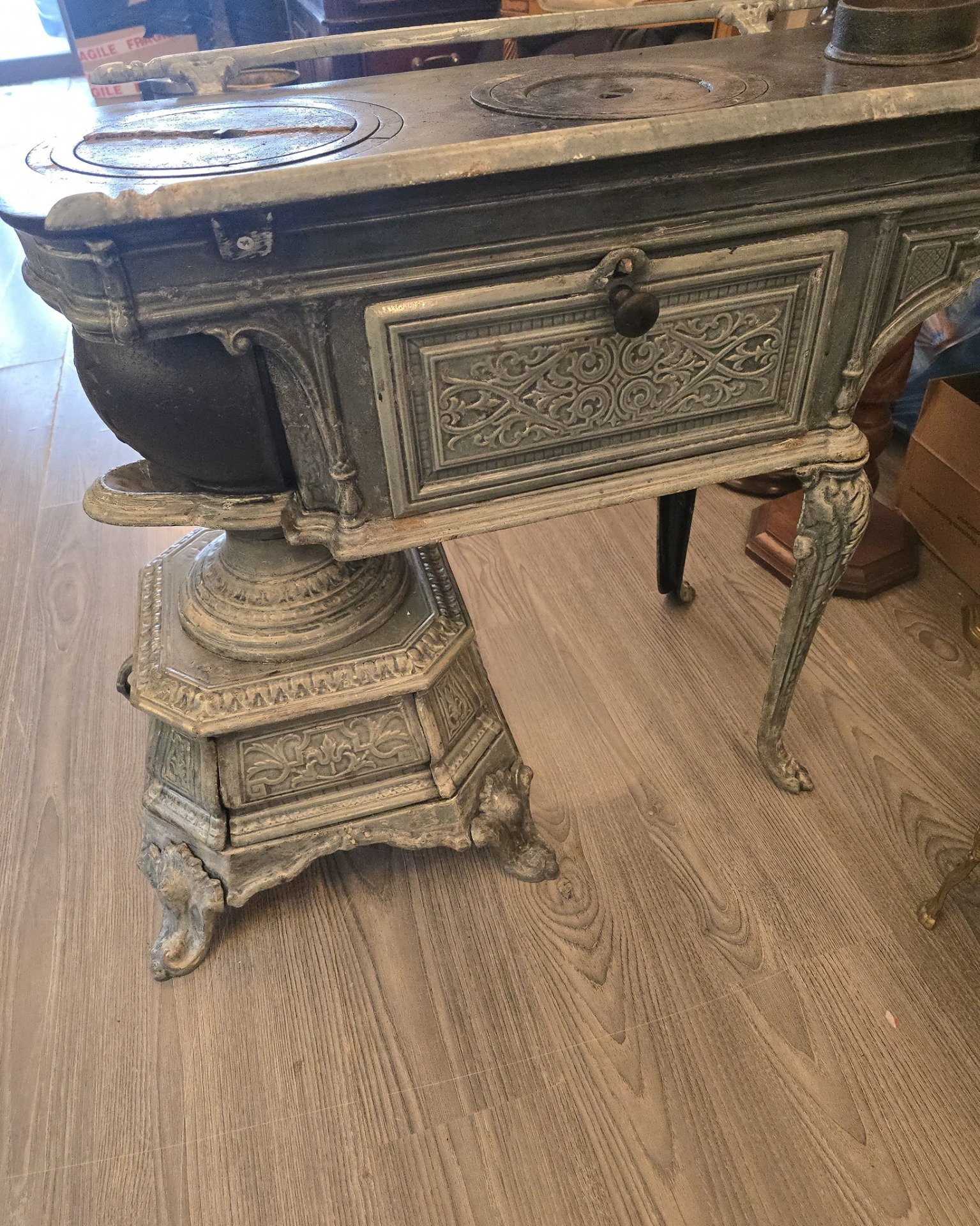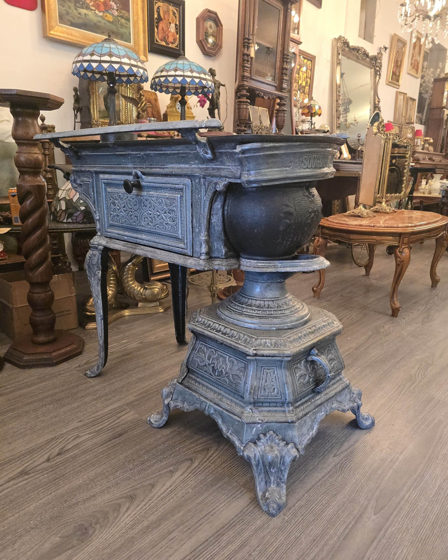 Prezintă motive florale/volute pe panoul frontal (dacă este o ușă) și pe baza octogonală.