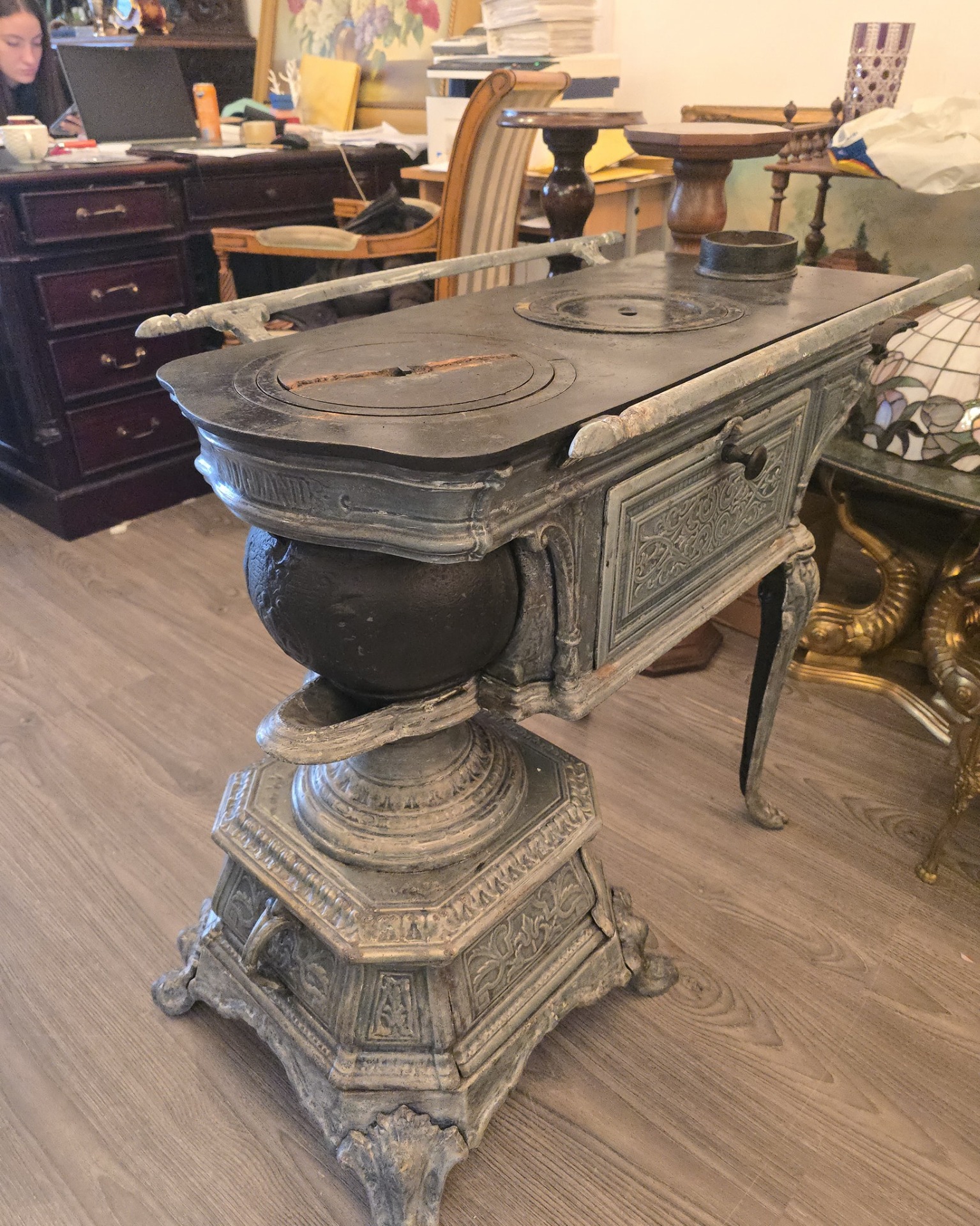 Este susținută de picioare elegante, curbate (cabriole), care sunt tipice mobilierului și accesoriilor de epocă.