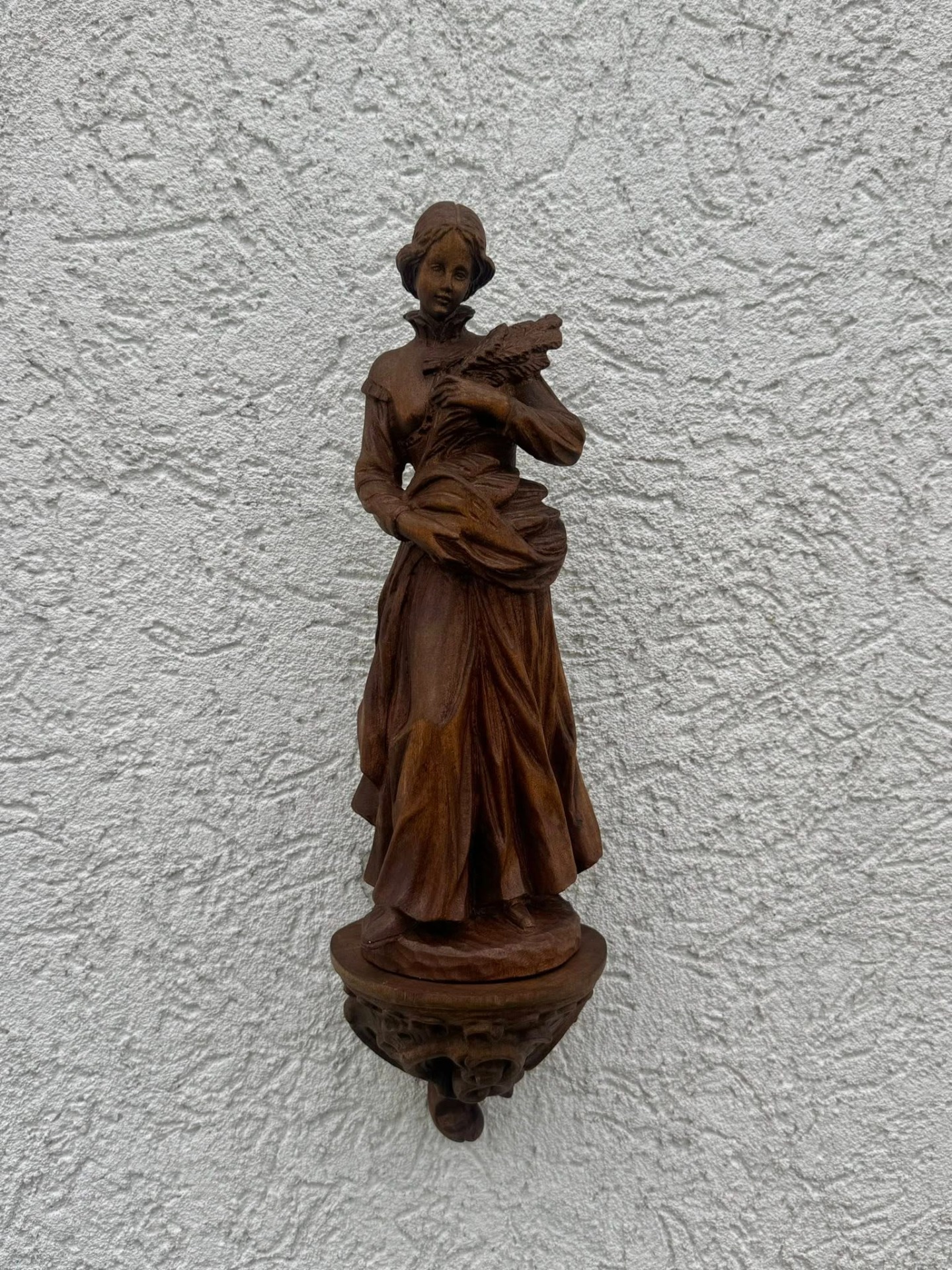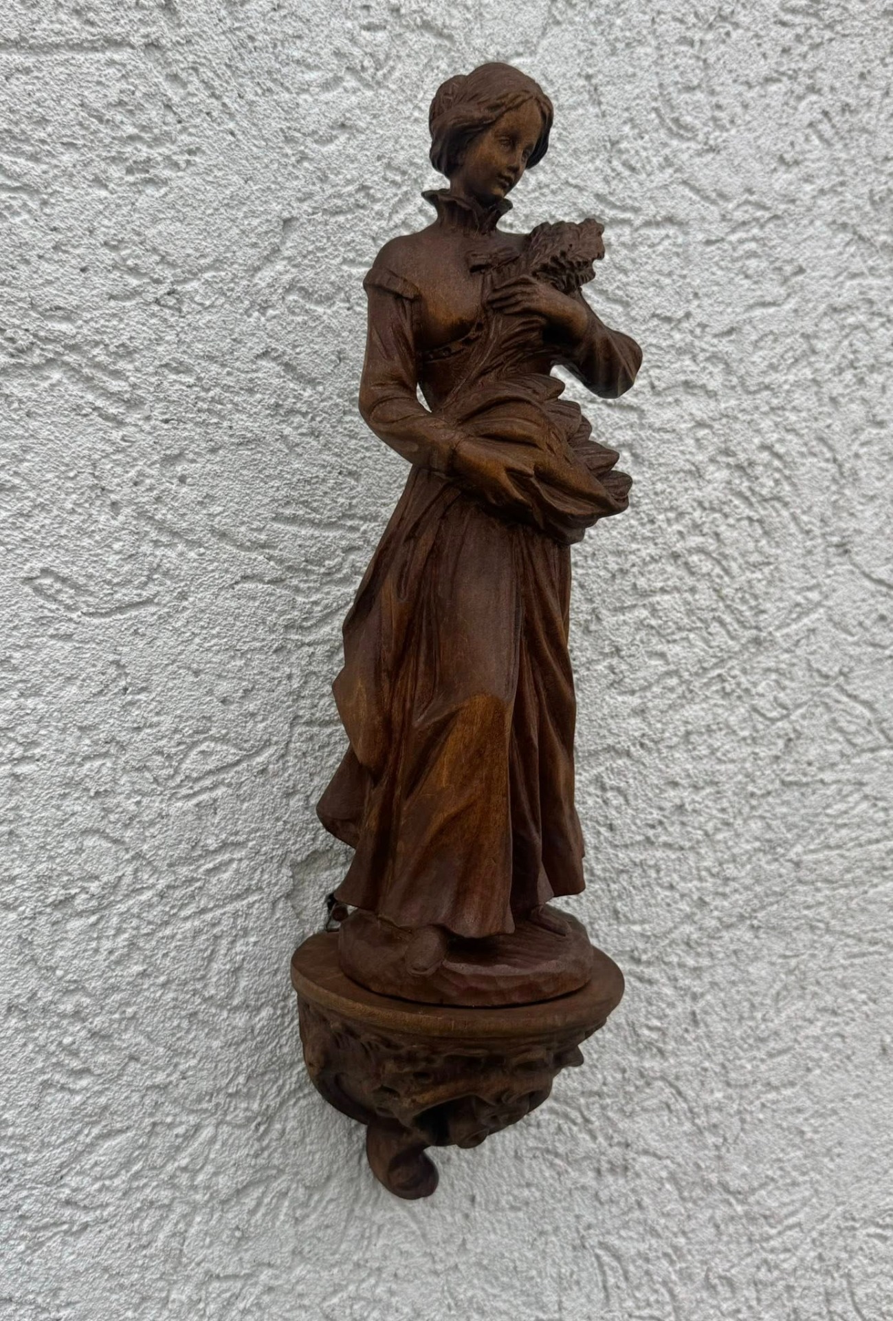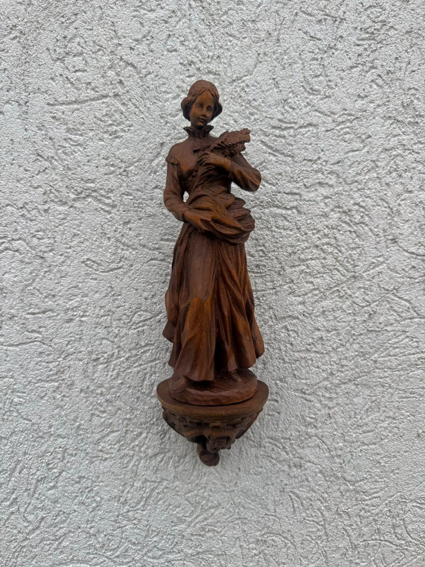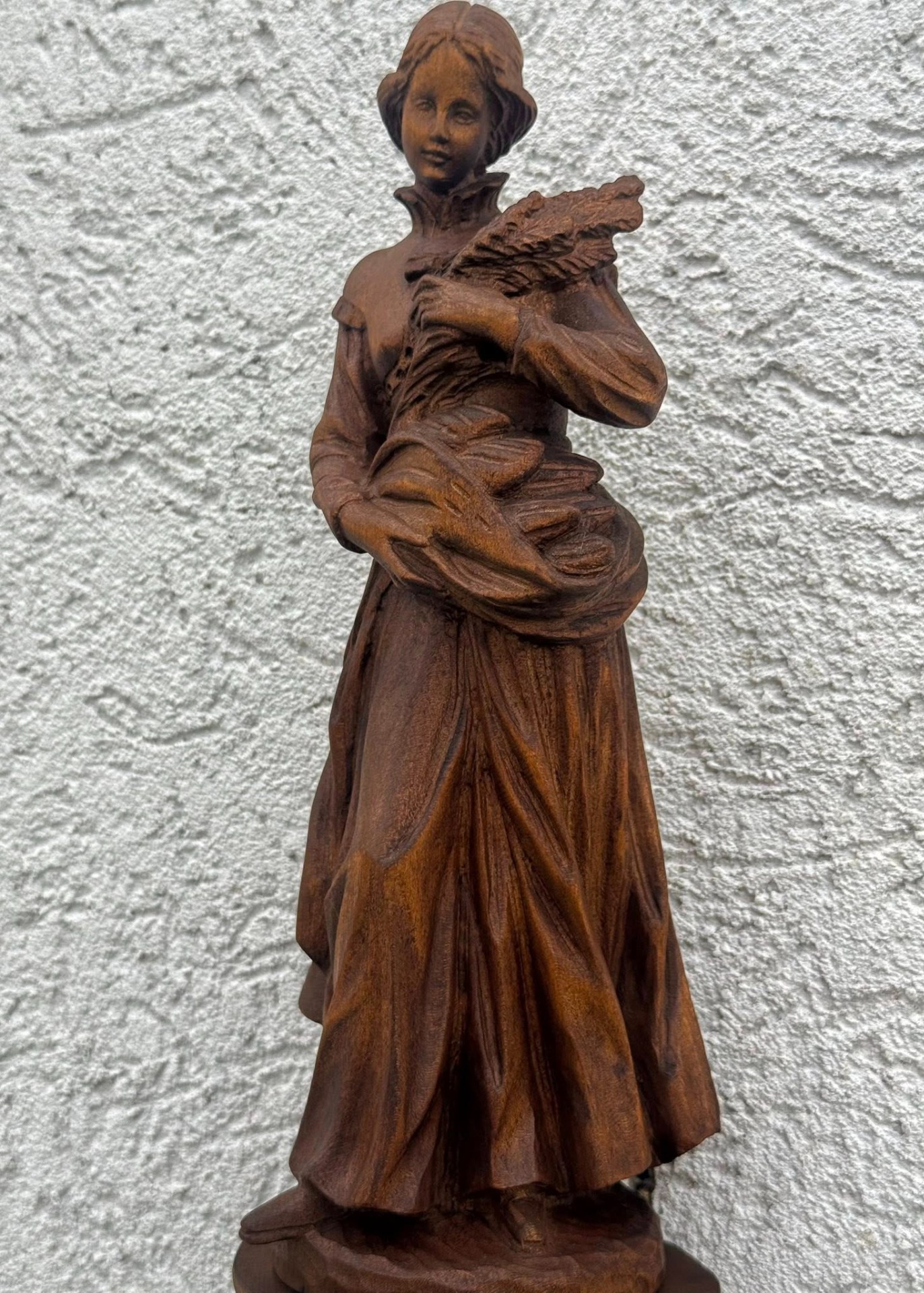 Statuetă decorativă sculptată în lemn, reprezentând o figură feminină îmbrăcată în haine tradiționale de epocă. Aceasta ține în brațe un mănunchi bogat de spice de grâu, ceea ce sugerează că piesa este o alegorie a toamnei sau a recoltei.( prima jumătate a sec. XX)
