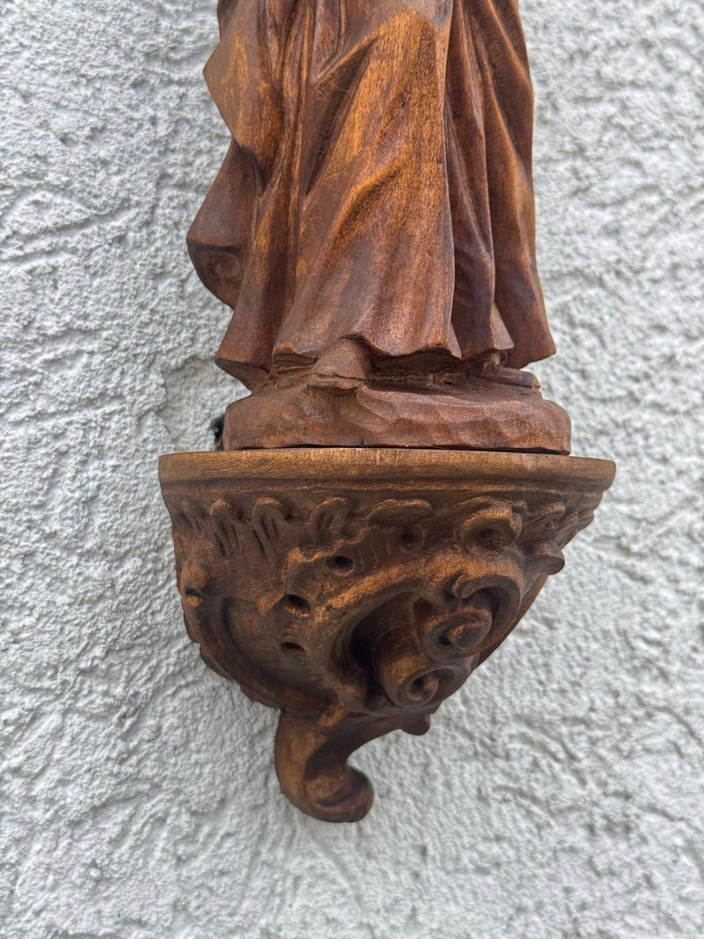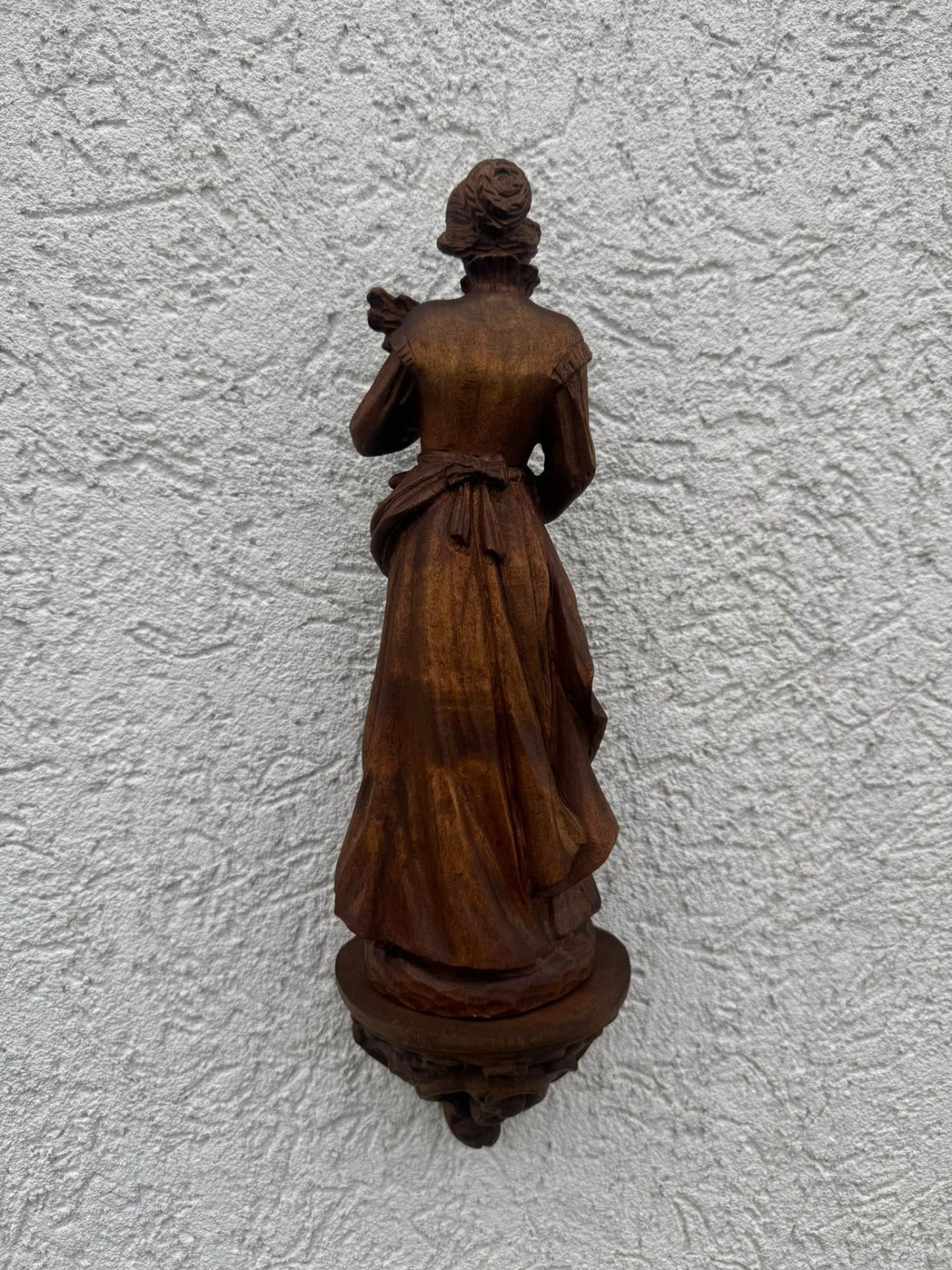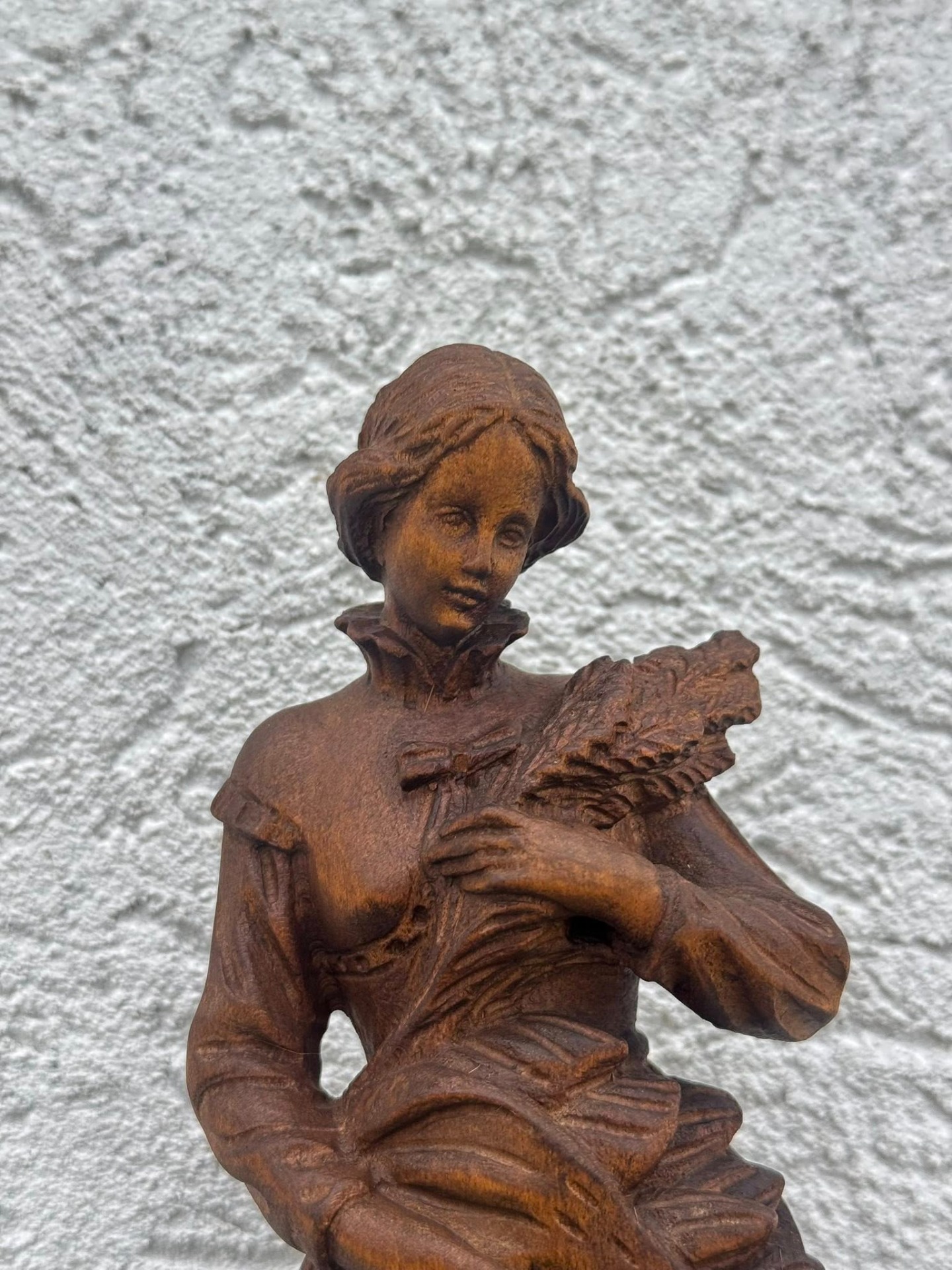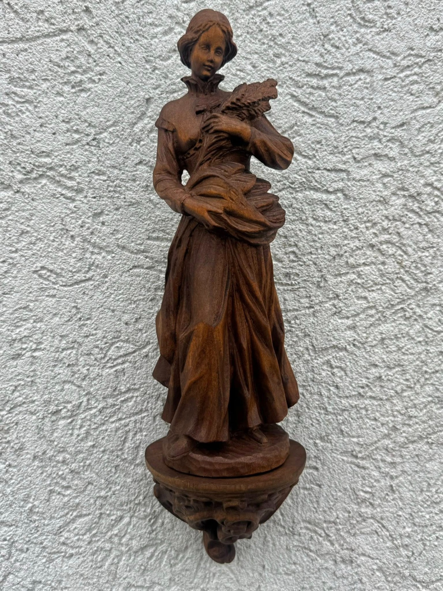 Statuetă decorativă sculptată în lemn, reprezentând o figură feminină îmbrăcată în haine tradiționale de epocă. Aceasta ține în brațe un mănunchi bogat de spice de grâu, ceea ce sugerează că piesa este o alegorie a toamnei sau a recoltei.( prima jumătate a sec. XX)