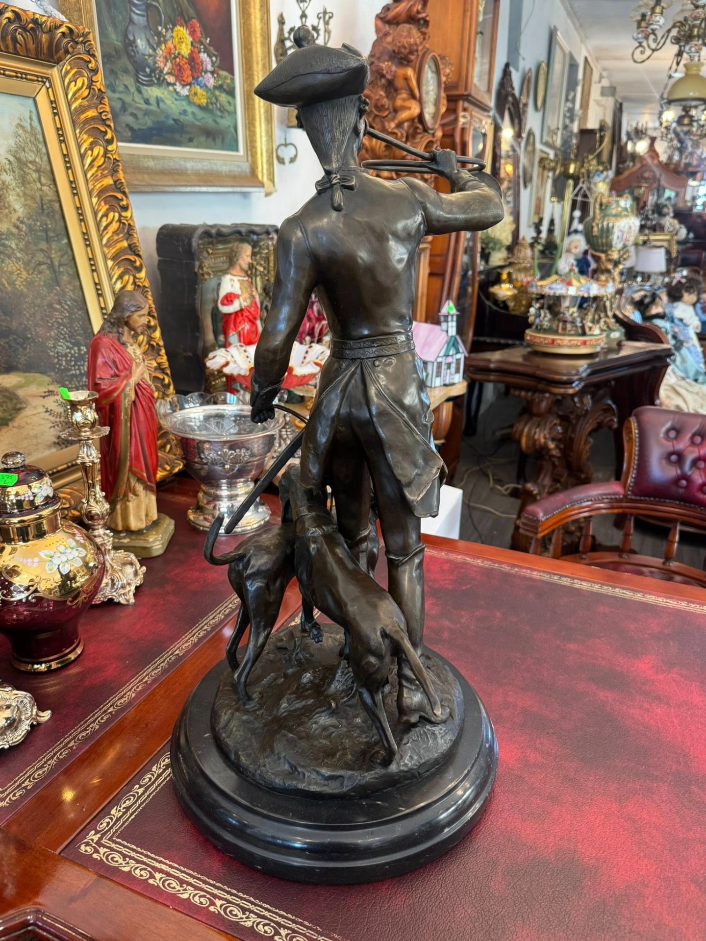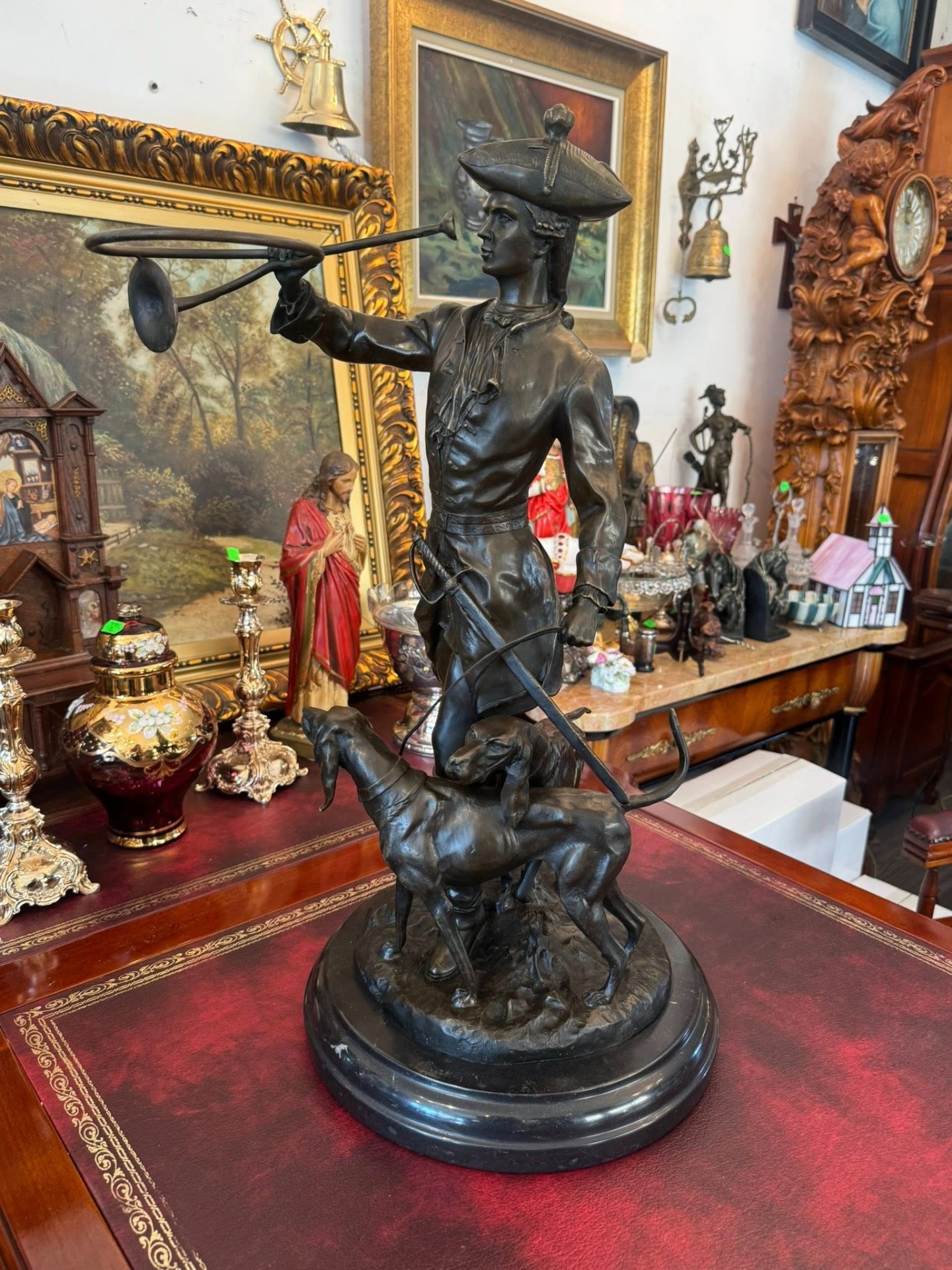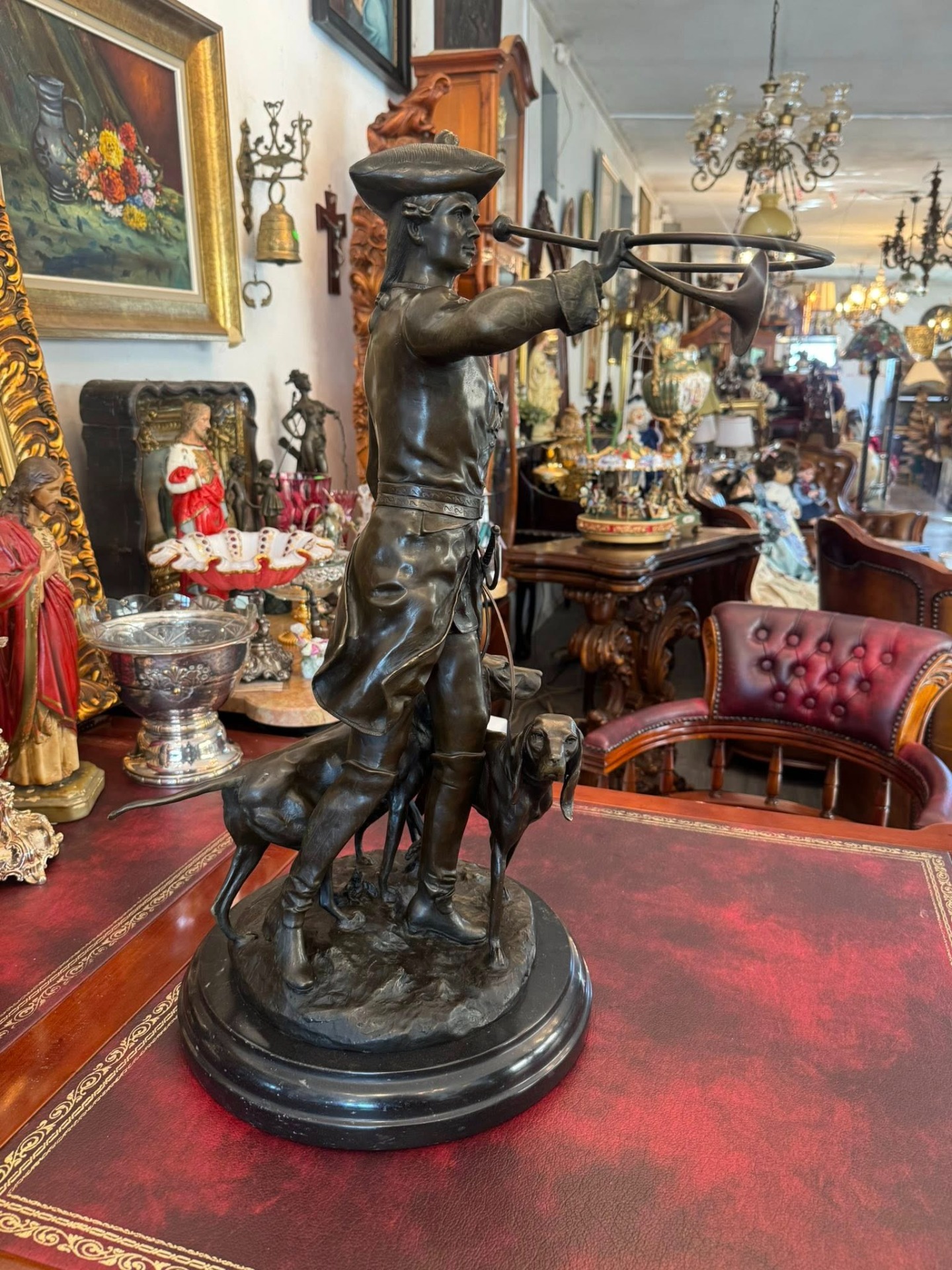 Statuetă din bronz pe soclu de marmură ce înfățișează o scenă de vânătoare, semnată.