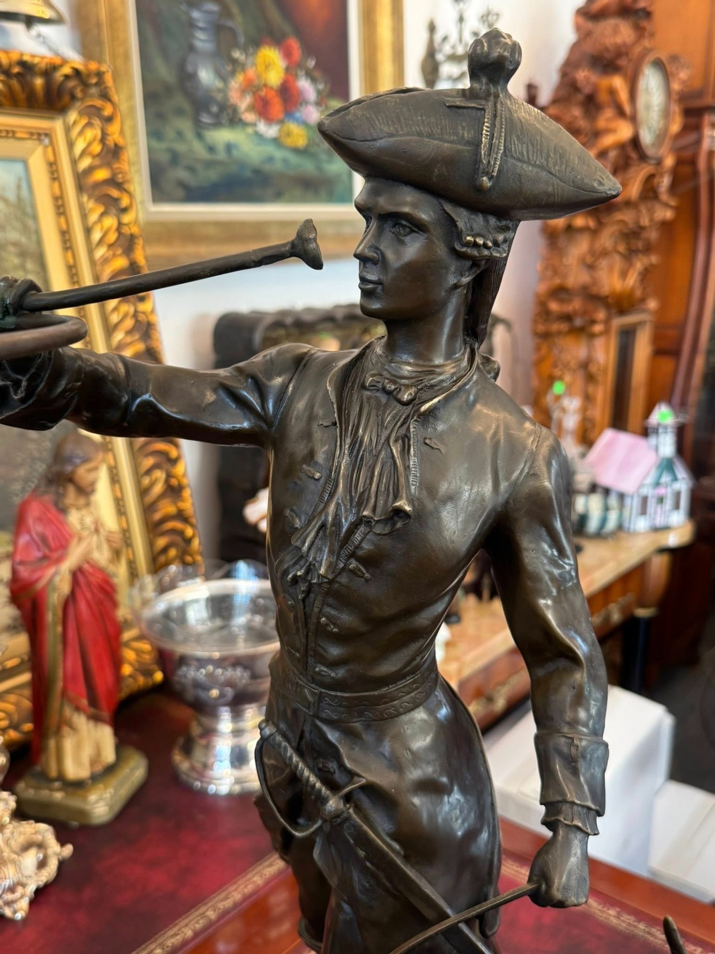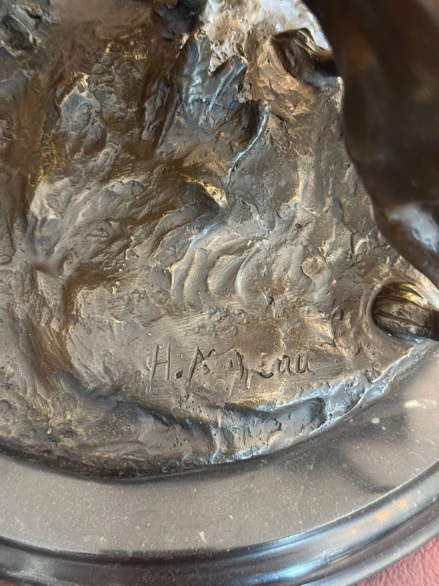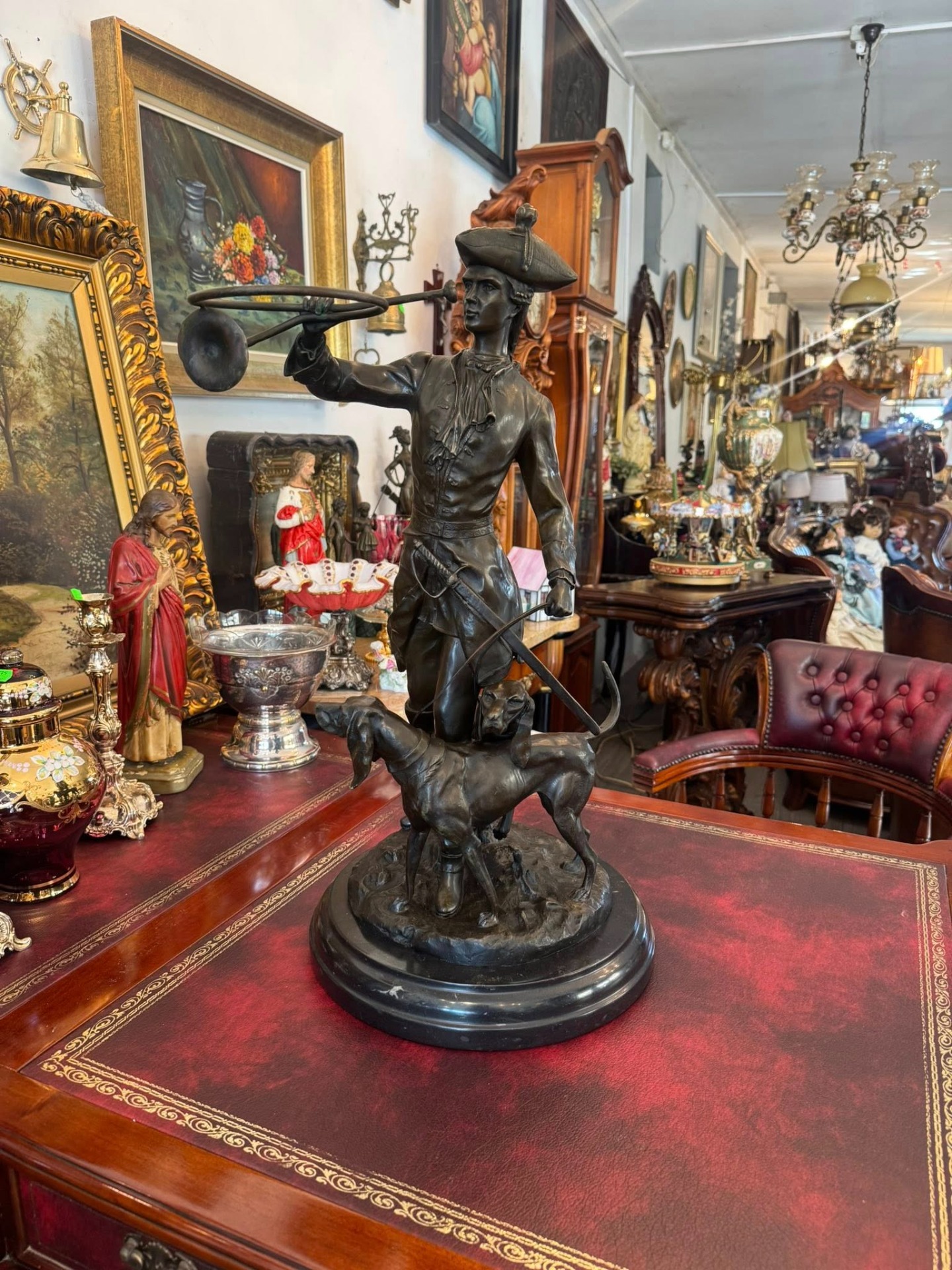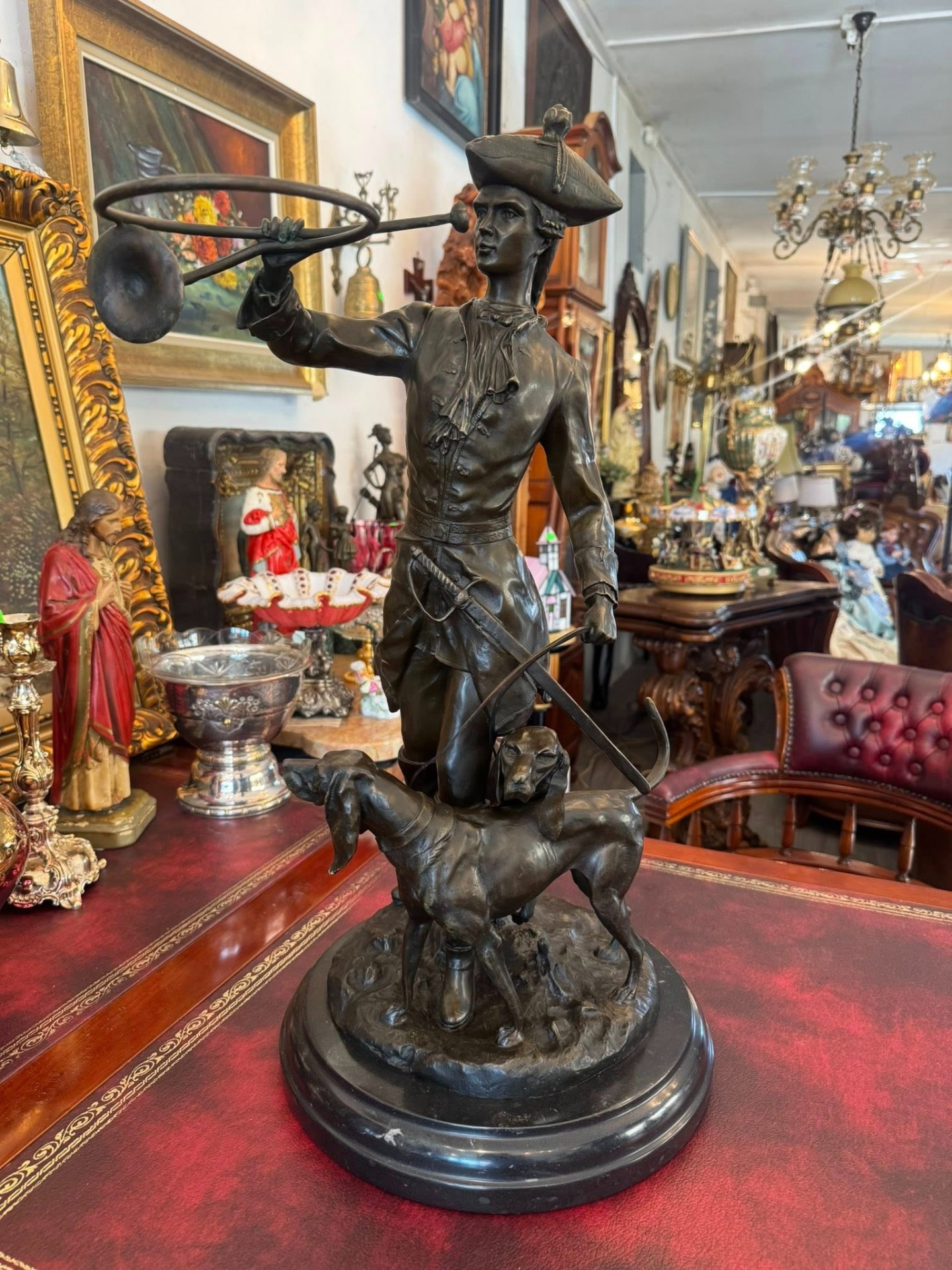 Statuetă din bronz pe soclu de marmură ce înfățișează o scenă de vânătoare, semnată.