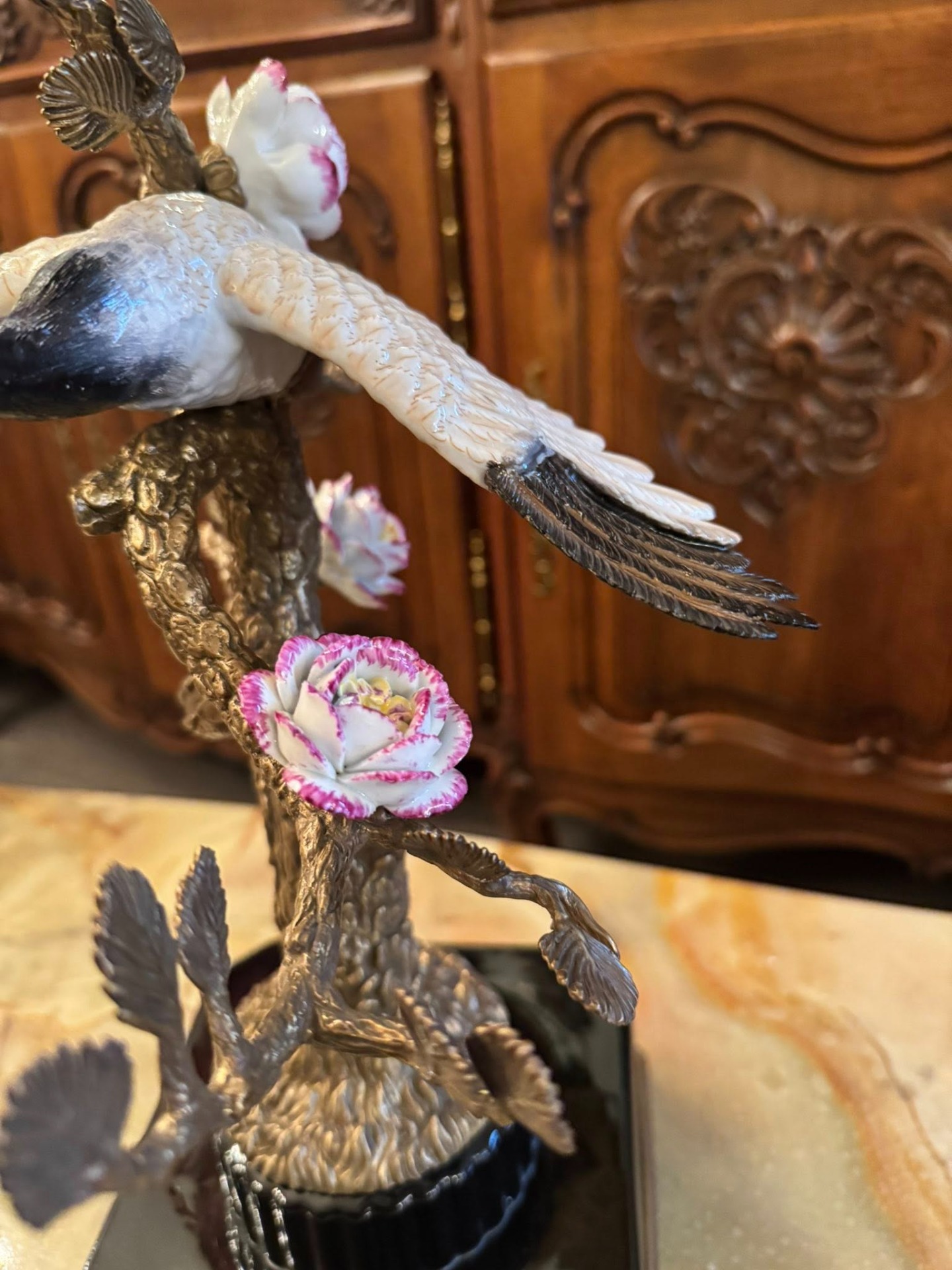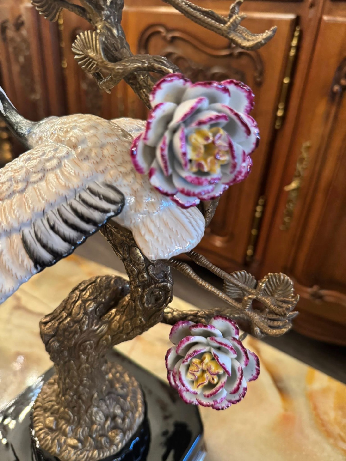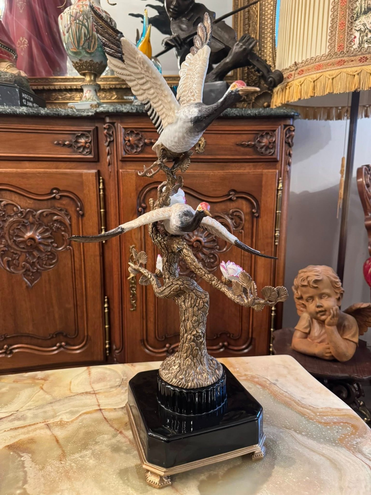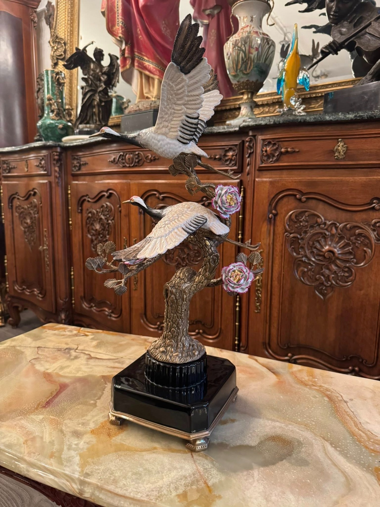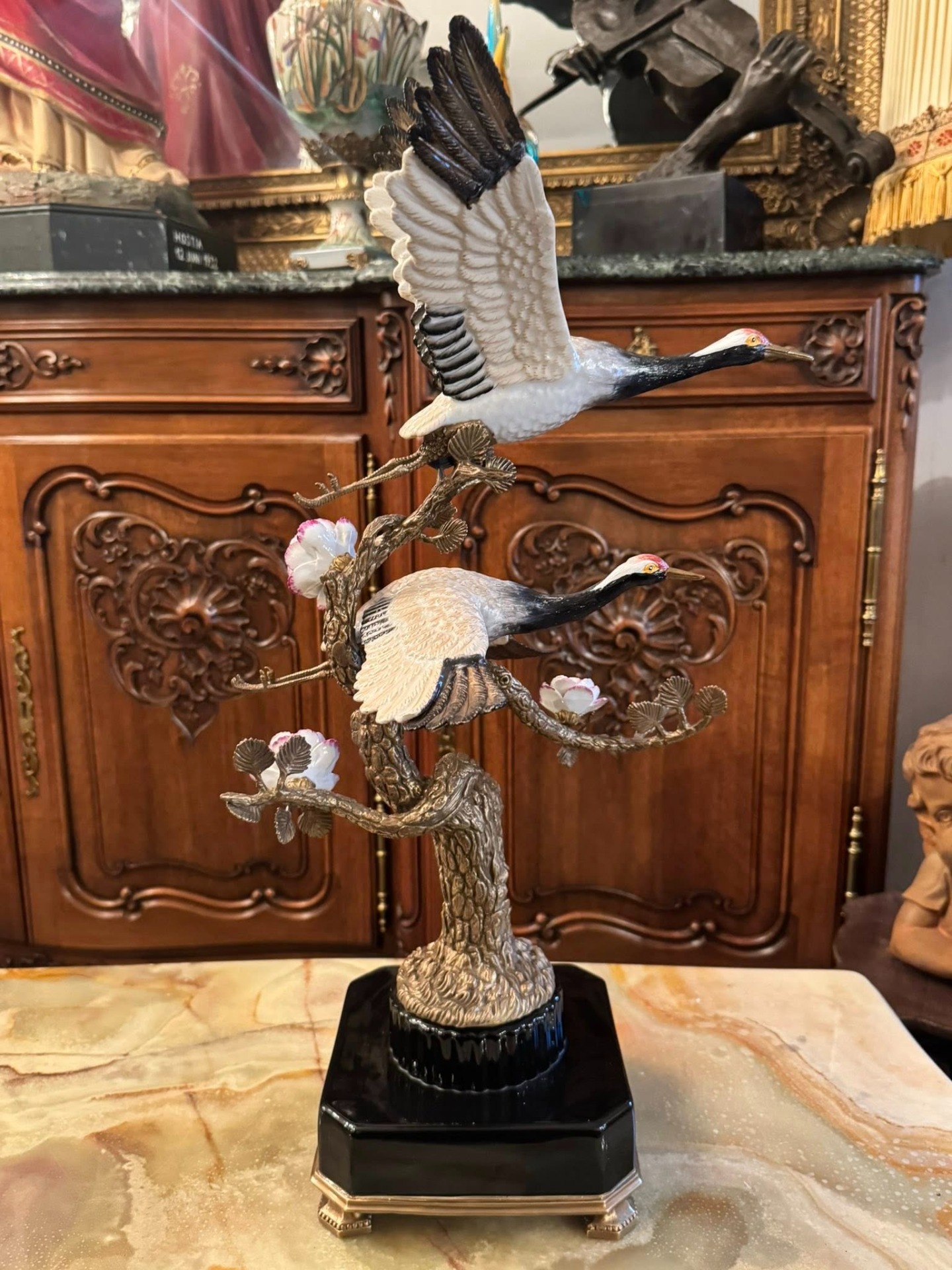 Statuetă din porțelan și bronz ce reprezintă doi cocori japonezi aflați pe ramurile unui copac înflorit. În cultura asiatică, cocorul este un simbol stravechi al longevității, fidelității și păcii. Reprezentarea a două păsări sugerează armonia în familie sau în cuplu.