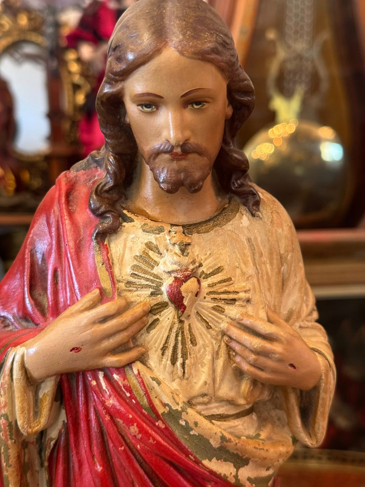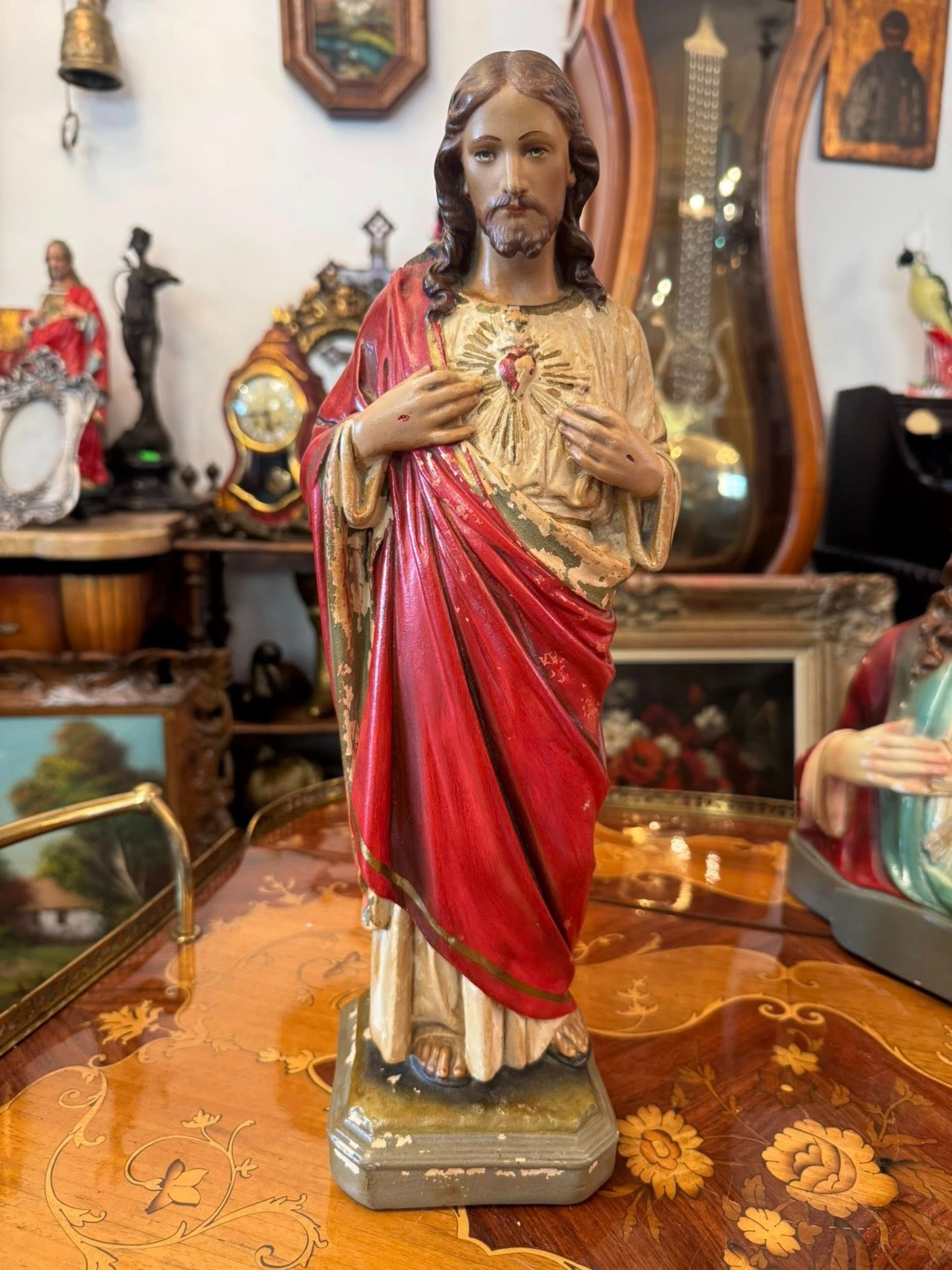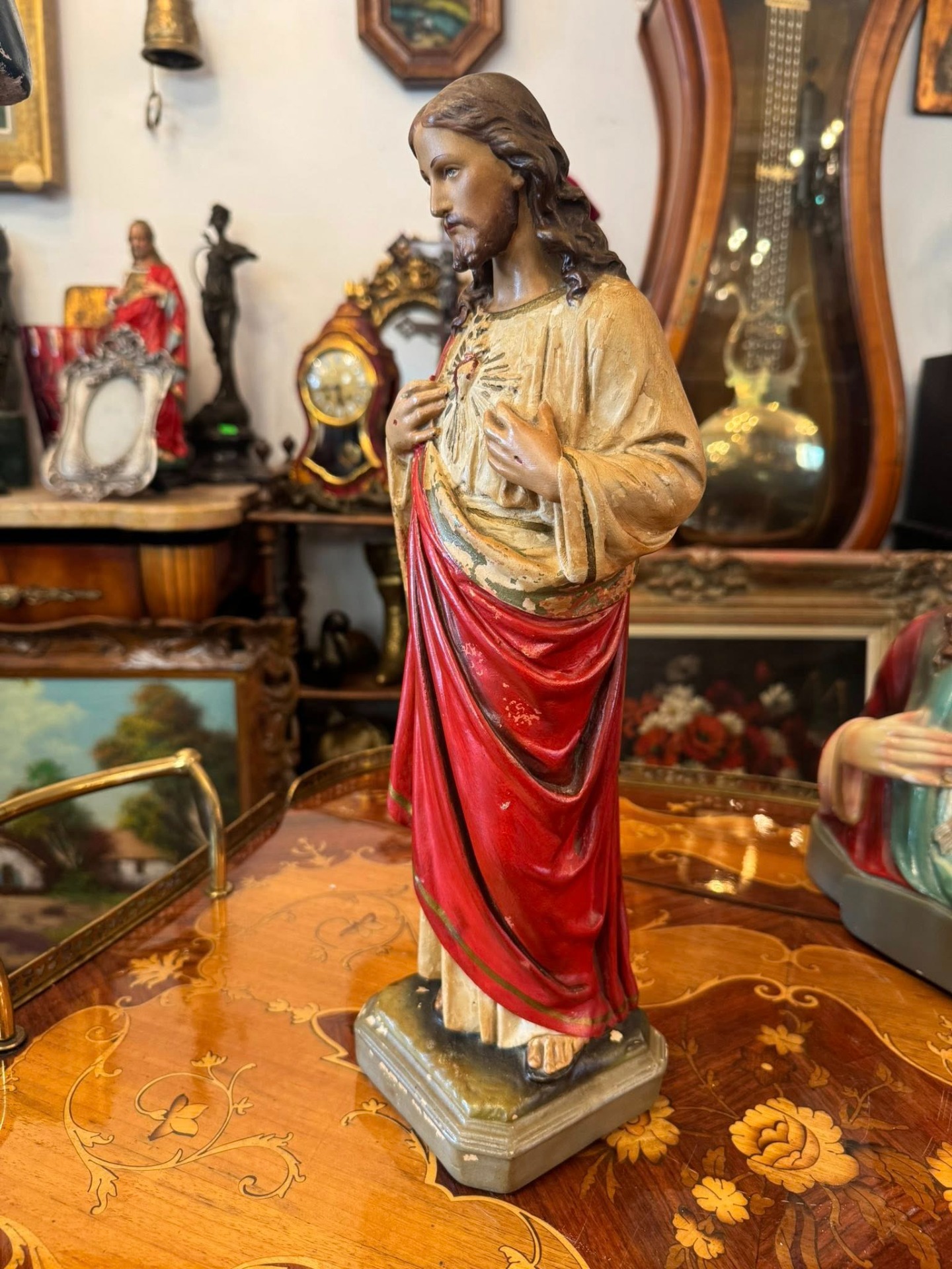 Statuetă întreagă a lui Iisus Hristos, reprezentând Inima Sacră a lui Iisus (Sacré-Cœur), din ipsos turnat. (cca 1920)