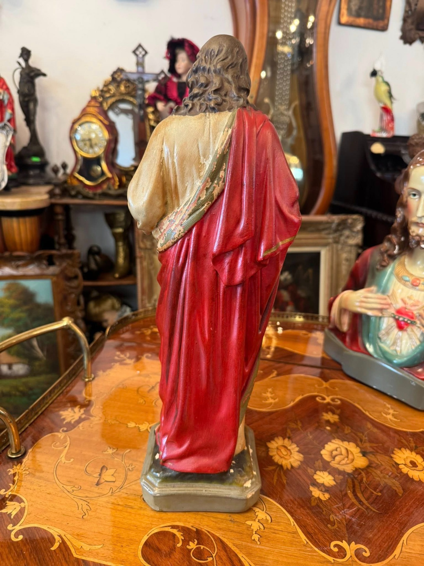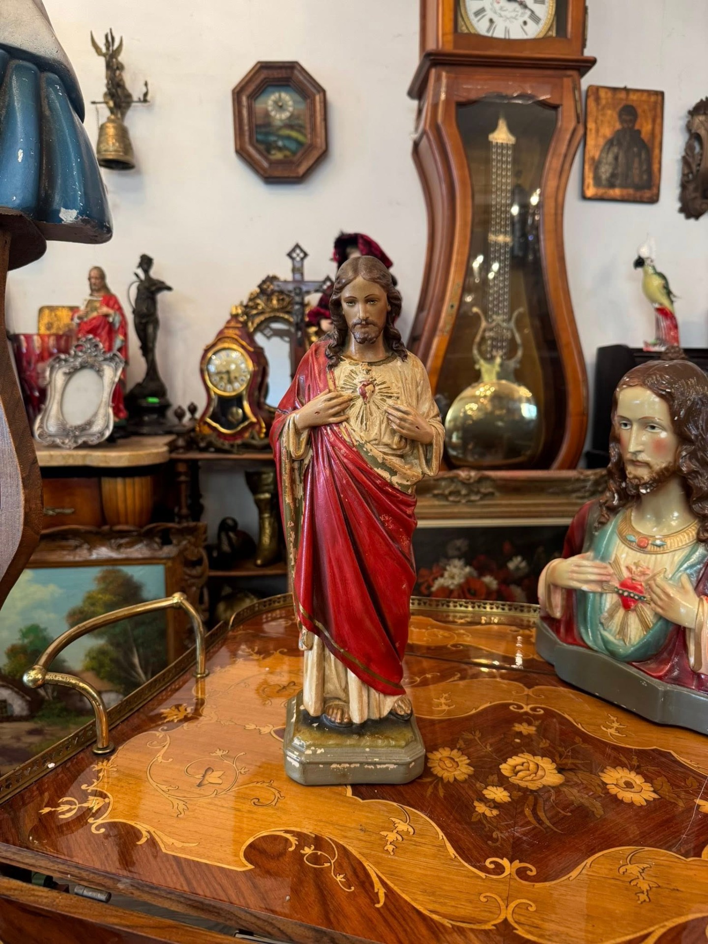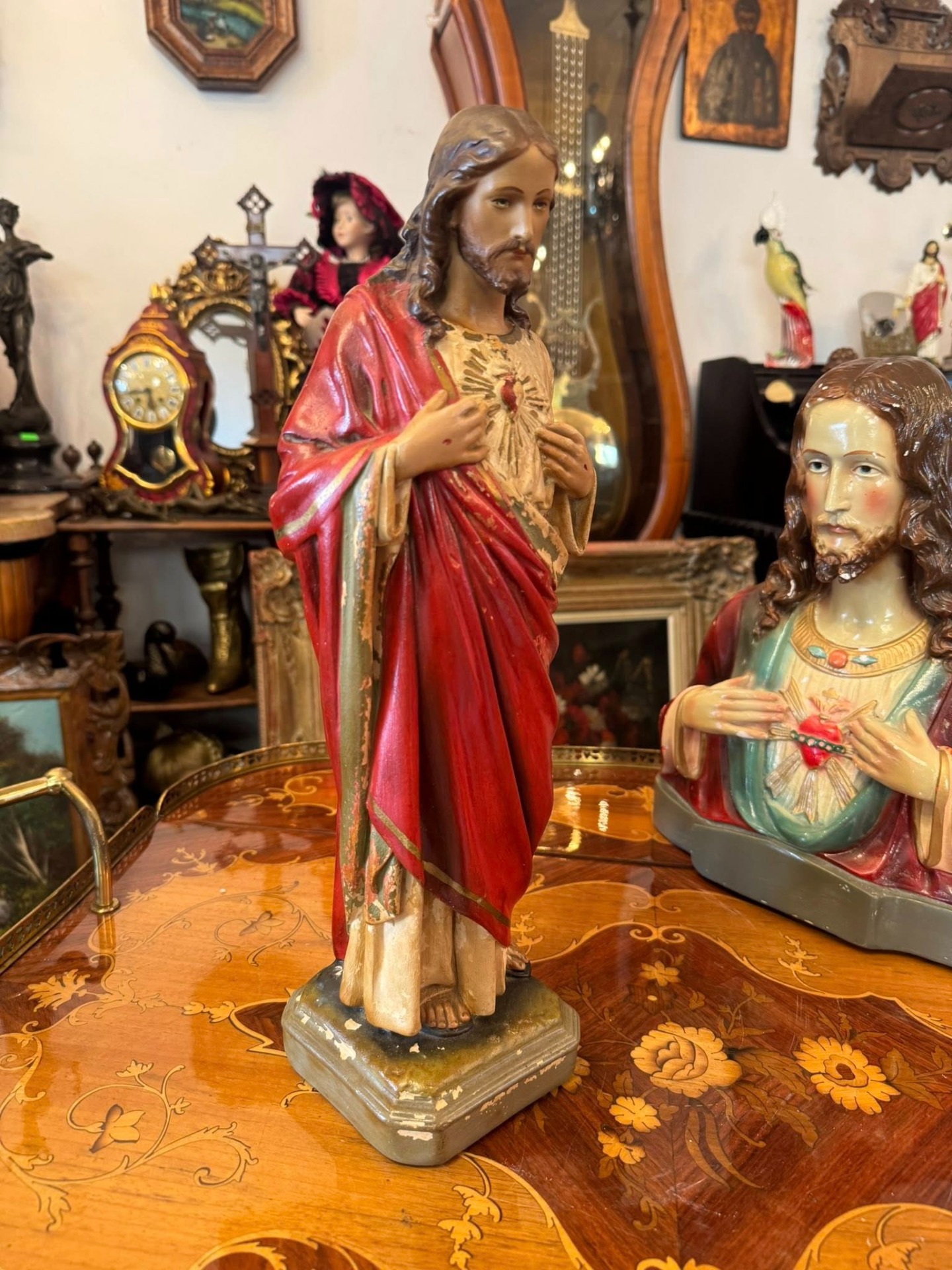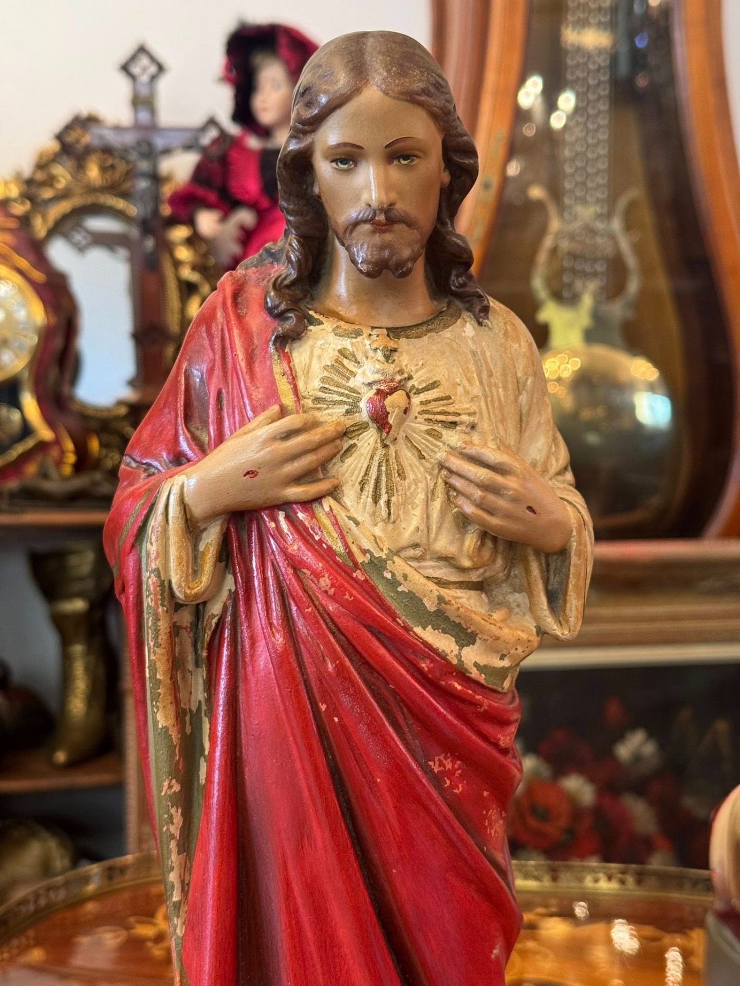 Statuetă întreagă a lui Iisus Hristos, reprezentând Inima Sacră a lui Iisus (Sacré-Cœur), din ipsos turnat. (cca 1920)