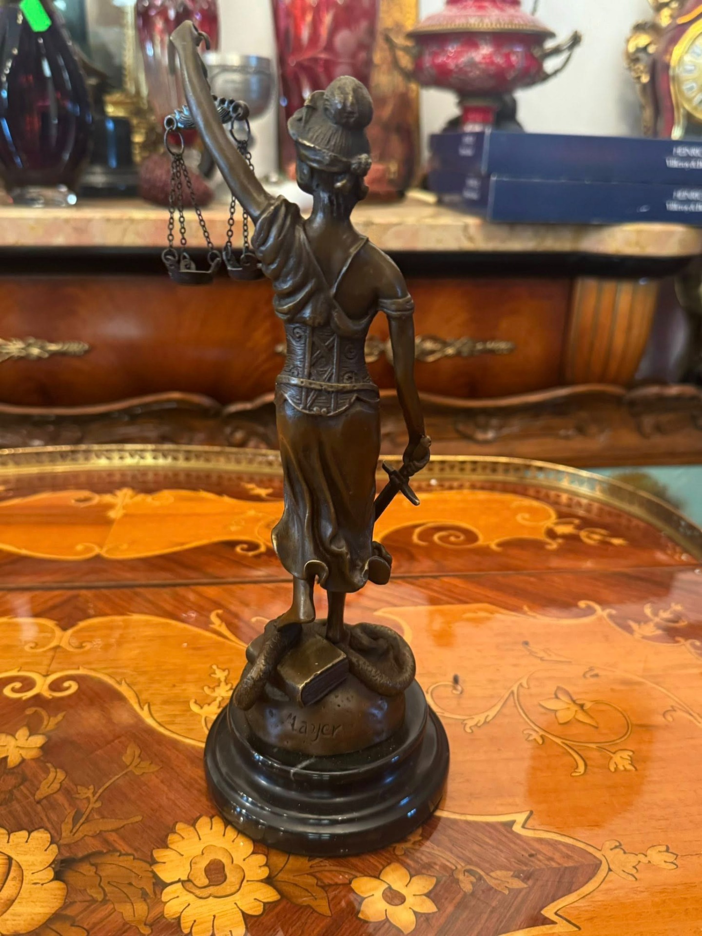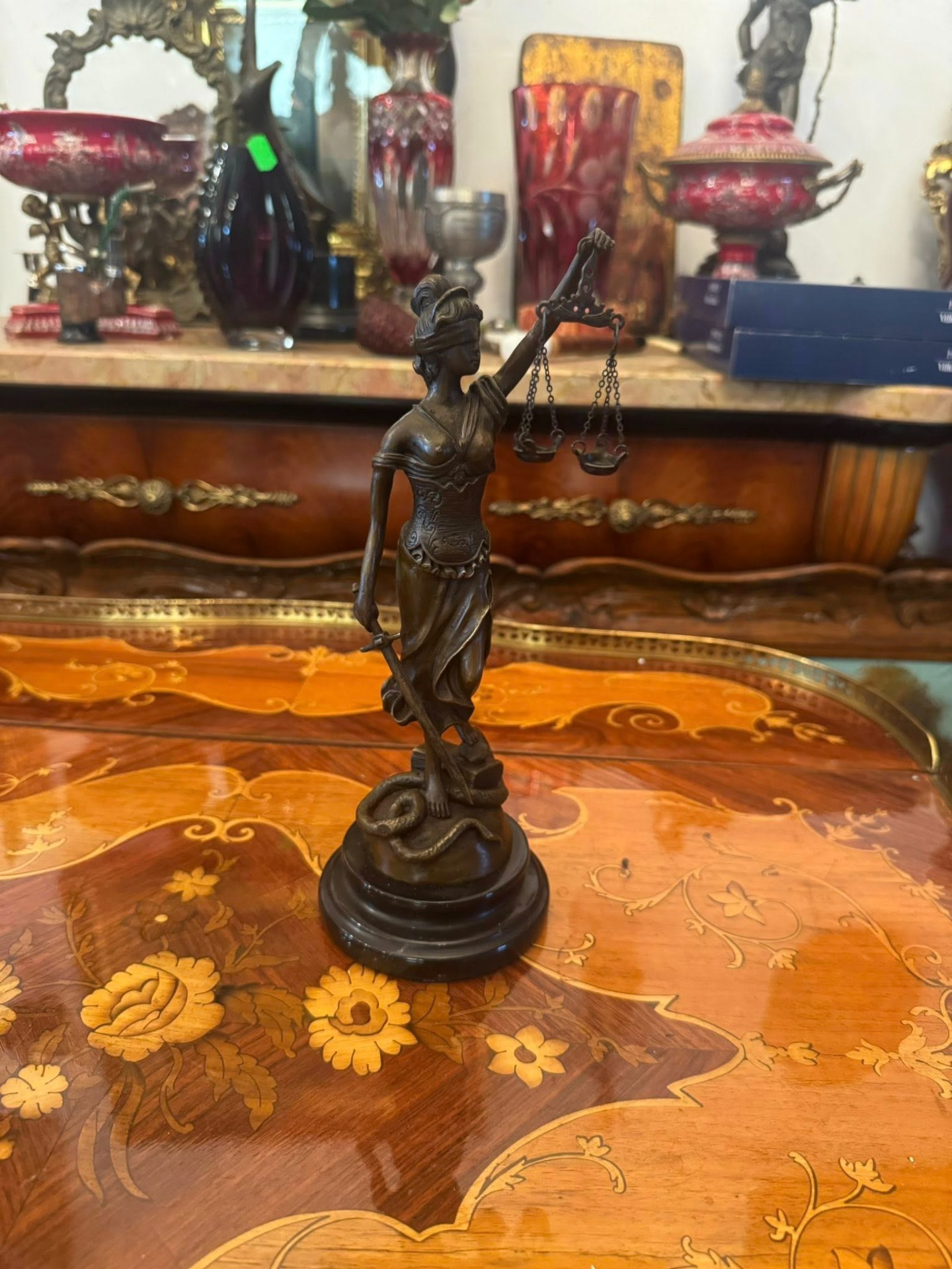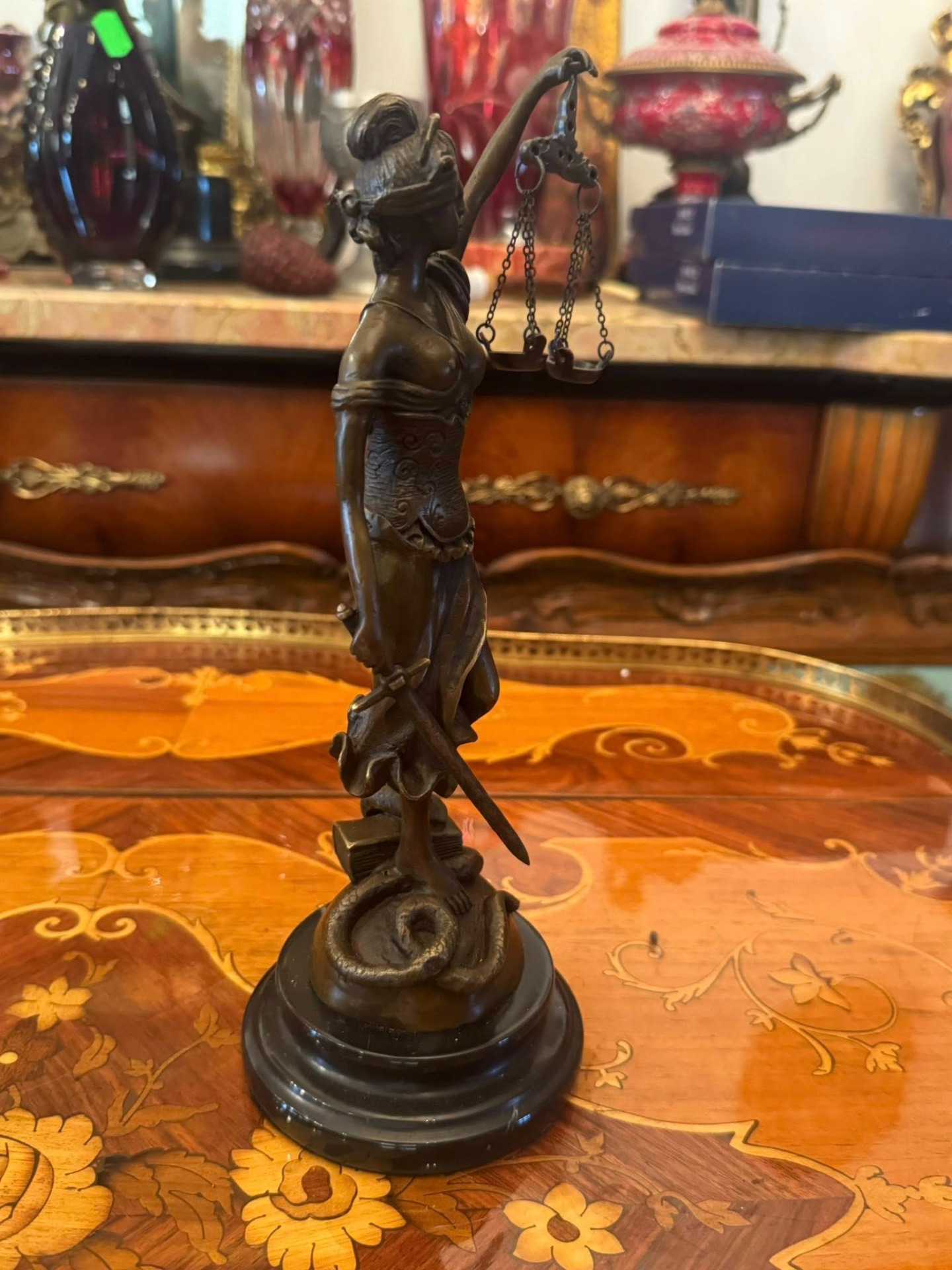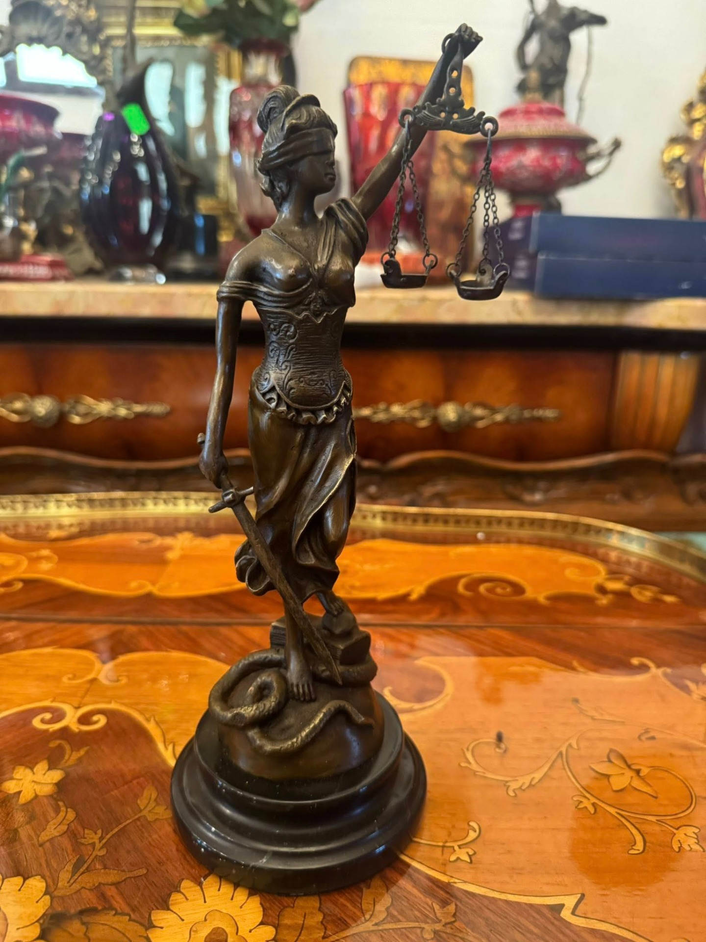 Statuetă Justiția din bronz pe soclu de marmură neagră. Un simbol universal al legii și echității.