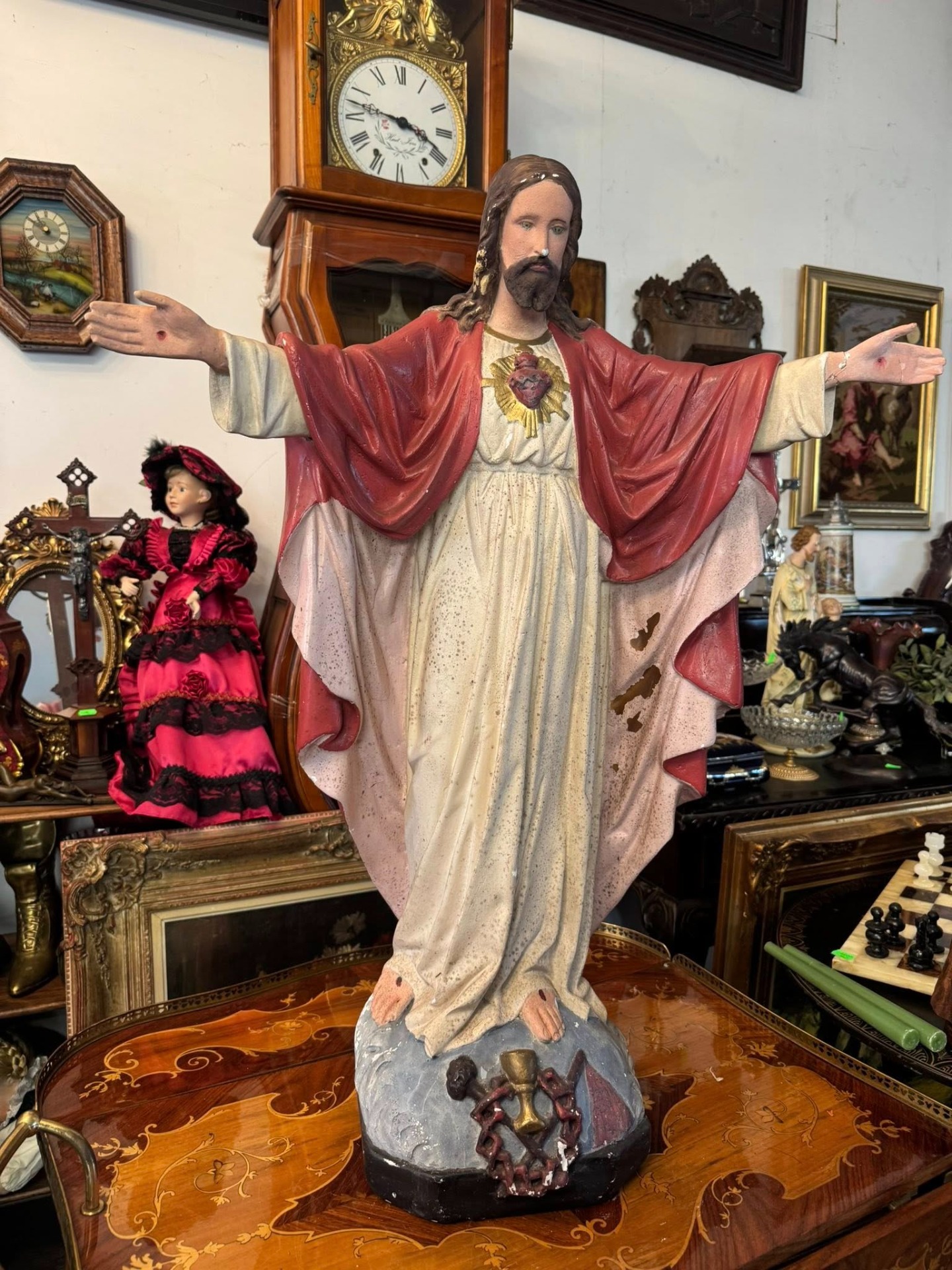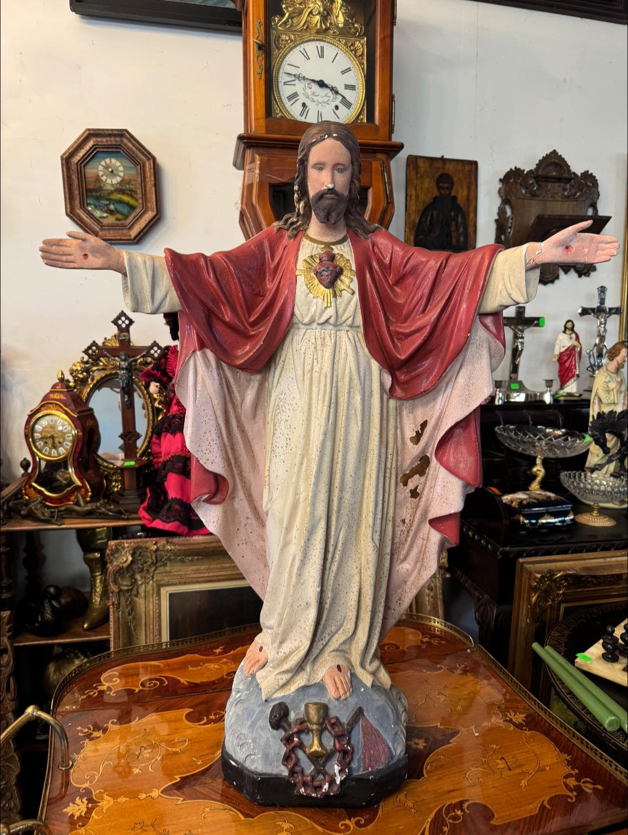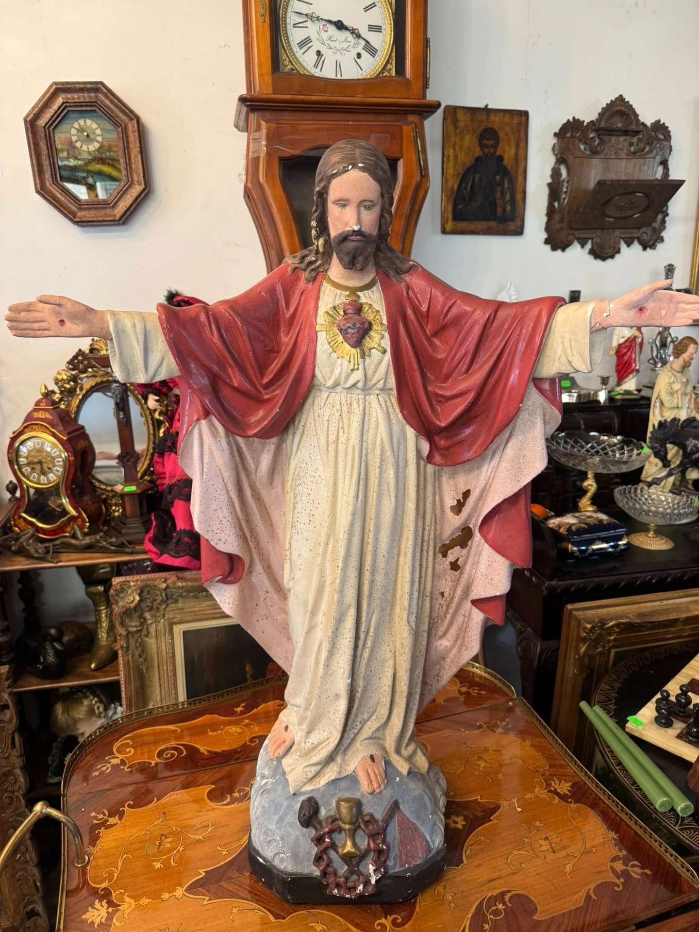 Isus este prezentat cu ambele brațe larg deschise, o postură ce simbolizează îmbrățișarea întregii omeniri. Mantia este de un roșu intens, simbolizând patimile și regalitatea.(începutul secolului XX,Franța)