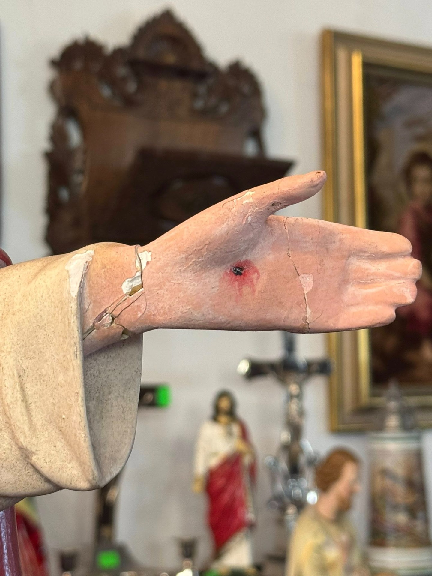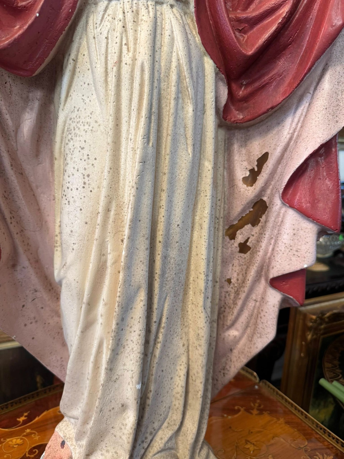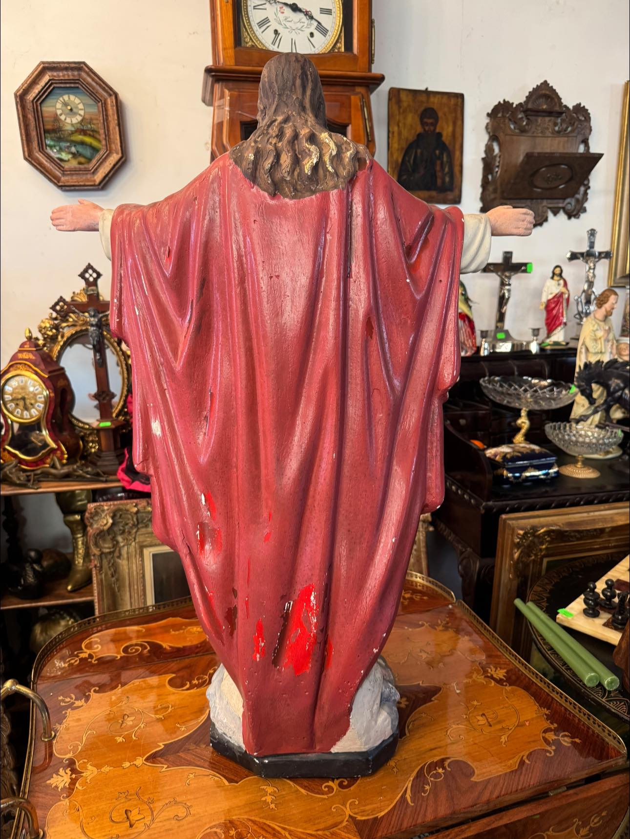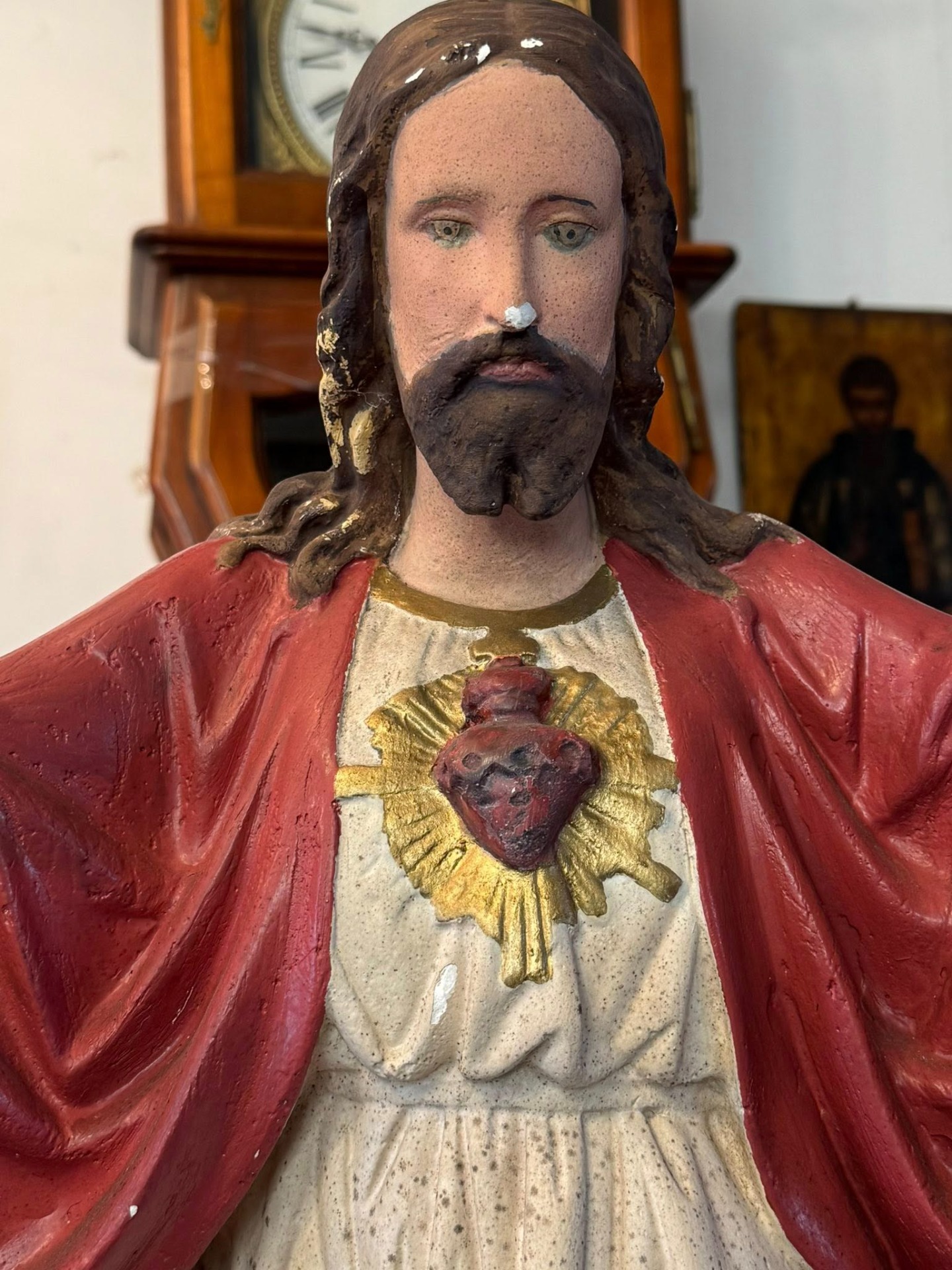 Isus este prezentat cu ambele brațe larg deschise, o postură ce simbolizează îmbrățișarea întregii omeniri. Mantia este de un roșu intens, simbolizând patimile și regalitatea.(începutul secolului XX,Franța)