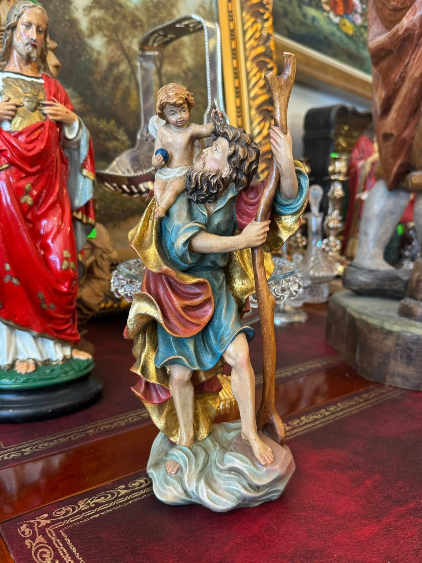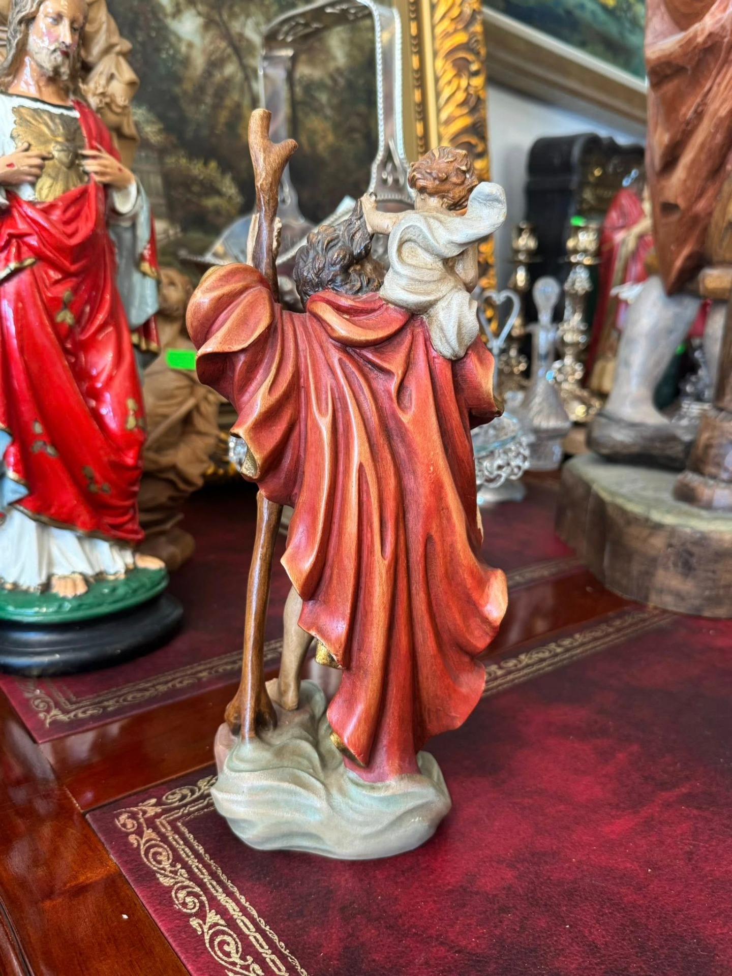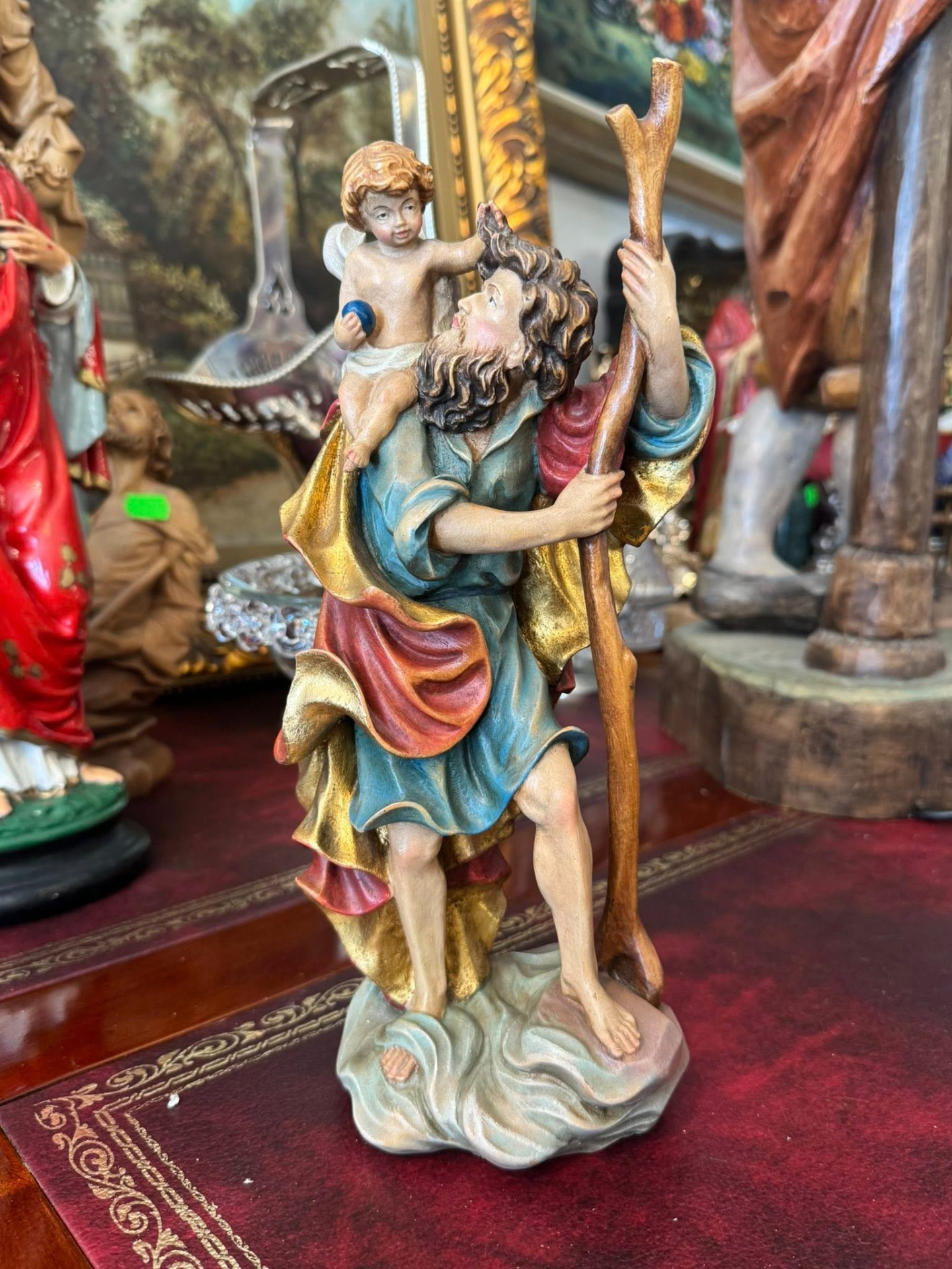 Statuetă religioasă care îl înfățișează pe Sfântul Cristofor, sculptura realizată din lemn în stil Neoclasic.