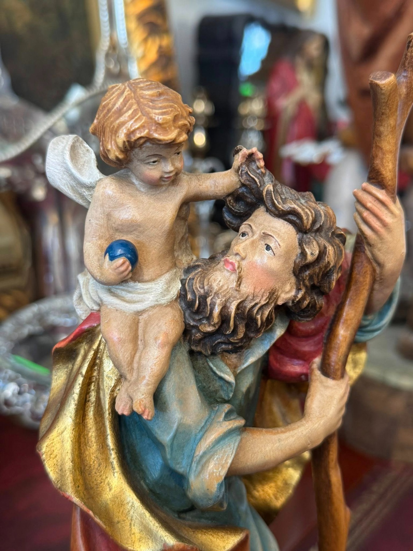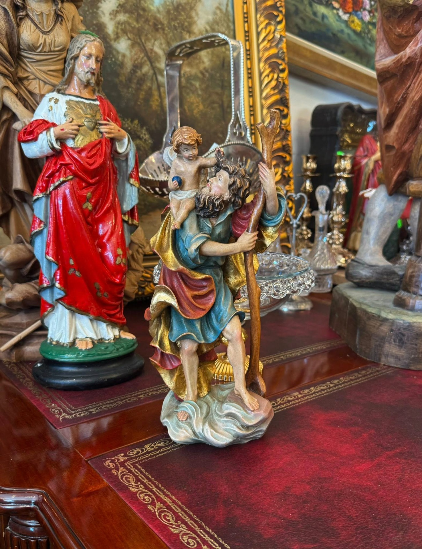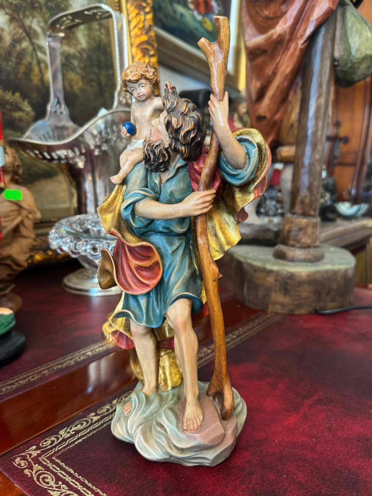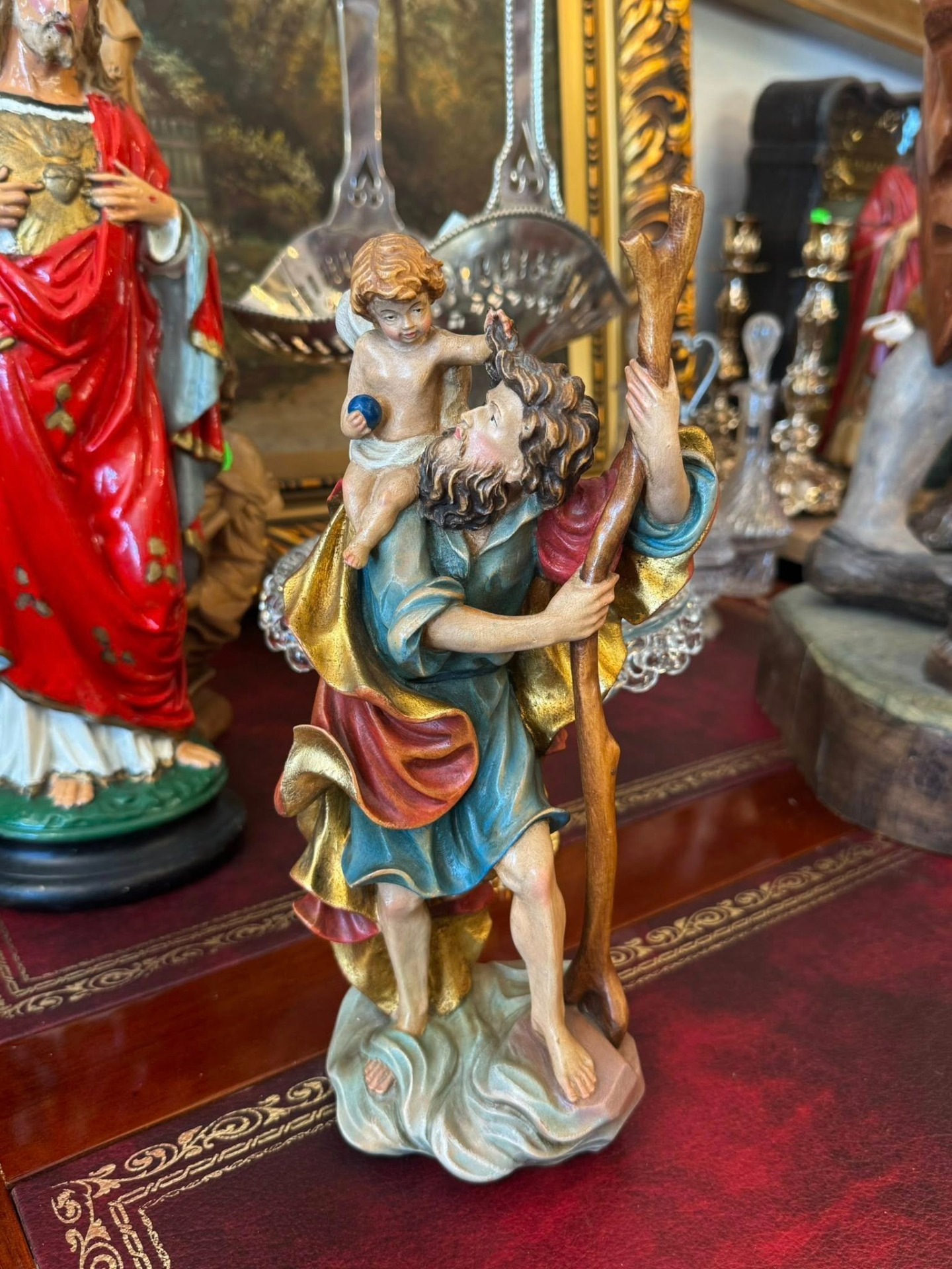 Statuetă religioasă care îl înfățișează pe Sfântul Cristofor, sculptura realizată din lemn în stil Neoclasic.