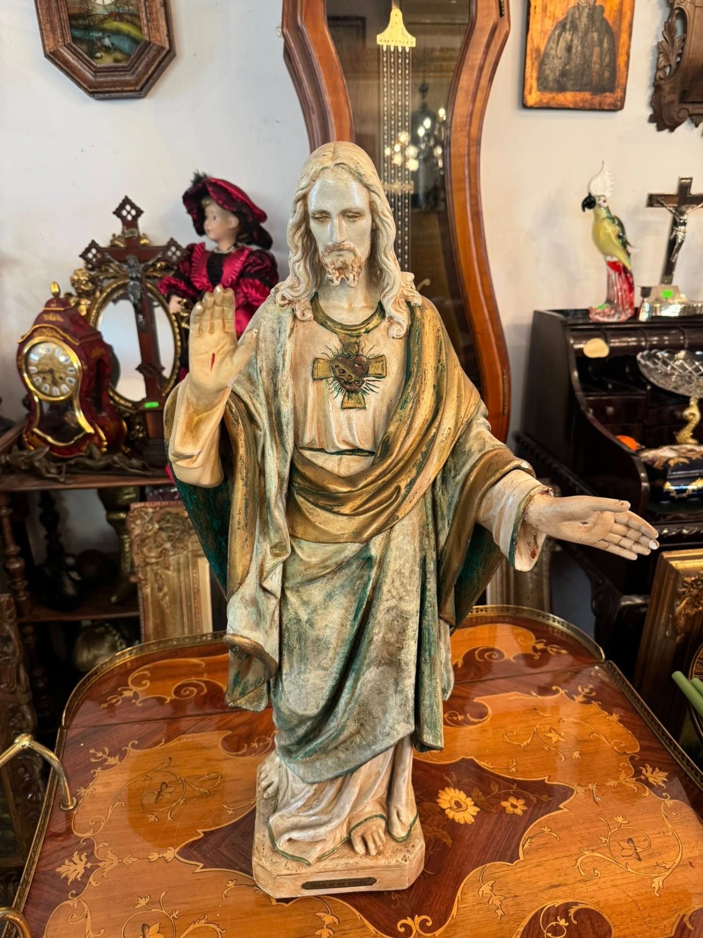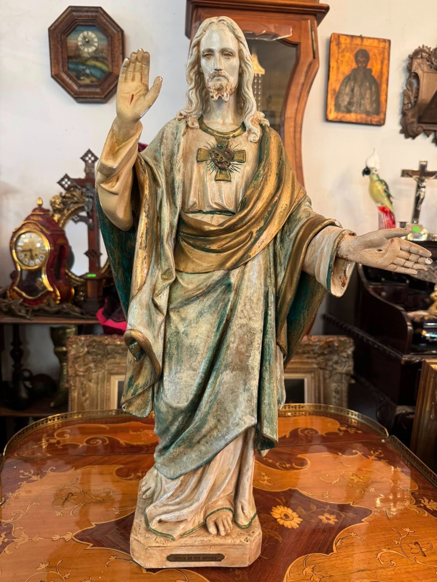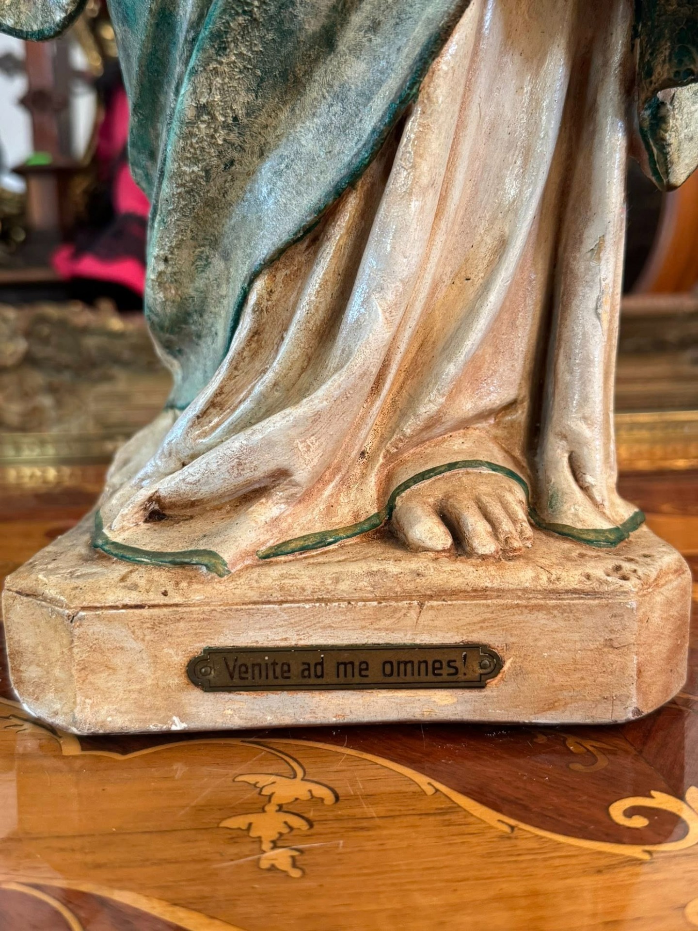 Pe baza statuetei se află o plăcuță metalică cu citatul latin: „Venite ad me omnes!” (Veniți la mine toți!), un îndemn biblic la consolare și credință. (cca 1920, Franța)