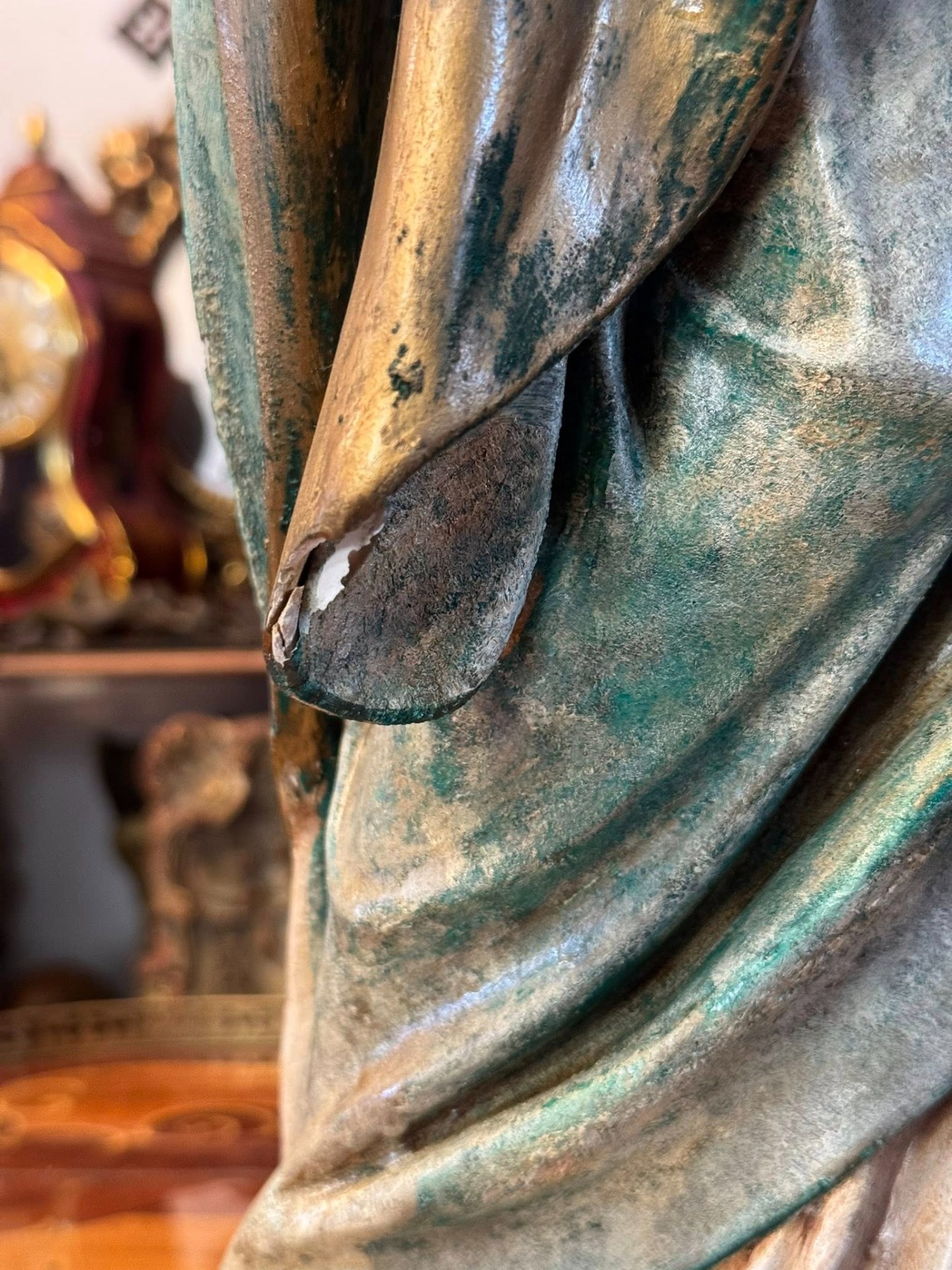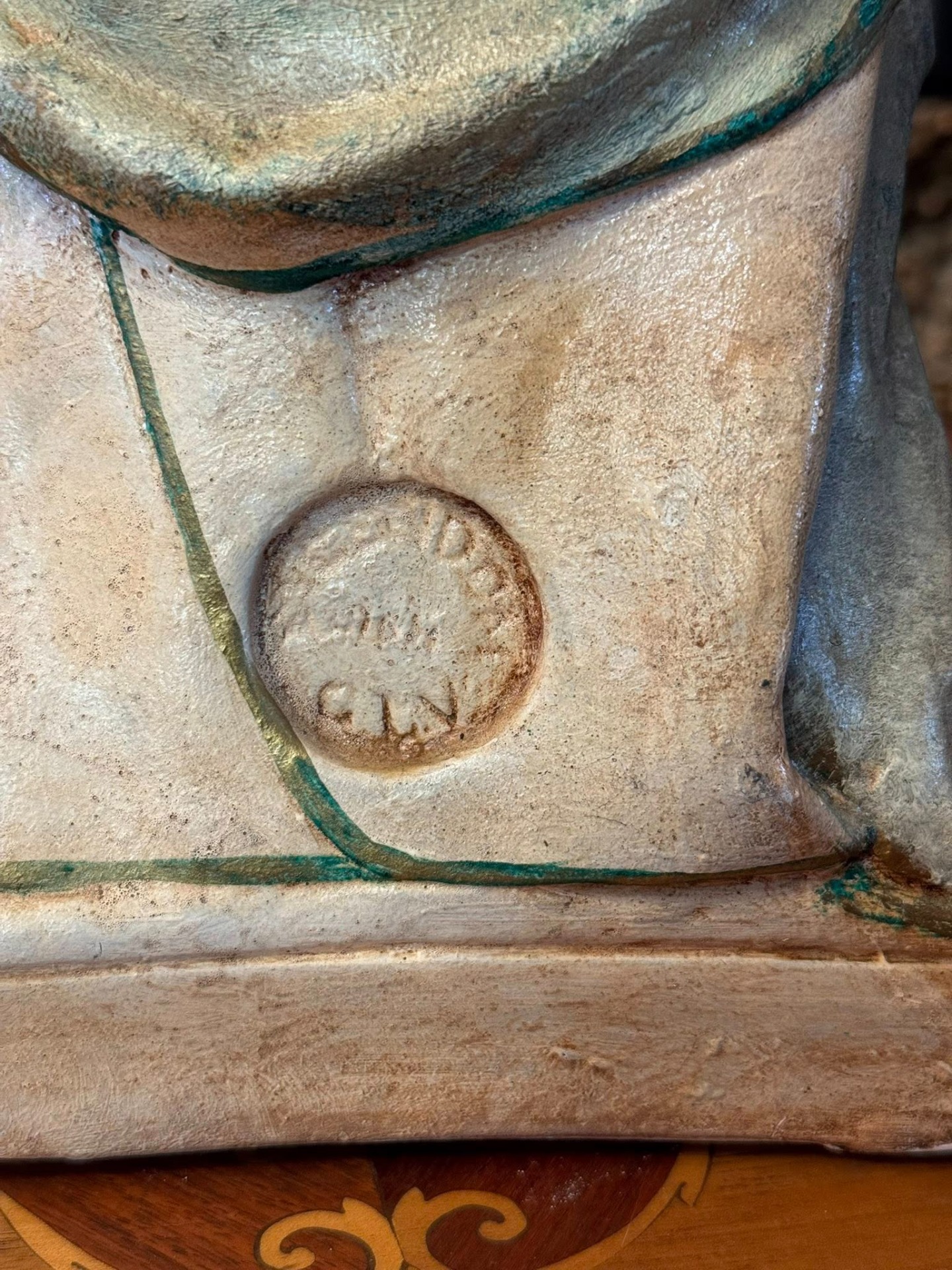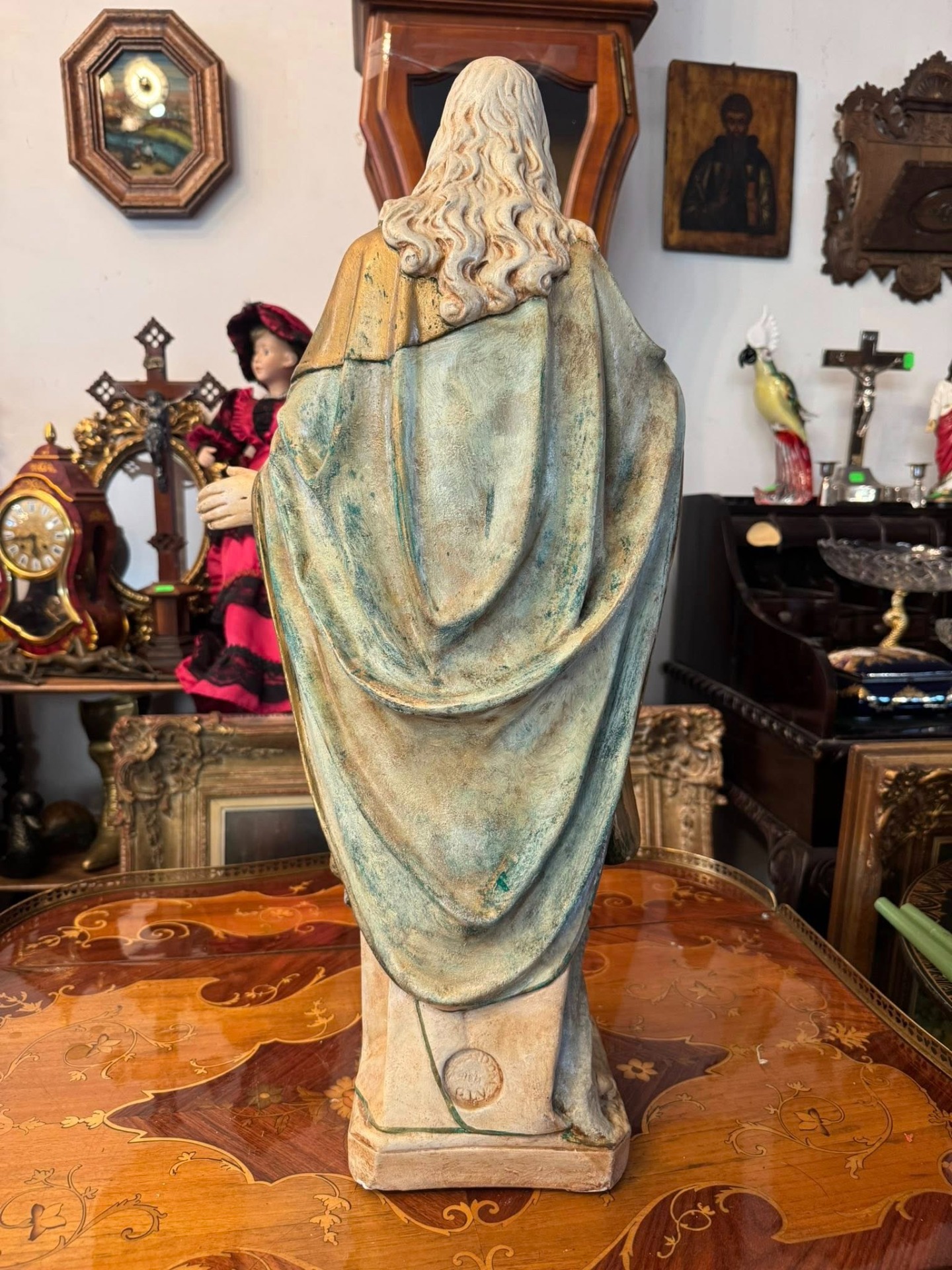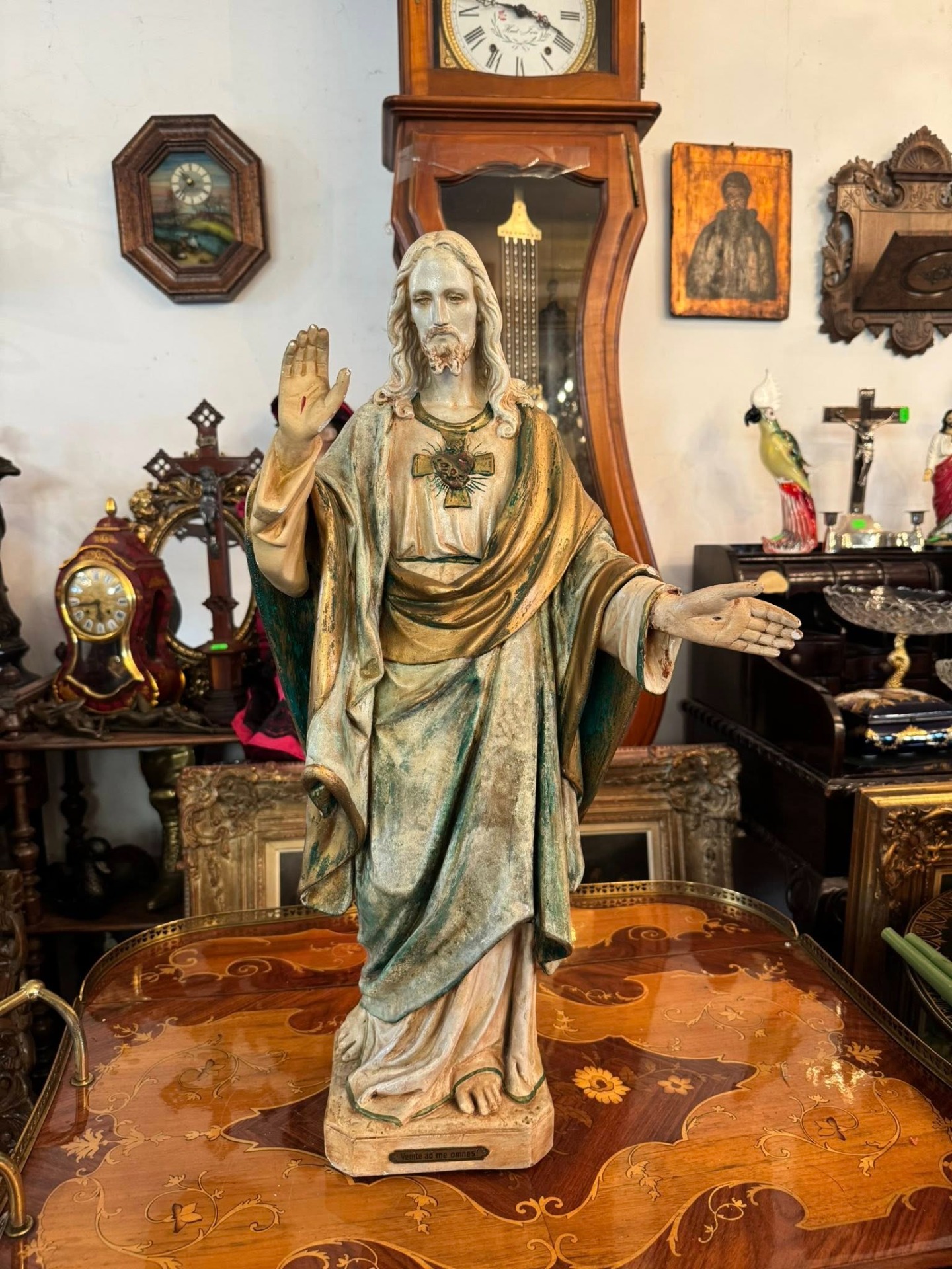 Pe baza statuetei se află o plăcuță metalică cu citatul latin: „Venite ad me omnes!” (Veniți la mine toți!), un îndemn biblic la consolare și credință. (cca 1920, Franța)