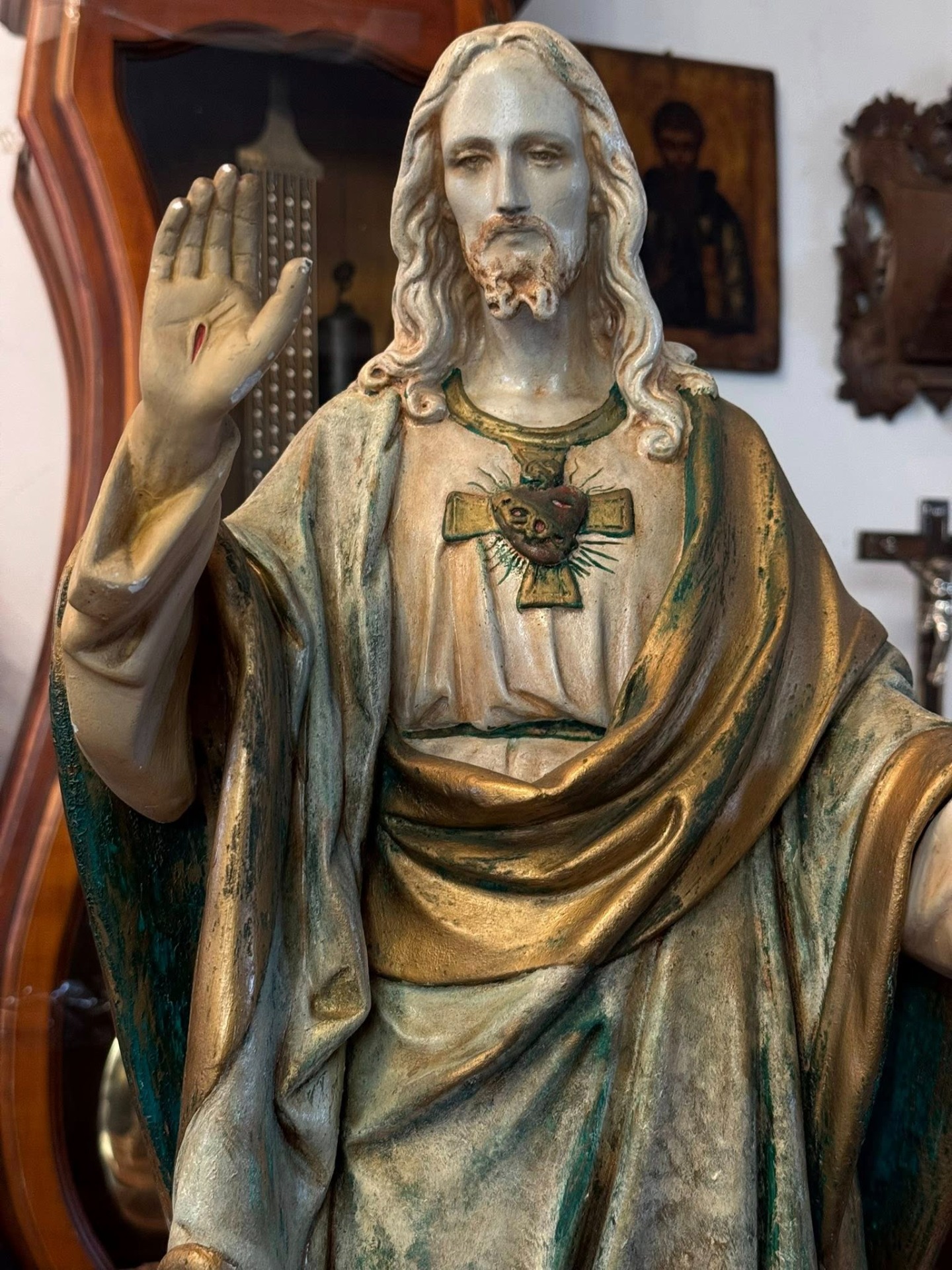 Statuetă religioasă realizată din ipsos polierom, pictat manual. Isus este înfățișat într-o postură binevoitoare, cu brațele deschise într-un gest de primire și binecuvântare.