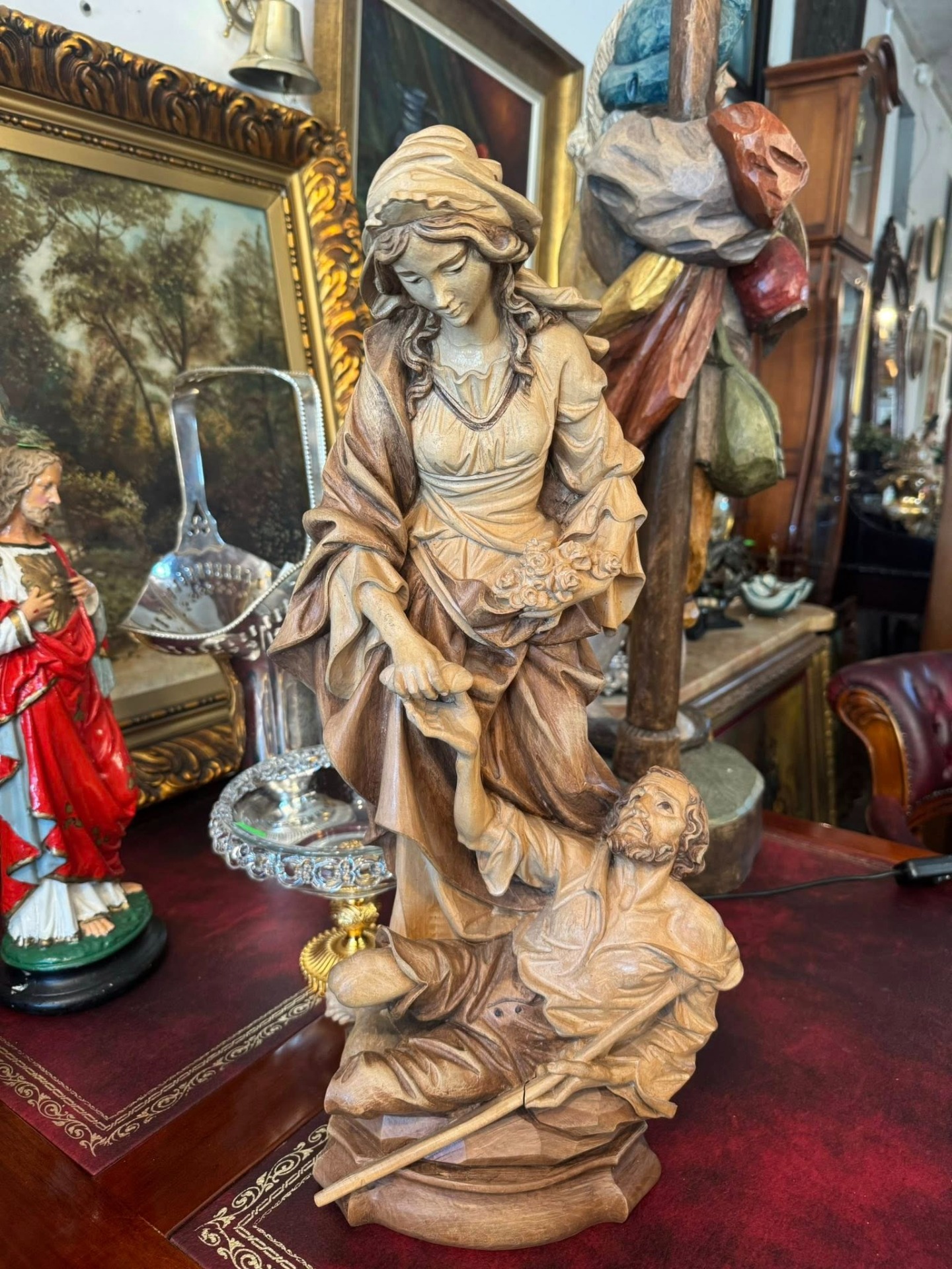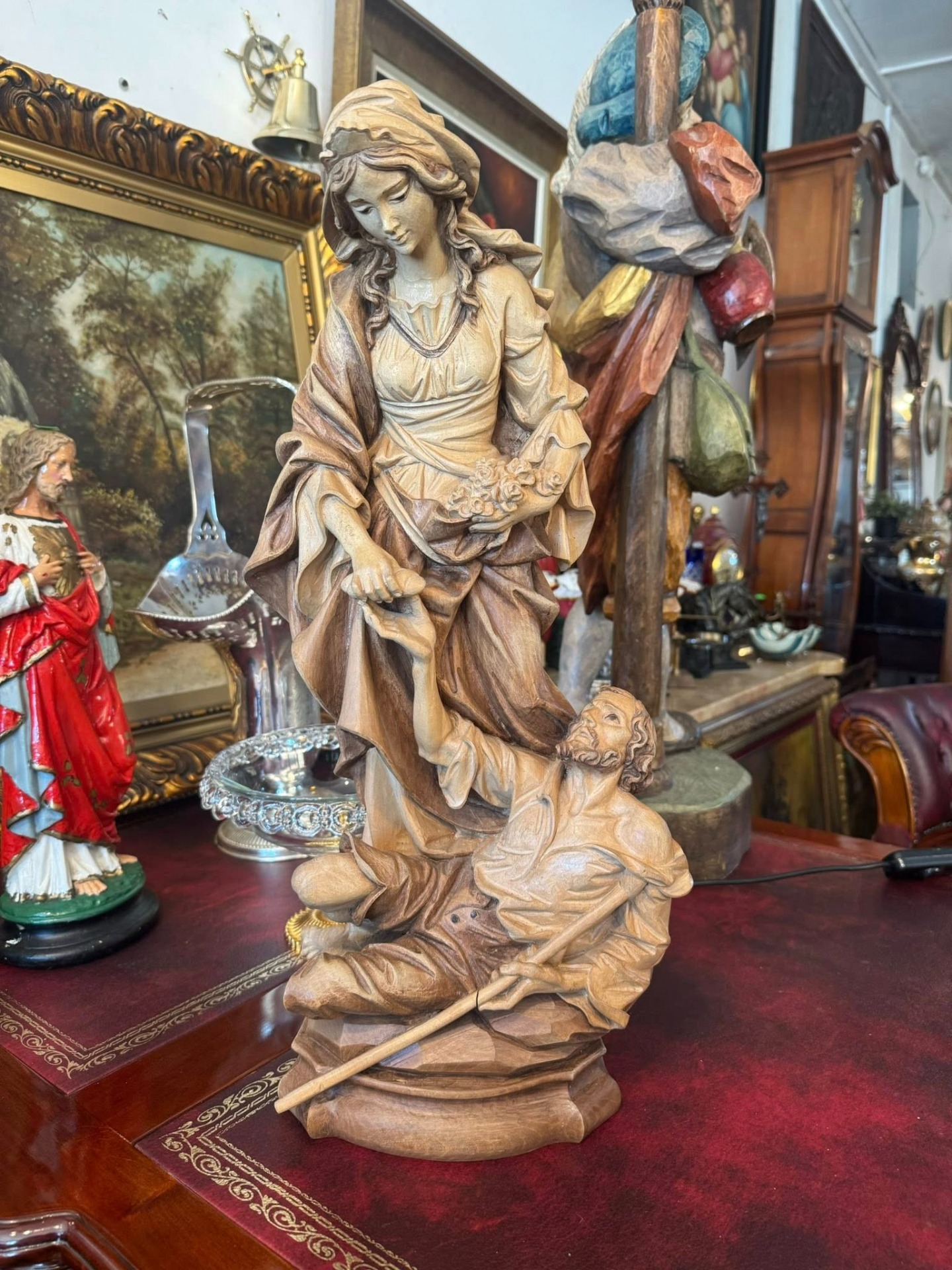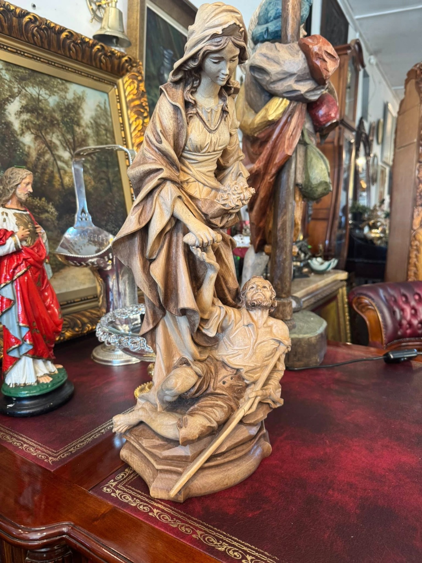 Statuetă sculptată în lemn, înfățișând o scenă de caritate sau ajutor divin. Finisajul este unul natural, în nuanțe de cafeniu și ocru, evidențiind detaliile prin umbre și texturi mate.(Italia, cca 1970)