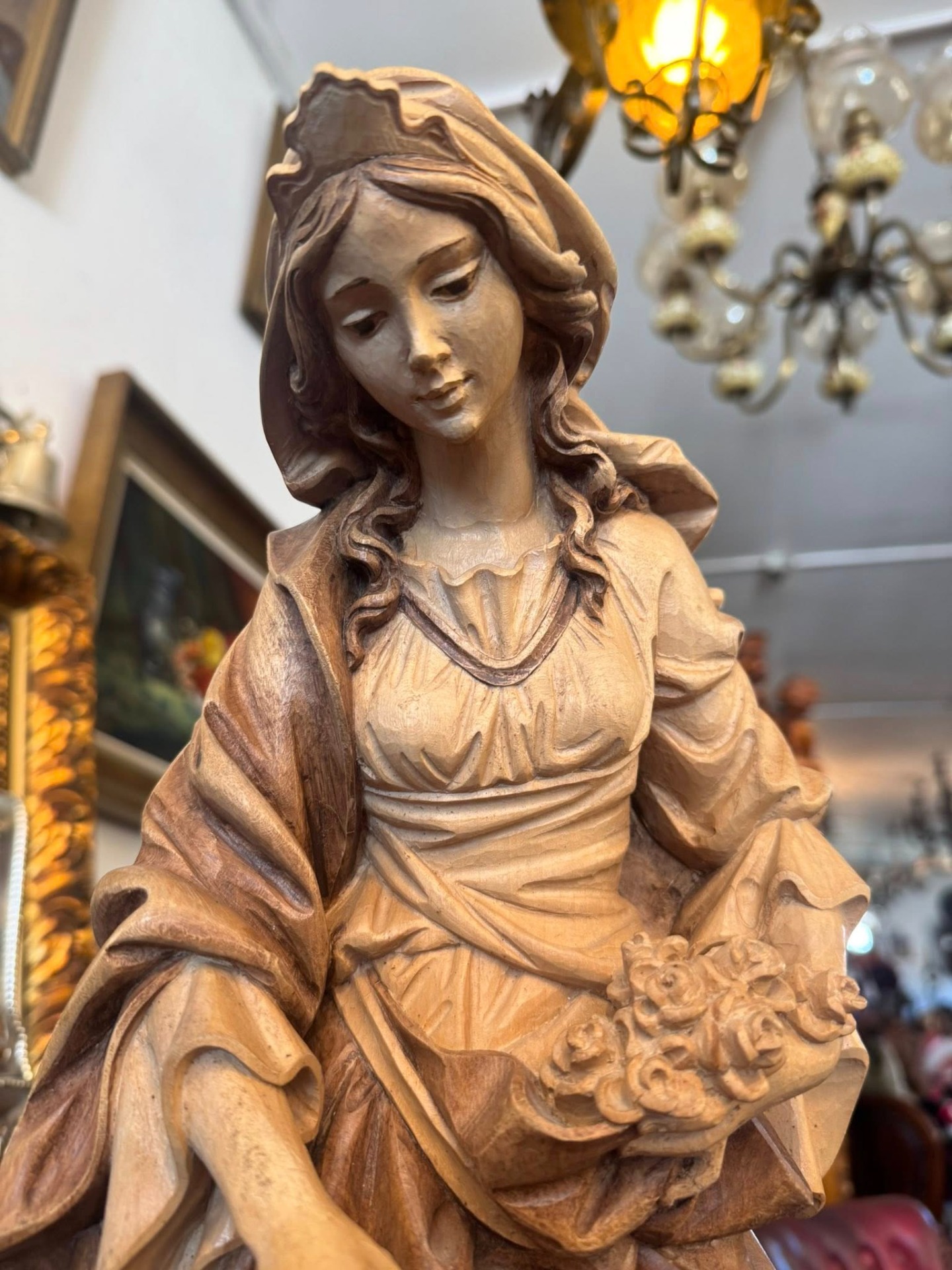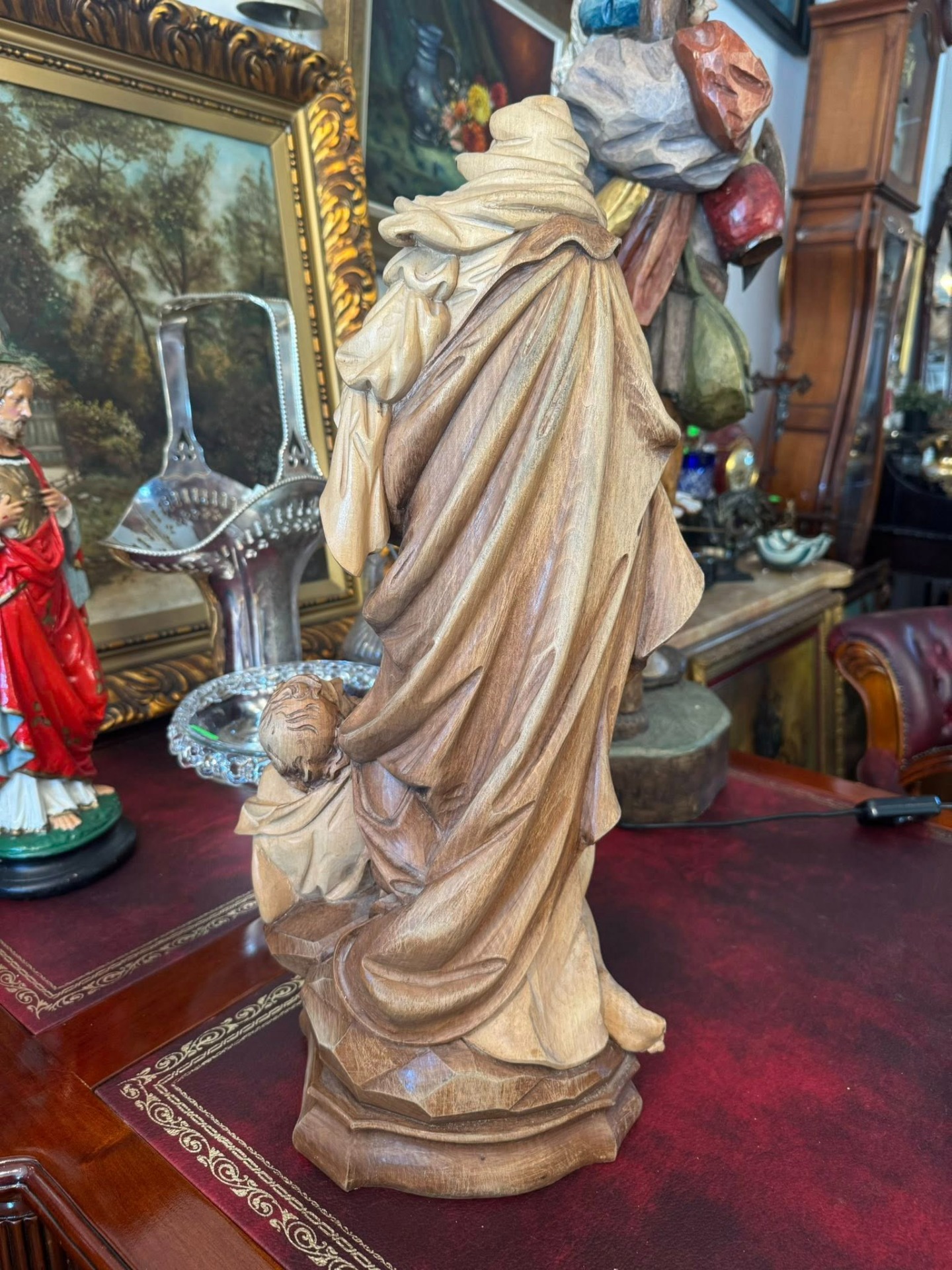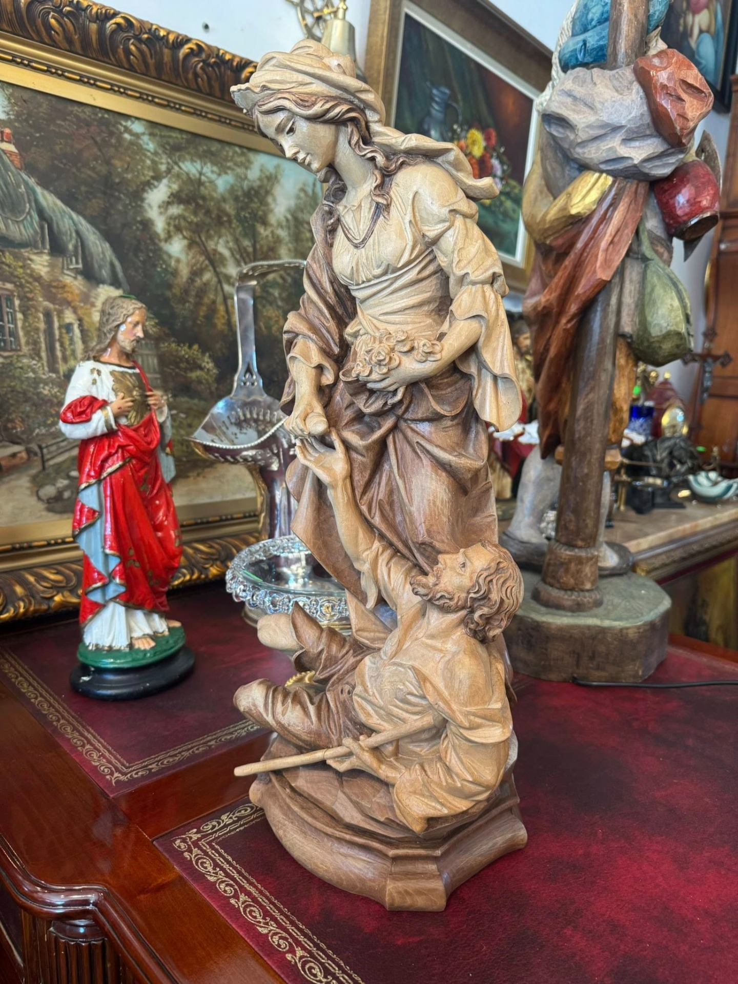 Statuetă sculptată în lemn, înfățișând o scenă de caritate sau ajutor divin. Finisajul este unul natural, în nuanțe de cafeniu și ocru, evidențiind detaliile prin umbre și texturi mate.(Italia, cca 1970)