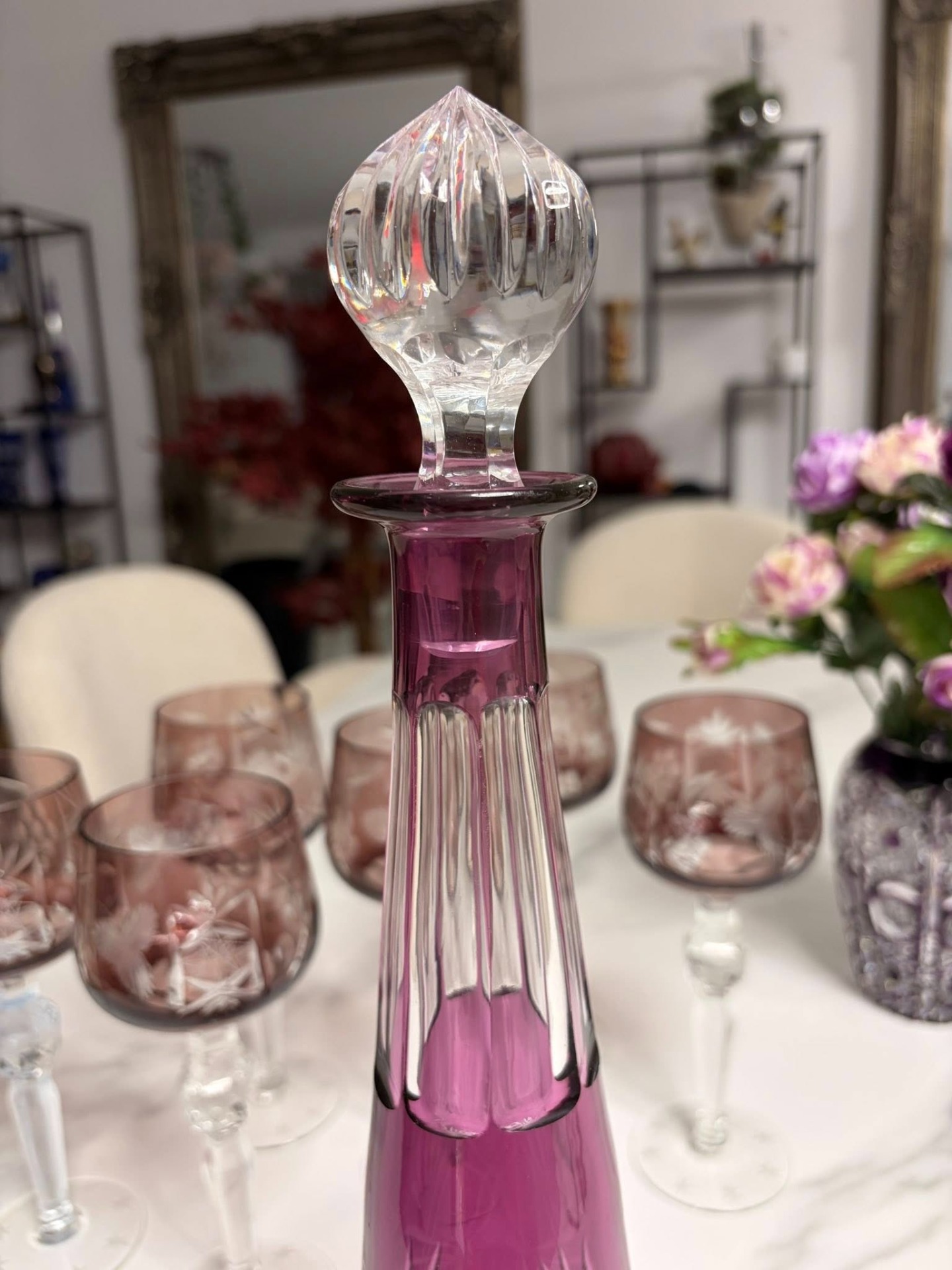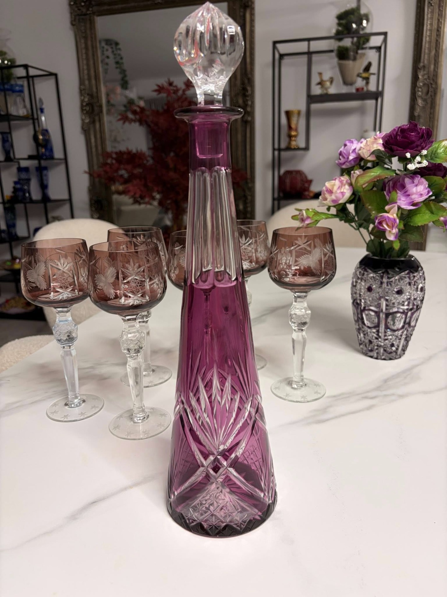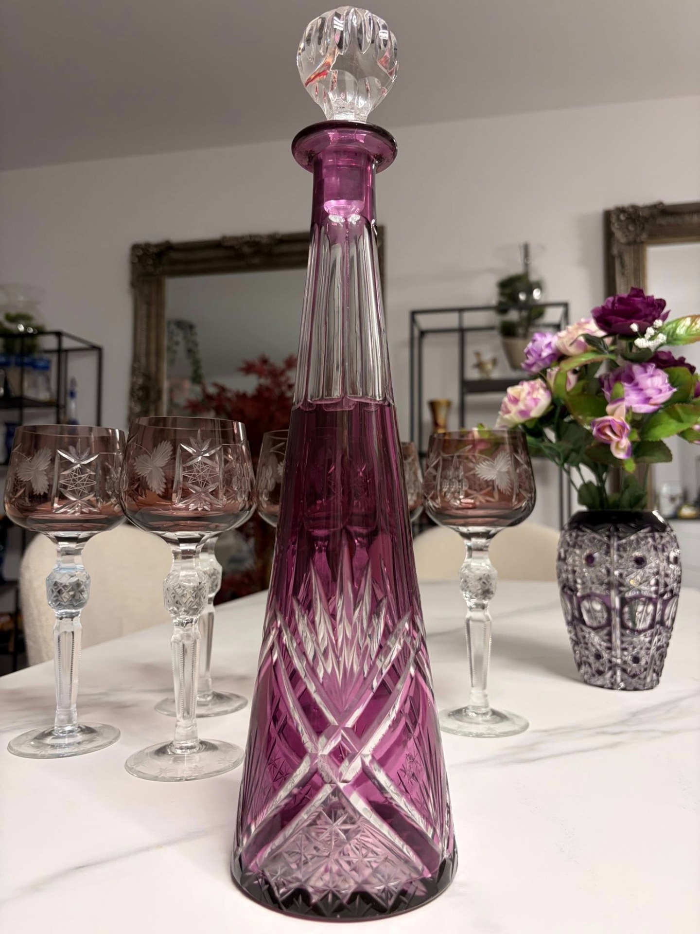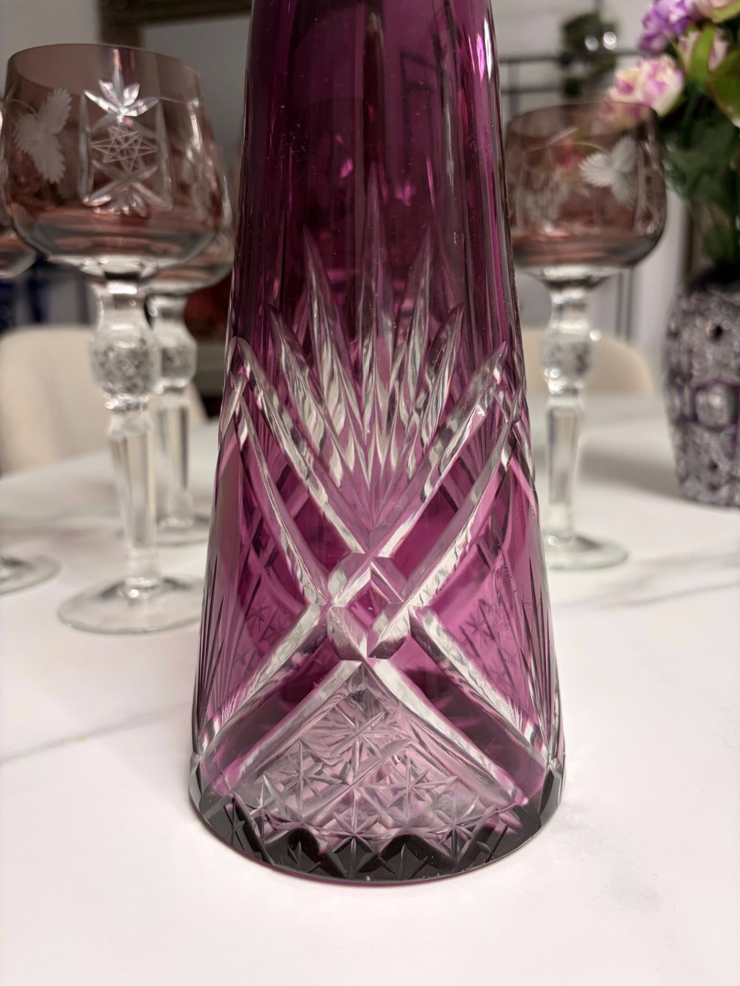 Sticlă elegantă din cristal masiv, de culoare mov–roz fumuriu, cu tăieturi manuale fine și motive geometrice clasice. Designul alungit, cu dop din cristal fațetat, oferă un aspect rafinat și echilibrat, ideal pentru servire sau decor.