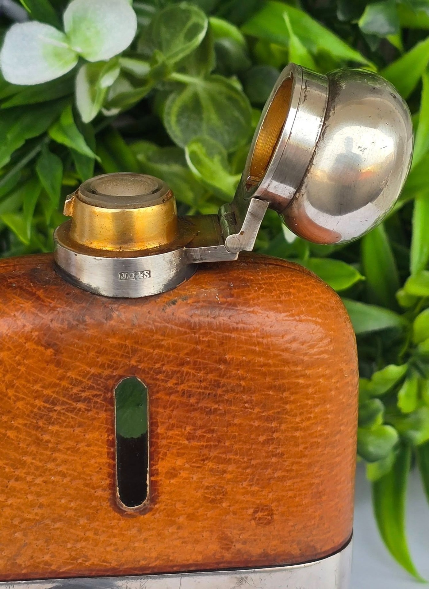 Sticlă de buzunar "hip flask" victoriană, rară, de colecție, din metal argintat și piele, manufactură a renumitului atelier englez "James Dixon & Sons", în