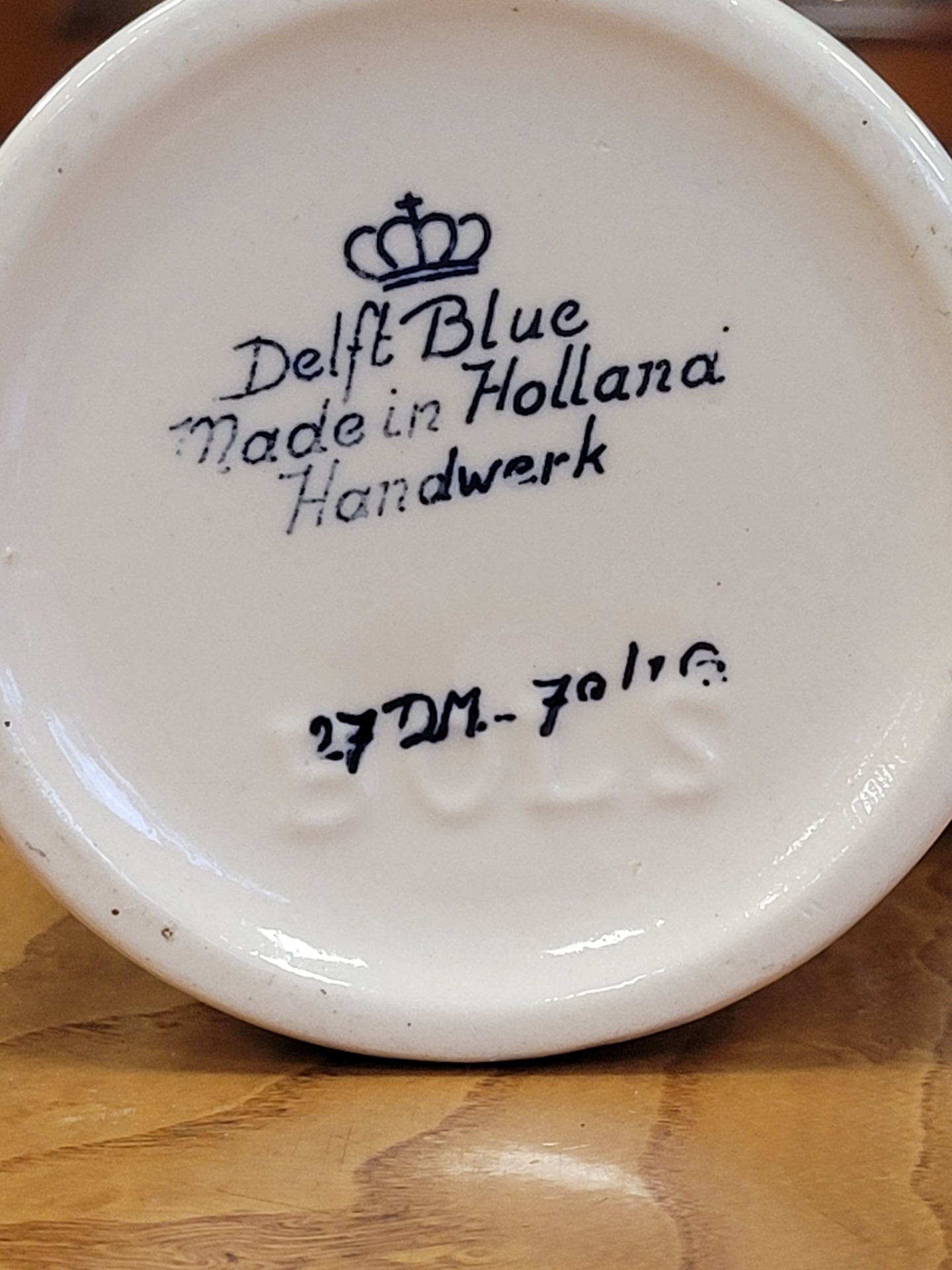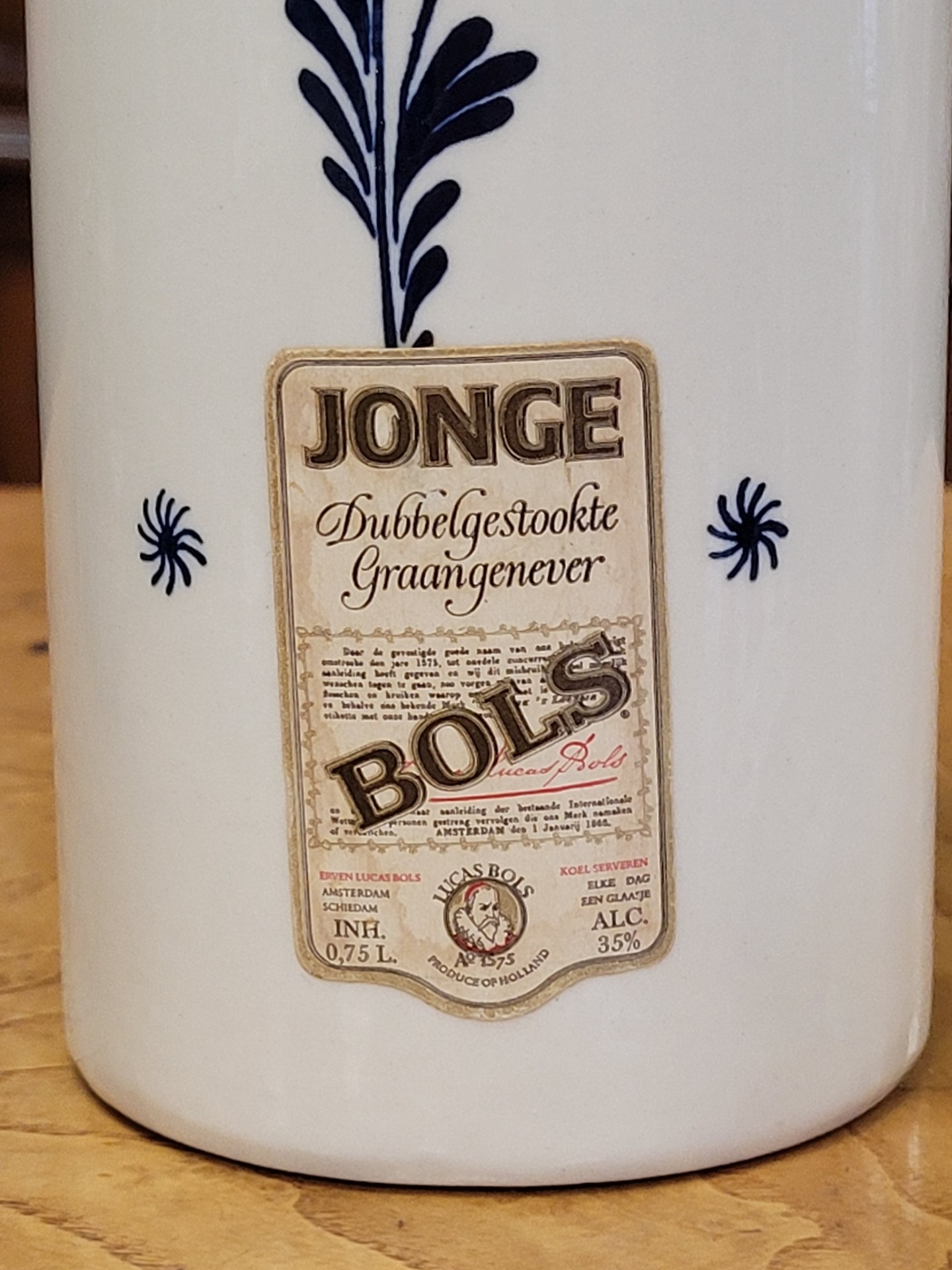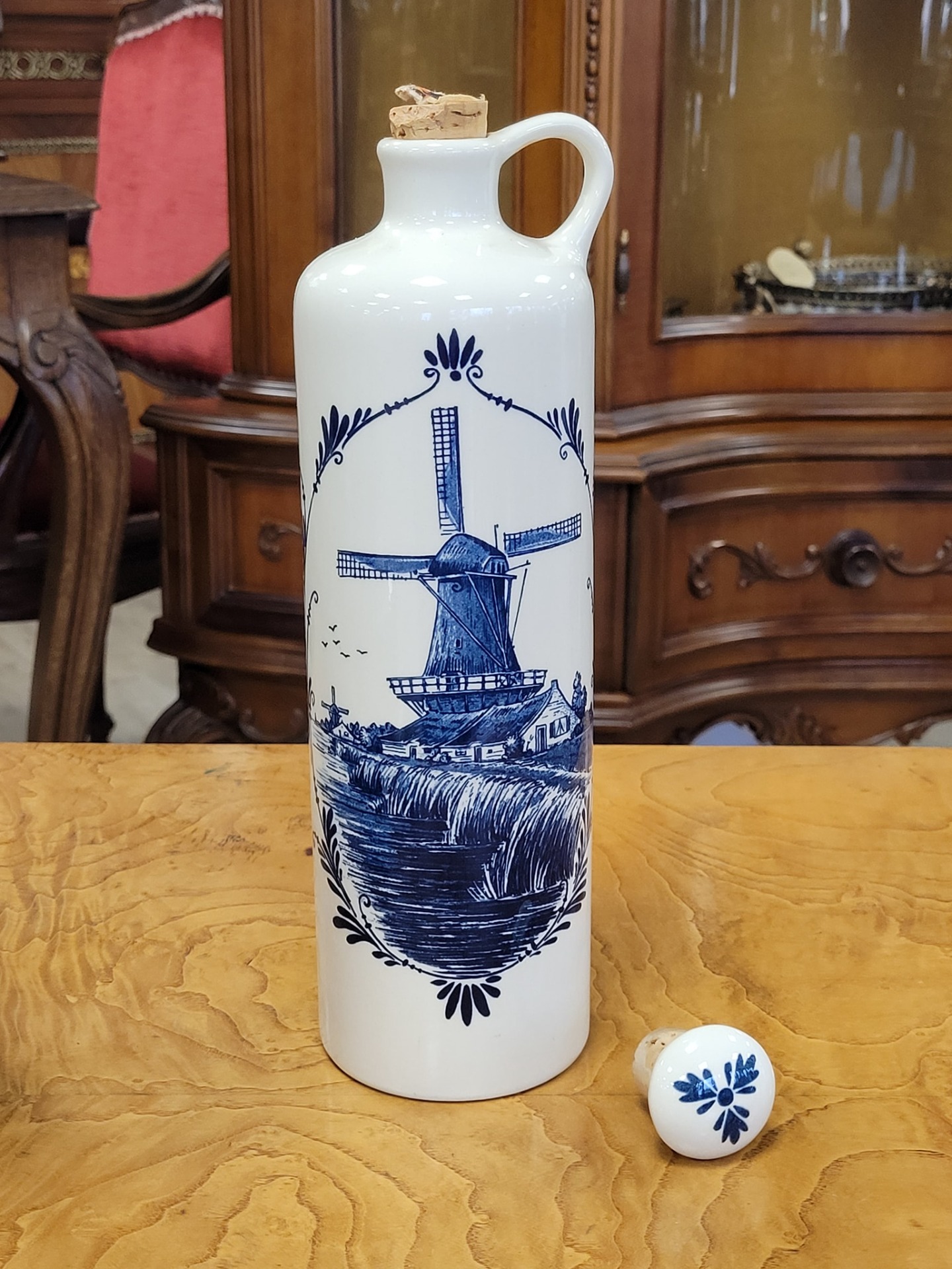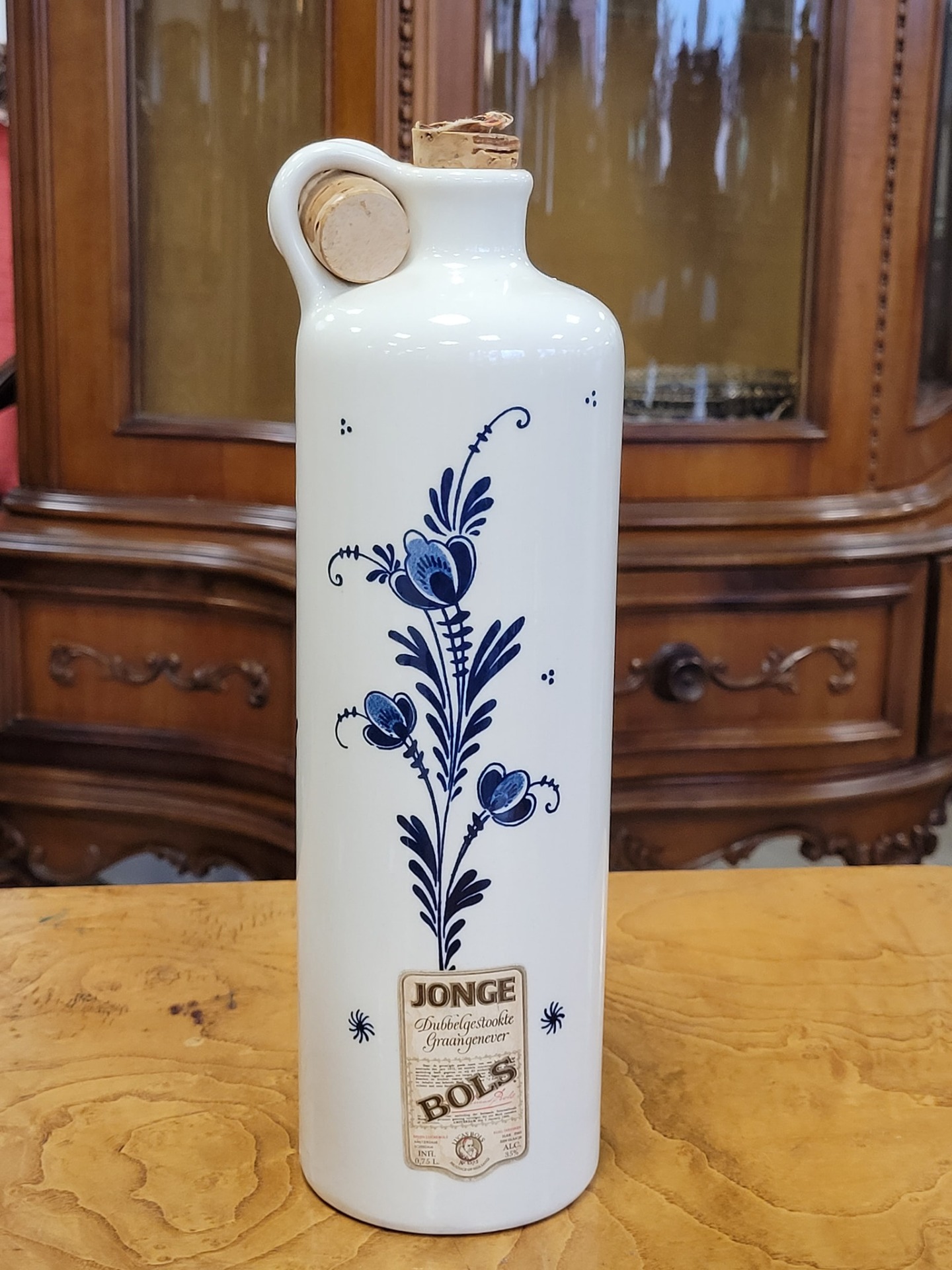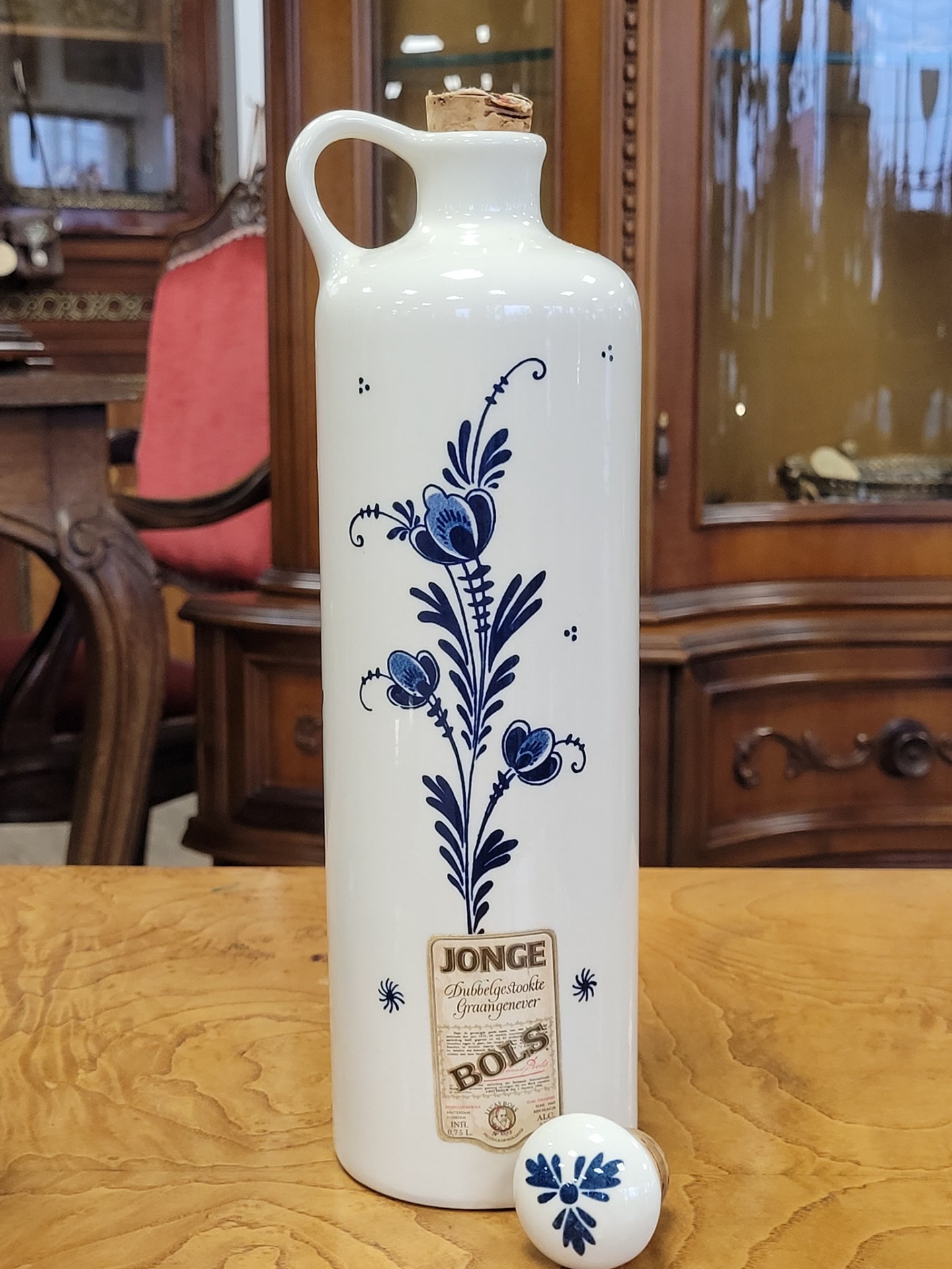 Sticlă de colecție BOLS, din ceramică autentică Delft Blue pictată manual în stil tradițional olandez, piesă decorativă deosebită, ideală pentru colecționari sau pentru un bar amenajat în stil clasic/vintage.