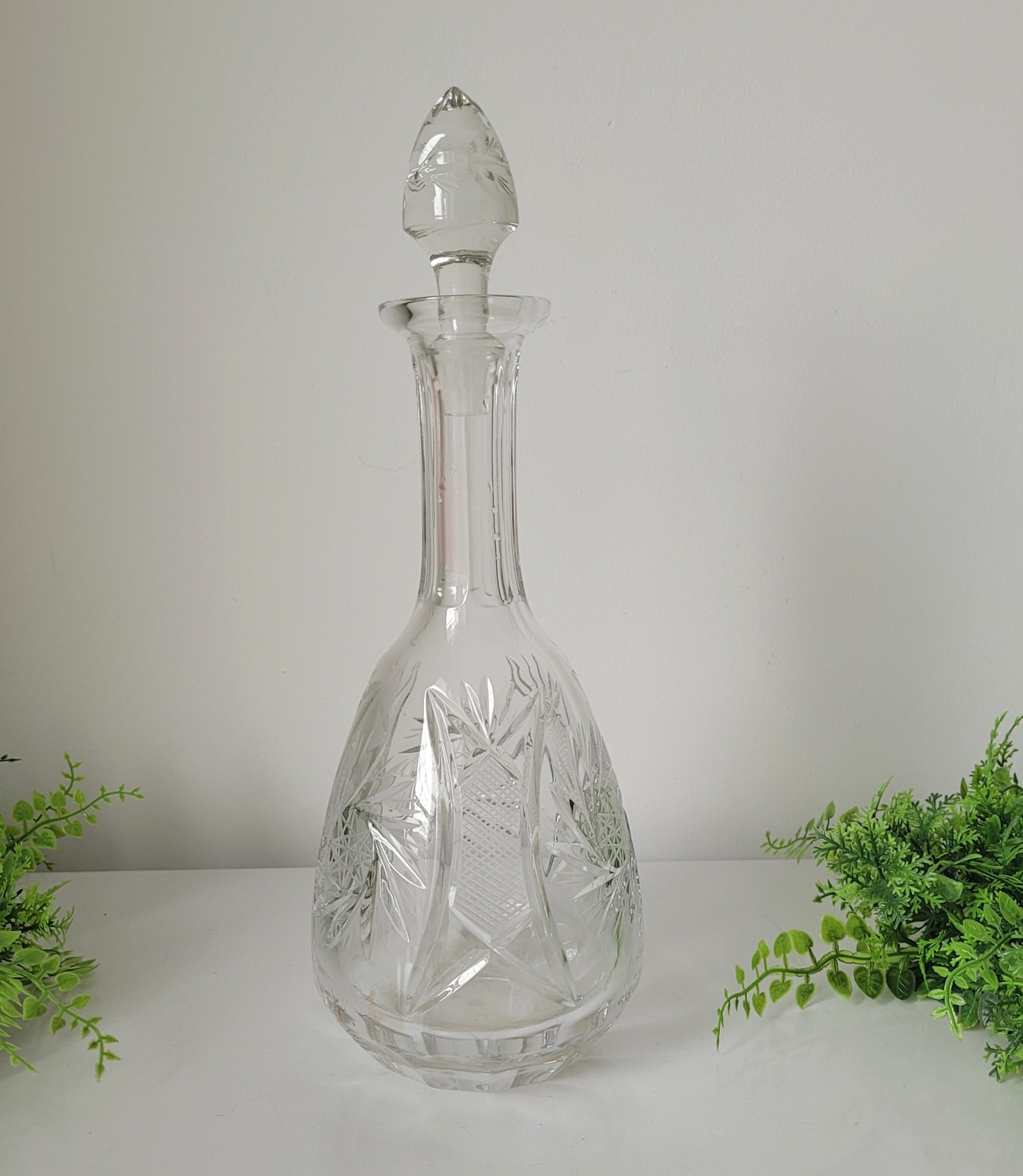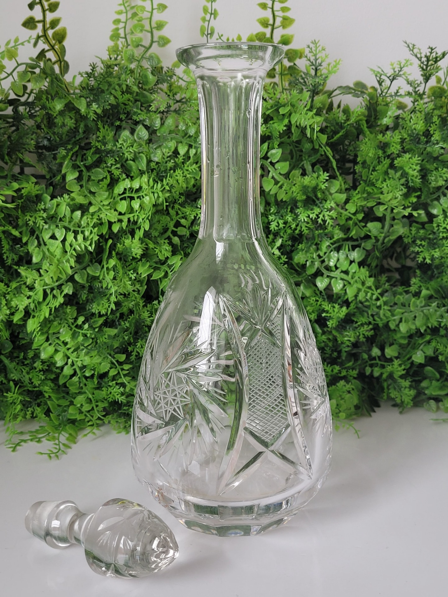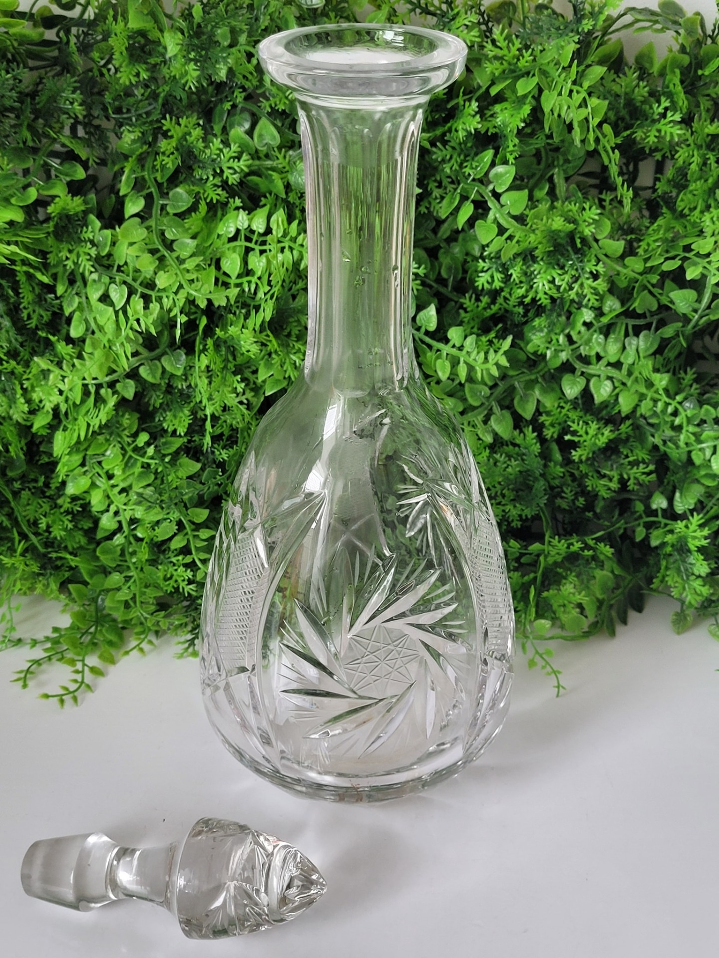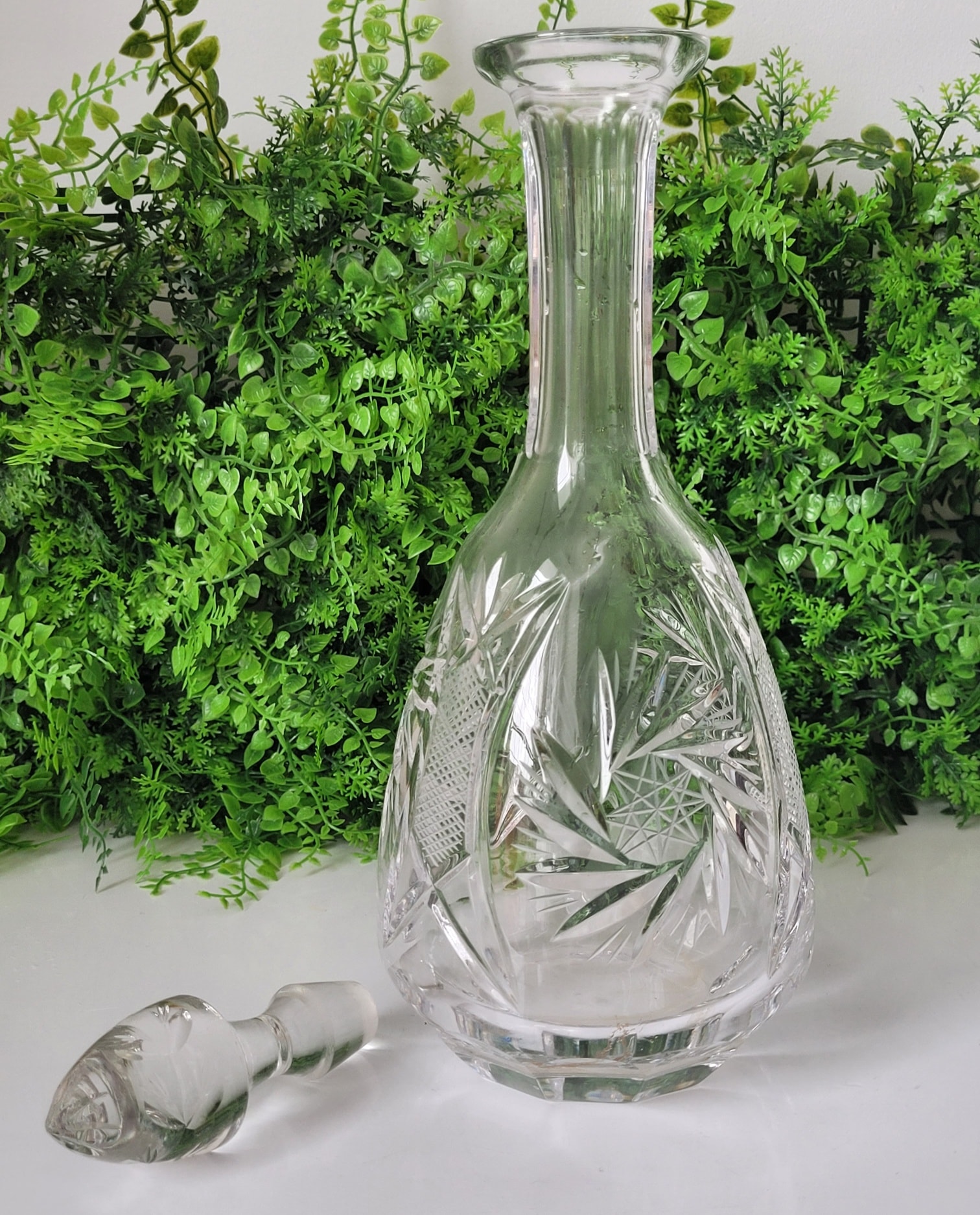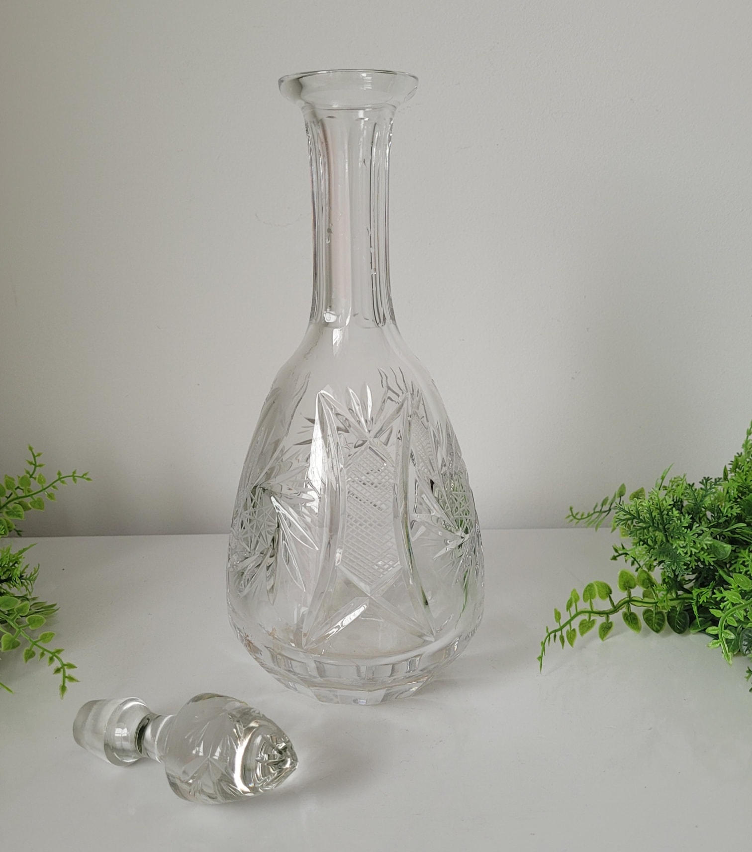 Sticlă elegantă din cristal masiv, decorată cu tăieturi manuale clasice, cu dop din cristal, piesă deosebită, ideală atât pentru servirea băuturilor fine (vin,